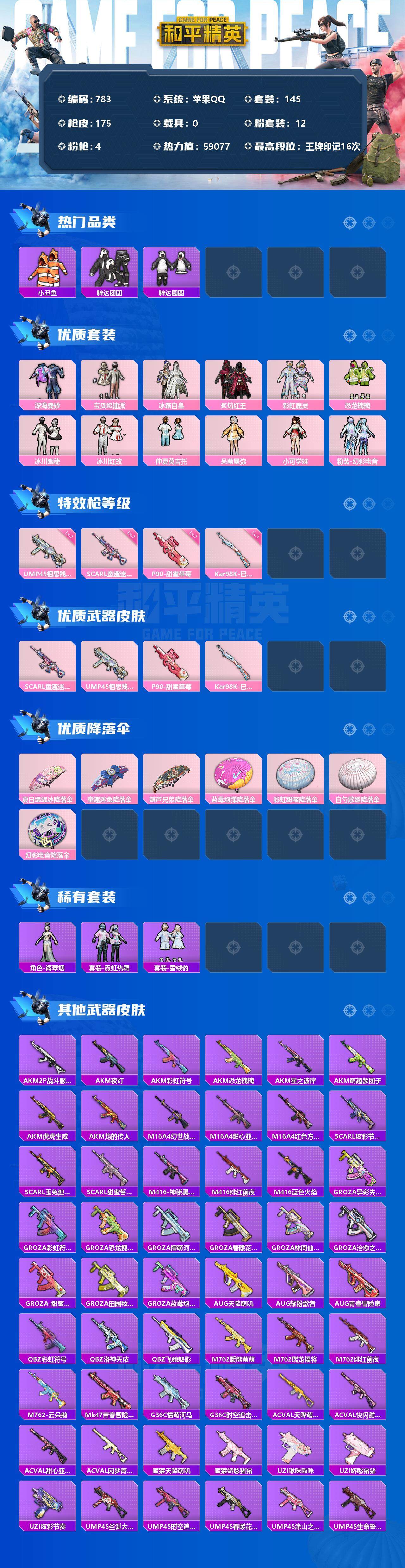 [12351629]【商品标题】:苹果 手Q-12粉装-4特效枪-0载具-0粉色飞行器-59077热力值-16王牌印记-145套装-175枪皮 【热门品类】:套装-小丑鱼,套装-胖达团团,套装-胖达圆圆,套装-龟仙人,套装-潮萌小黄鸭,套装-暗影哥特,套装-粉红小猪 【粉色套装】:粉装-深海曼妙,粉装-宝贝奶油派,粉装-冰霜白皇,粉装-炙焰红王,粉装-彩虹鹿灵,粉装-恐龙拽拽,粉装-冰川幽秘,粉装-冰川红玫,粉装-仲夏莫吉托,角色-呆萌星弥,角色-小可学妹,粉装-幻彩电音 【粉色枪皮等级】:SCAR-L-童趣迷兔(七级),UMP45-相思残雪(七级),P90-甜蜜草莓(七级),Kar98K-巳巳如意(一级) 【粉色枪皮】:SCAR-L-童趣迷兔,UMP45-相思残雪,P90-甜蜜草莓,Kar98K-巳巳如意 【粉色降落伞】:夏日绵绵冰降落伞,童趣迷兔降落伞,葫芦兄弟降落伞,蓝莓炮弹降落伞,彩虹甜喵降落伞,白勺歌姬降落伞,幻彩电音降落伞 【稀有套装】:套装-龟仙人,角色-海琴烟,套装-霓虹热舞,套装-雪绒豹 【稀有枪皮】:AKM-2P战斗服款,AKM-夜灯,AKM-彩虹符号,AKM-恐龙拽拽,AKM-星之彼岸,AKM-萌趣颜团子,AKM-虎虎生威,AKM-龙的传人,M16A4-幻世战舞者,M16A4-甜心亚梦,M16A4-红色方程式,SCAR-L-炫彩节奏,SCAR-L-玉兔迎春,SCAR-L-甜蜜誓约,M416-神秘黑猫,M416-绯红前夜,M416-蓝色火焰,GROZA-异彩先驱,GROZA-彩虹符号,GROZA-恐龙拽拽,GROZA-懵萌河马,GROZA-春暖花开,GROZA-林间仙鹿,GROZA-治愈之星,GROZA-甜蜜草莓,GROZA-田园牧歌,GROZA-蓝莓炮弹,AUG-天降萌叽,AUG-耀粉歌者,AUG-青春冒险家,QBZ-彩虹符号,QBZ-洛神天依,QBZ-飞驰魅影,M762-暖熊萌萌,M762-瑞龙福将,M762-绯红前夜,M762-云朵鹅,Mk47-青春冒险家,G36C-懵萌河马,G36C-时空追击者,AC-VAL-天降萌叽,AC-VAL-快闪甜心,AC-VAL-甜心亚梦,AC-VAL-闲梦青缨,蜜獾-天降萌叽,蜜獾-娇憨猪猪,UZI-啾咪啾咪,UZI-娇憨猪猪,UZI-炫彩节奏,UMP45-圣诞大吉,UMP45-时空追击者,UMP45-春暖花开,UMP45-涂