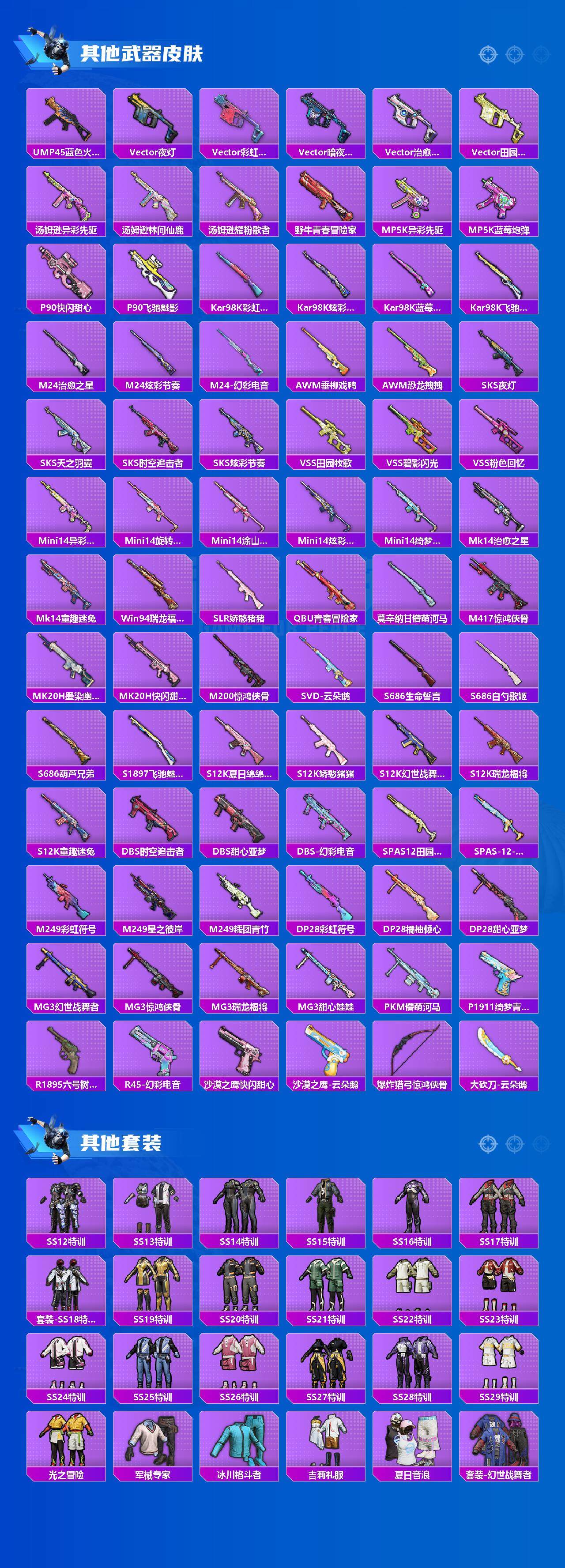 【稀有枪皮】:AKM-2P战斗服款,AKM-夜灯,AKM-彩虹符号,AKM-恐龙拽拽,AKM-星之彼岸,AKM-萌趣颜团子,AKM-虎虎生威,AKM-龙的传人,M16A4-幻世战舞者,M16A4-甜心亚梦,M16A4-红色方程式,SCAR-L-炫彩节奏,SCAR-L-玉兔迎春,SCAR-L-甜蜜誓约,M416-神秘黑猫,M416-绯红前夜,M416-蓝色火焰,GROZA-异彩先驱,GROZA-彩虹符号,GROZA-恐龙拽拽,GROZA-懵萌河马,GROZA-春暖花开,GROZA-林间仙鹿,GROZA-治愈之星,GROZA-甜蜜草莓,GROZA-田园牧歌,GROZA-蓝莓炮弹,AUG-天降萌叽,AUG-耀粉歌者,AUG-青春冒险家,QBZ-彩虹符号,QBZ-洛神天依,QBZ-飞驰魅影,M762-暖熊萌萌,M762-瑞龙福将,M762-绯红前夜,M762-云朵鹅,Mk47-青春冒险家,G36C-懵萌河马,G36C-时空追击者,AC-VAL-天降萌叽,AC-VAL-快闪甜心,AC-VAL-甜心亚梦,AC-VAL-闲梦青缨,蜜獾-天降萌叽,蜜獾-娇憨猪猪,UZI-啾咪啾咪,UZI-娇憨猪猪,UZI-炫彩节奏,UMP45-圣诞大吉,UMP45-时空追击者,UMP45-春暖花开,UMP45-涂