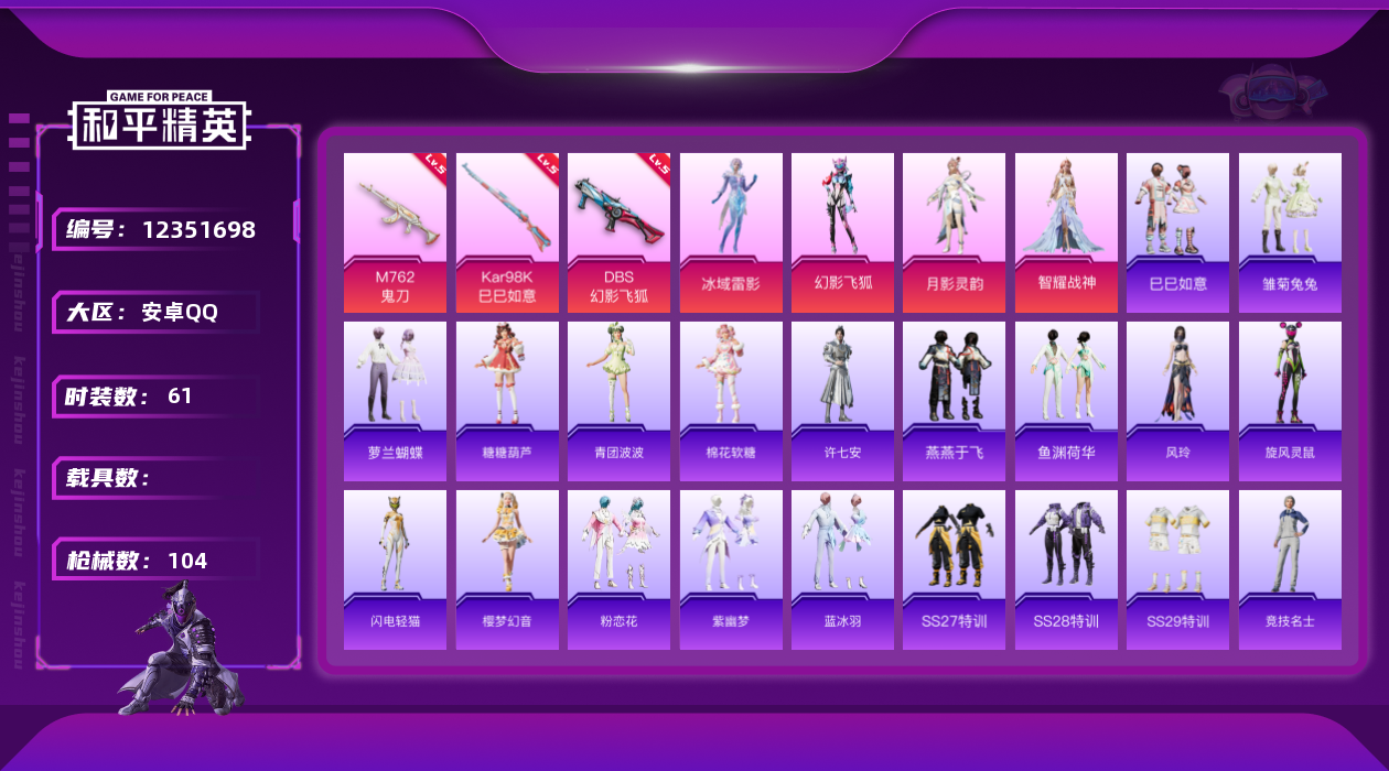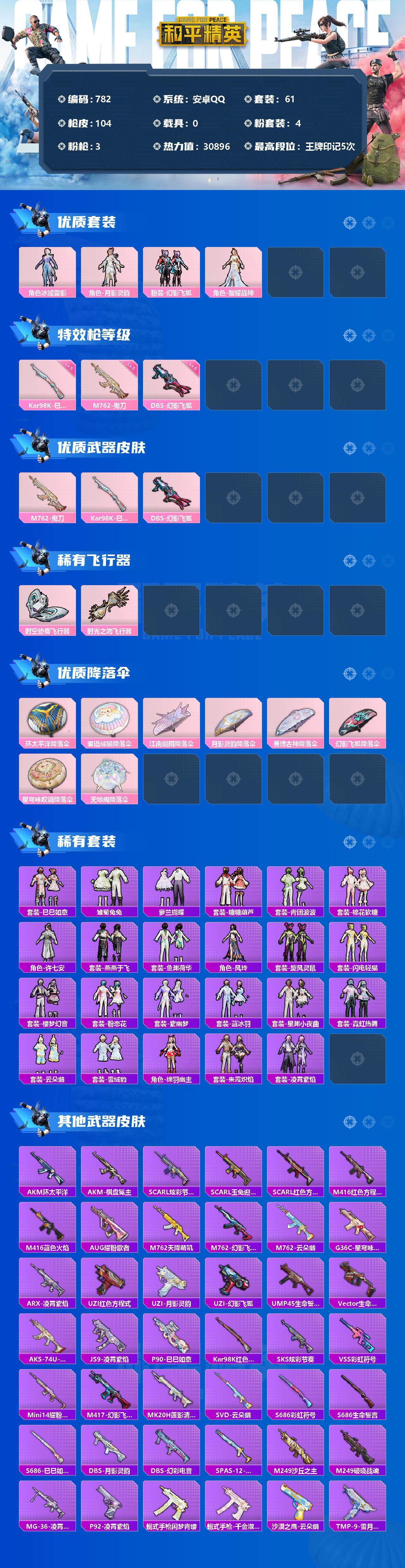 [12351698]【商品标题】:安卓 手Q-4粉装-3特效枪-0载具-2粉色飞行器-30896热力值-5王牌印记-61套装-104枪皮 【粉色套装】:角色-冰域雷影,角色-月影灵韵,粉装-幻影飞狐,角色-智耀战神 【粉色枪皮等级】:M762-鬼刀(五级),Kar98K-巳巳如意(五级),DBS-幻影飞狐(五级) 【粉色枪皮】:M762-鬼刀,Kar98K-巳巳如意,DBS-幻影飞狐 【粉色飞行器】:时空协奏飞行器,时光之吻飞行器 【粉色降落伞】:环太平洋降落伞,蜜语绒猫降落伞,江南烟雨降落伞,月影灵韵降落伞,赛博古神降落伞,幻影飞狐降落伞,星穹咏叹调降落伞,无垠阁降落伞 【稀有套装】:套装-巳巳如意,套装-雏菊兔兔,套装-萝兰蝴蝶,套装-糖糖葫芦,套装-青团波波,套装-棉花软糖,角色-许七安,套装-燕燕于飞,套装-鱼渊荷华,角色-风玲,套装-旋风灵鼠,套装-闪电轻猫,套装-樱梦幻音,套装-粉恋花,套装-紫幽梦,套装-蓝冰羽,套装-星渊小夜曲,套装-霓虹热舞,套装-云朵鹅,套装-雪绒豹,角色-绛羽幽主,套装-朱霞炽焰,套装-凌霄紫焰 【稀有枪皮】:AKM-环太平洋,AKM-棋盘冕主,SCAR-L-炫彩节奏,SCAR-L-玉兔迎春,SCAR-L-红色方程式,M416-红色方程式,M416-蓝色火焰,AUG-耀粉歌者,M762-天降萌叽,M762-云朵鹅,M762-幻影飞狐,G36C-星穹咏叹调,ARX-凌霄紫焰,UZI-红色方程式,UZI-幻影飞狐,UZI-月影灵韵,UMP45-生命誓言,Vector-生命誓言,AKS-74U-鬼刀,JS9-凌霄紫焰,P90-巳巳如意,Kar98K-红色方程式,SKS-炫彩节奏,VSS-彩虹符号,Mini14-耀粉歌者,M417-幻影飞狐,MK20-H-莲影清波,SVD-云朵鹅,S686-彩虹符号,S686-生命誓言,S686-巳巳如意,DBS-幻彩电音,DBS-月影灵韵,SPAS-12-云朵鹅,M249-沙丘之主,M249-破晓战魂,MG-36-凌霄紫焰,P92-凌霄紫焰,蝎式手枪-闲梦青缨,蝎式手枪-千金淑猫,沙漠之鹰-云朵鹅,TMP-9-雪月幻音,大砍刀-云朵鹅,大砍刀-鬼刀,平底锅-绝色倾城,平底锅-凌霄紫焰,破片手榴弹-巳巳如意 【其他套装】:套装-SS27特训,套装-SS28特训,套装-SS29特训,套装-极速红龙,套装-热血青春,套装-破