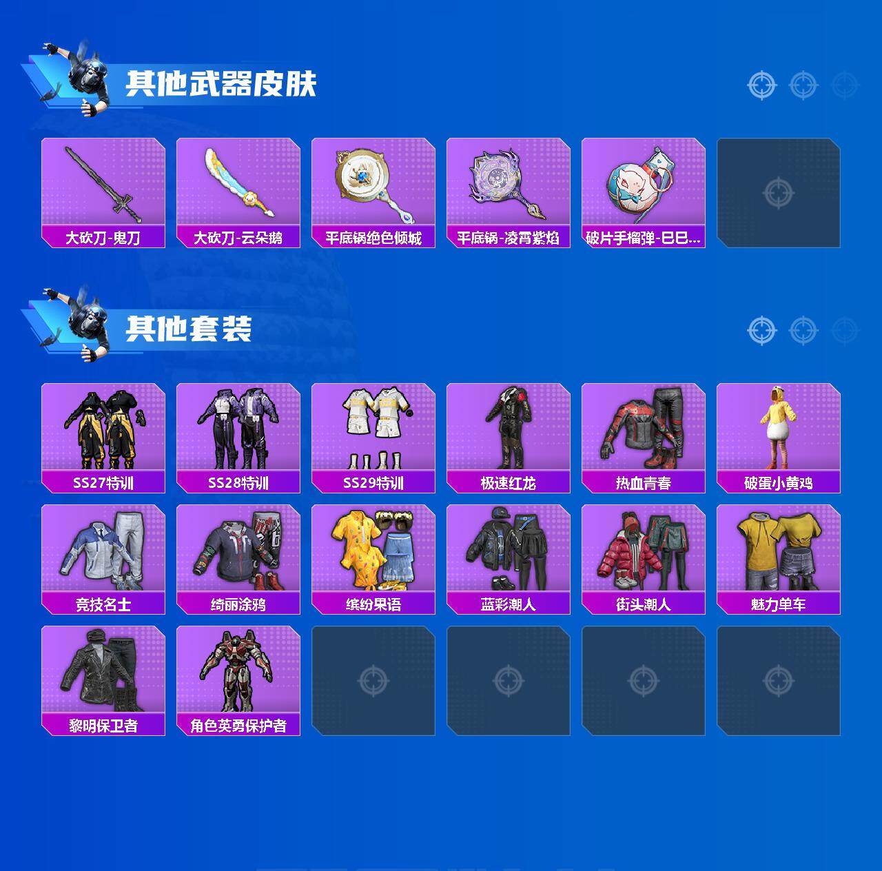 【稀有枪皮】:AKM-环太平洋,AKM-棋盘冕主,SCAR-L-炫彩节奏,SCAR-L-玉兔迎春,SCAR-L-红色方程式,M416-红色方程式,M416-蓝色火焰,AUG-耀粉歌者,M762-天降萌叽,M762-云朵鹅,M762-幻影飞狐,G36C-星穹咏叹调,ARX-凌霄紫焰,UZI-红色方程式,UZI-幻影飞狐,UZI-月影灵韵,UMP45-生命誓言,Vector-生命誓言,AKS-74U-鬼刀,JS9-凌霄紫焰,P90-巳巳如意,Kar98K-红色方程式,SKS-炫彩节奏,VSS-彩虹符号,Mini14-耀粉歌者,M417-幻影飞狐,MK20-H-莲影清波,SVD-云朵鹅,S686-彩虹符号,S686-生命誓言,S686-巳巳如意,DBS-幻彩电音,DBS-月影灵韵,SPAS-12-云朵鹅,M249-沙丘之主,M249-破晓战魂,MG-36-凌霄紫焰,P92-凌霄紫焰,蝎式手枪-闲梦青缨,蝎式手枪-千金淑猫,沙漠之鹰-云朵鹅,TMP-9-雪月幻音,大砍刀-云朵鹅,大砍刀-鬼刀,平底锅-绝色倾城,平底锅-凌霄紫焰,破片手榴弹-巳巳如意