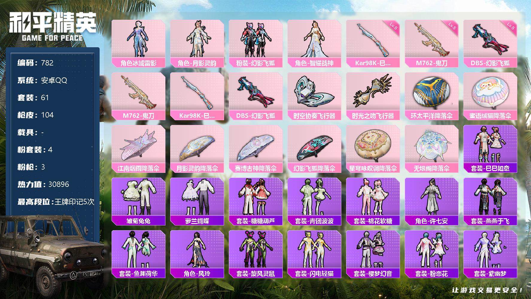 [12351698]【商品标题】:安卓 手Q-4粉装-3特效枪-0载具-2粉色飞行器-30896热力值-5王牌印记-61套装-104枪皮