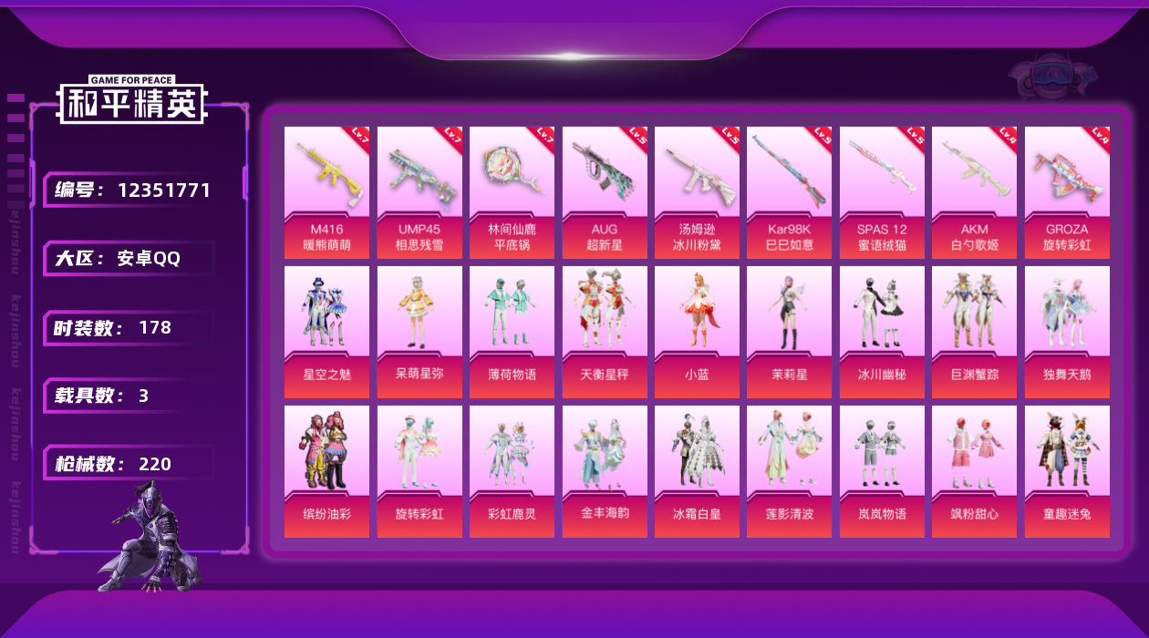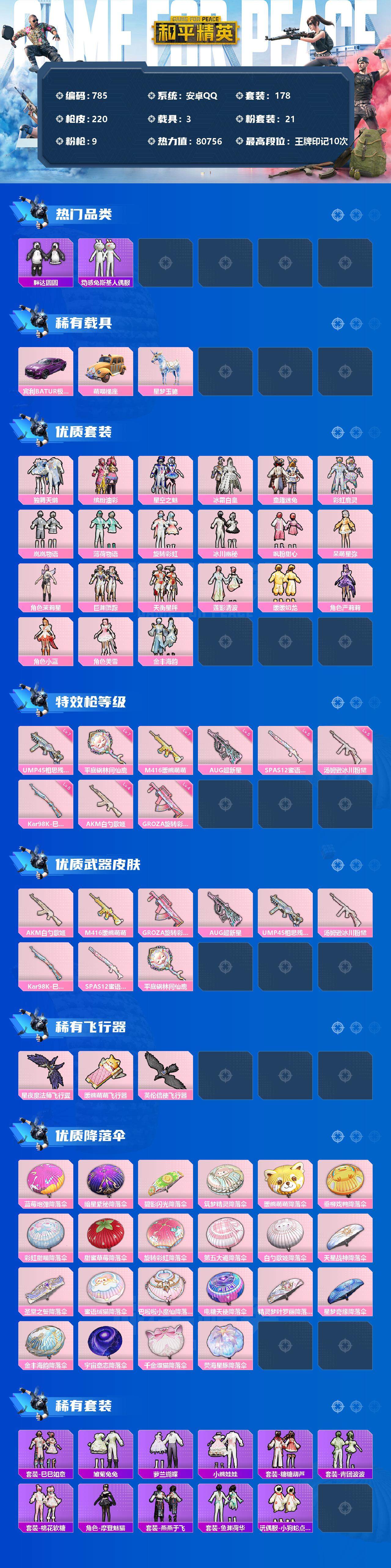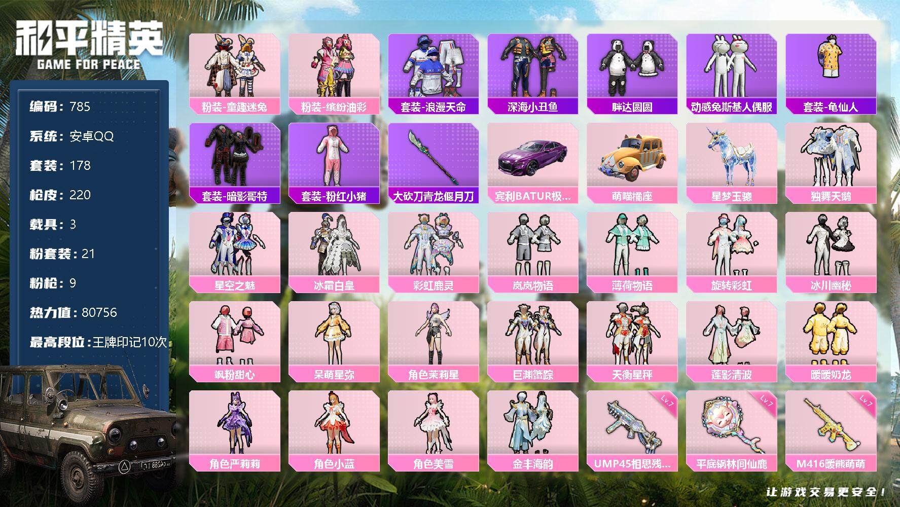 [12351771]【商品标题】:安卓 手Q-21粉装-9特效枪-3载具-5粉色飞行器-80756热力值-10王牌印记-178套装-220枪皮