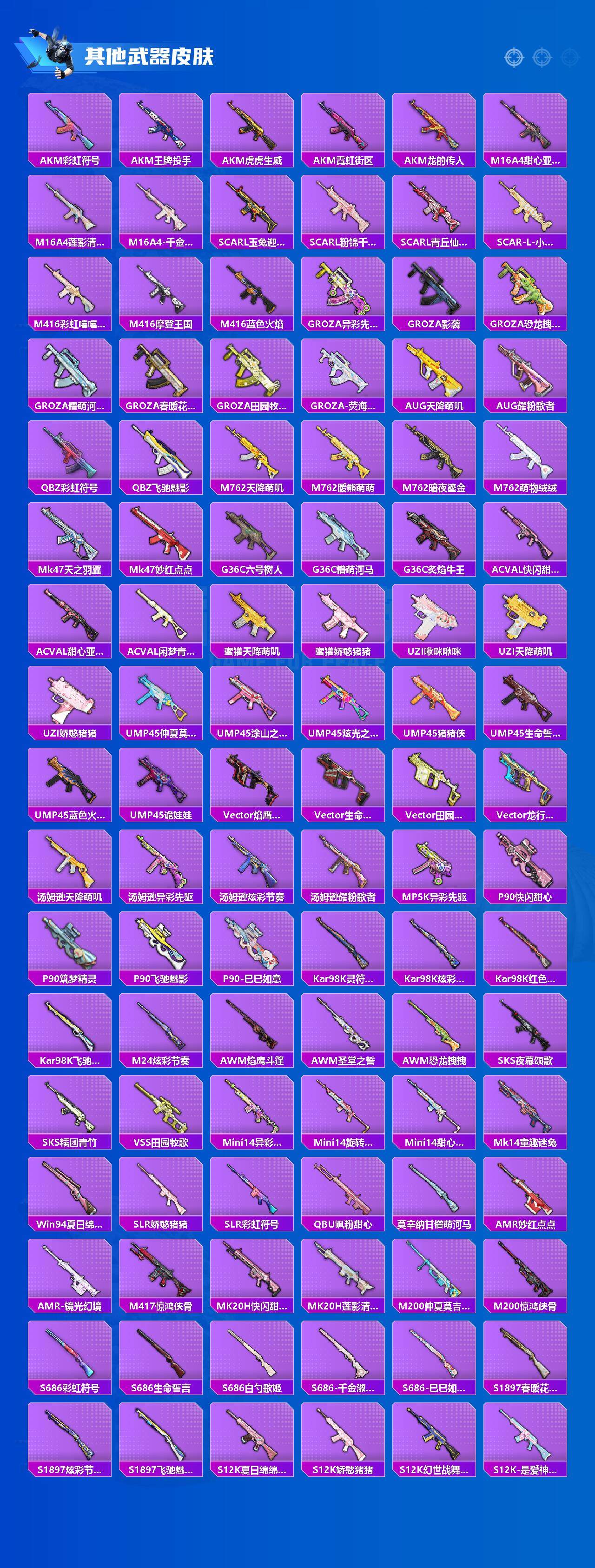 【粉色枪皮】:AKM-白勺歌姬,M416-暖熊萌萌,GROZA-旋转彩虹,AUG-超新星,UMP45-相思残雪,汤姆逊-冰川粉黛,Kar98K-巳巳如意,SPAS-12-蜜语绒猫,平底锅-林间仙鹿