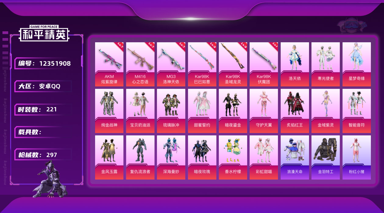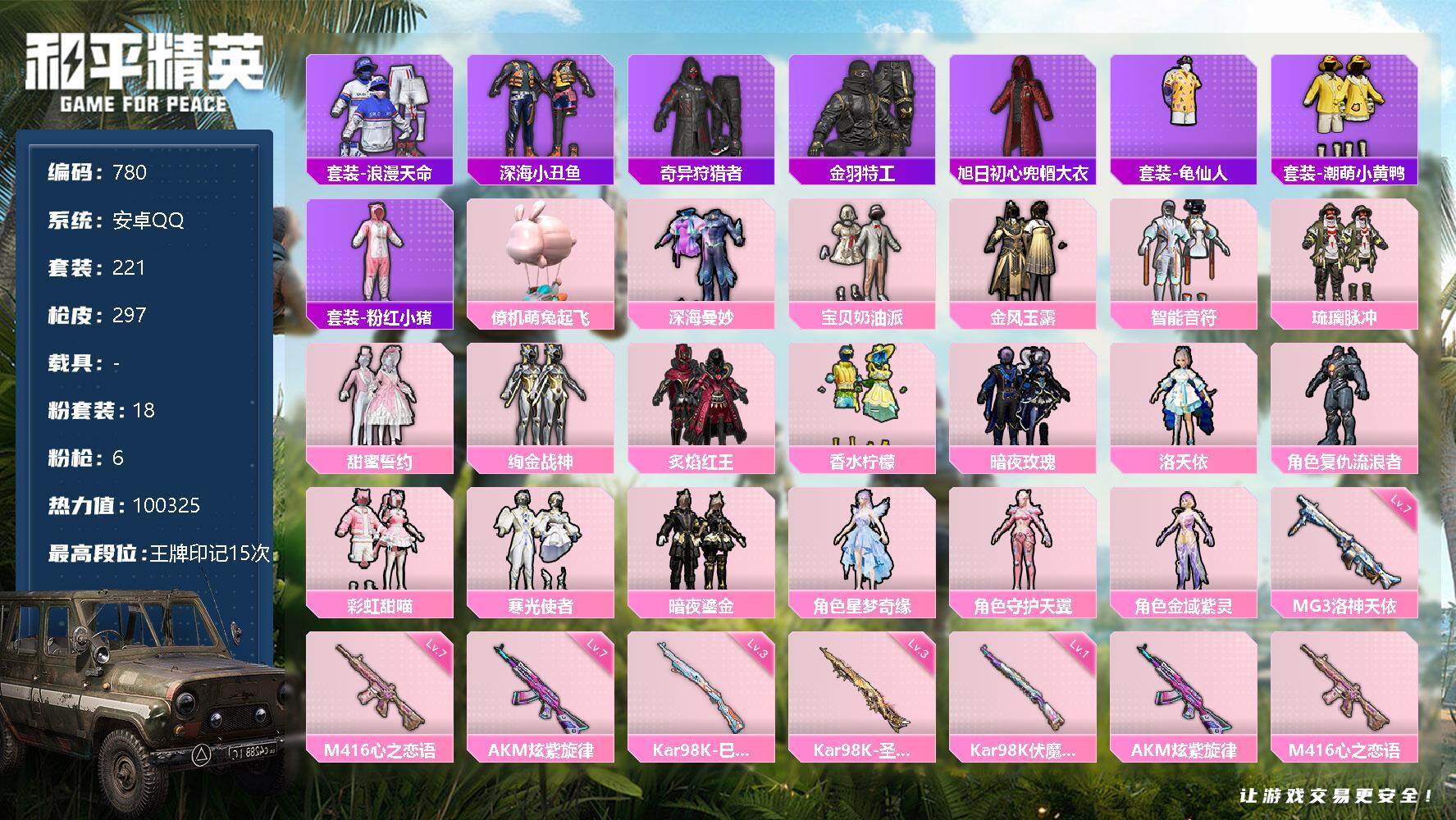[12351908]【商品标题】:安卓 手Q-18粉装-6特效枪-0载具-2粉色飞行器-100325热力值-15王牌印记-221套装-297枪皮