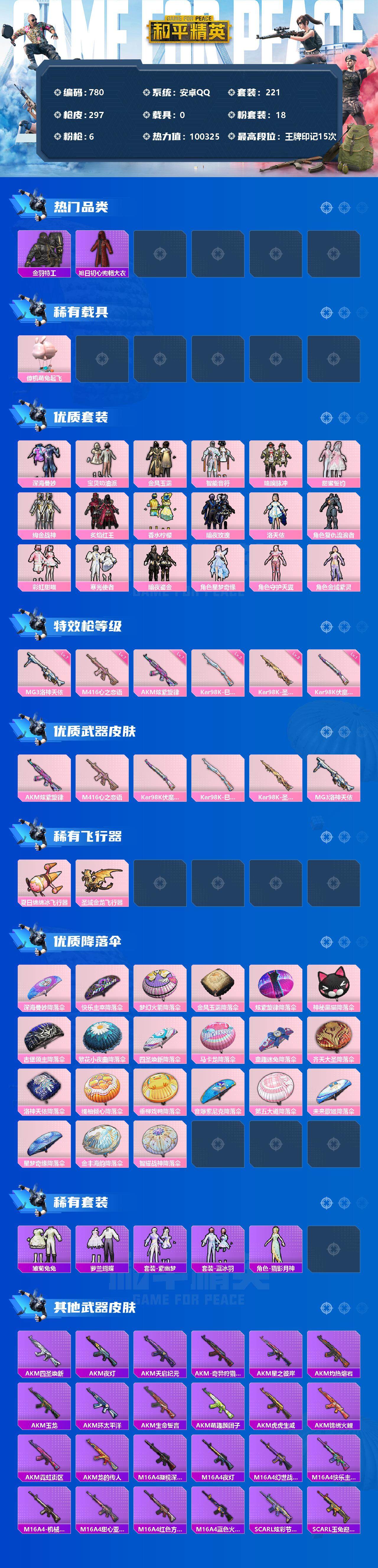[12351908]【商品标题】:安卓 手Q-18粉装-6特效枪-0载具-2粉色飞行器-100325热力值-15王牌印记-221套装-297枪皮 【热门品类】:套装-浪漫天命,套装-深海小丑鱼,套装-奇异狩猎者,套装-金羽特工,旭日初心兜帽大衣,套装-龟仙人,套装-潮萌小黄鸭,套装-粉红小猪 【粉色载具】:僚机-萌兔起飞 【粉色套装】:粉装-深海曼妙,粉装-宝贝奶油派,粉装-金风玉露,粉装-智能音符,粉装-琉璃脉冲,粉装-甜蜜誓约,粉装-绚金战神,粉装-炙焰红王,粉装-香水柠檬,粉装-暗夜玫瑰,角色-洛天依,角色-复仇流浪者,粉装-彩虹甜喵,粉装-寒光使者,粉装-暗夜鎏金,角色-星梦奇缘,角色-守护天翼,角色-金域紫灵 【粉色枪皮等级】:AKM-炫紫旋律(七级),M416-心之恋语(七级),Kar98K-伏魔团(一级),Kar98K-巳巳如意(三级),Kar98K-圣域龙灵(三级),MG3-洛神天依(七级) 【粉色枪皮】:AKM-炫紫旋律,M416-心之恋语,Kar98K-伏魔团,Kar98K-巳巳如意,Kar98K-圣域龙灵,MG3-洛神天依 【粉色飞行器】:夏日绵绵冰飞行器,圣域金龙飞行器 【粉色降落伞】:深海曼妙降落伞,快乐主宰降落伞,梦幻火箭降落伞,金风玉露降落伞,炫紫旋律降落伞,神秘黑猫降落伞,古堡领主降落伞,繁花小夜曲降落伞,四圣焕新降落伞,马卡龙降落伞,童趣迷兔降落伞,齐天大圣降落伞,洛神天依降落伞,橘柚倾心降落伞,垂柳戏鸭降落伞,音爆索尼克降落伞,第五大道降落伞,未来歌姬降落伞,星梦奇缘降落伞,金丰海韵降落伞,智耀战神降落伞 【稀有套装】:套装-龟仙人,套装-雏菊兔兔,套装-萝兰蝴蝶,套装-紫幽梦,套装-蓝冰羽,角色-猎影月神 【稀有枪皮】:AKM-四圣焕新,AKM-夜灯,AKM-天启纪元,AKM-奇异狩猎者,AKM-星之彼岸,AKM-灼热熔岩,AKM-玉龙,AKM-环太平洋,AKM-生命誓言,AKM-萌趣颜团子,AKM-虎虎生威,AKM-锦绣火鲤,AKM-霓虹街区,AKM-龙的传人,M16A4-凝视深渊,M16A4-夜灯,M16A4-幻世战舞者,M16A4-快乐主宰,M16A4-机械英豪,M16A4-甜心亚梦,M16A4-红色方程式,M16A4-蓝色火焰,SCAR-L-炫彩节奏,SCAR-L-玉兔迎春,SCAR-L-王牌四分卫,SCAR-L-红色方程式,SCAR-L