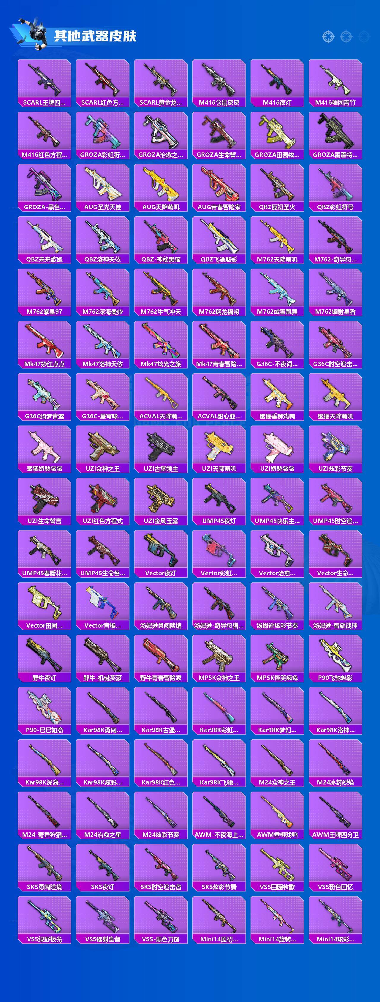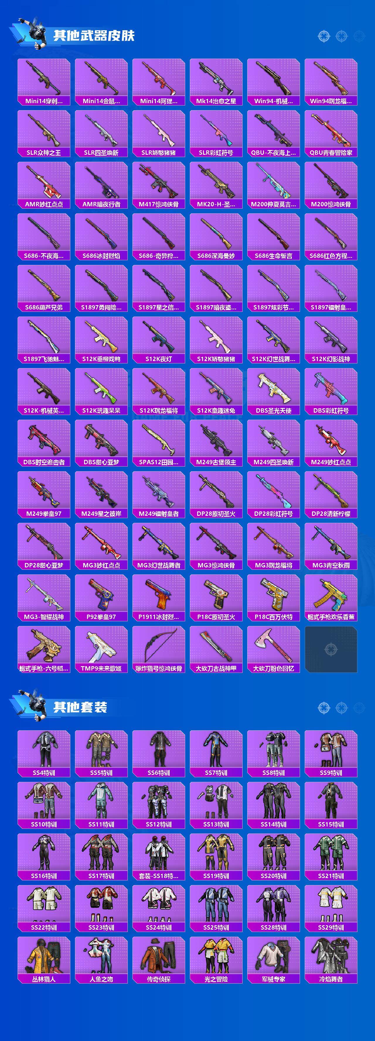 【稀有枪皮】:AKM-四圣焕新,AKM-夜灯,AKM-天启纪元,AKM-奇异狩猎者,AKM-星之彼岸,AKM-灼热熔岩,AKM-玉龙,AKM-环太平洋,AKM-生命誓言,AKM-萌趣颜团子,AKM-虎虎生威,AKM-锦绣火鲤,AKM-霓虹街区,AKM-龙的传人,M16A4-凝视深渊,M16A4-夜灯,M16A4-幻世战舞者,M16A4-快乐主宰,M16A4-机械英豪,M16A4-甜心亚梦,M16A4-红色方程式,M16A4-蓝色火焰,SCAR-L-炫彩节奏,SCAR-L-玉兔迎春,SCAR-L-王牌四分卫,SCAR-L-红色方程式,SCAR-L