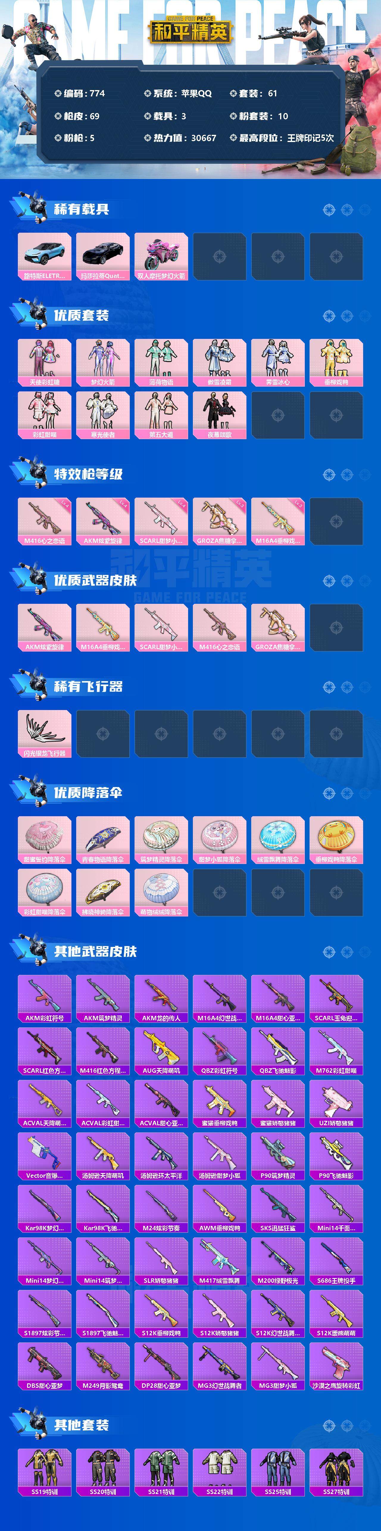 [12352228]【商品标题】:苹果 手Q-10粉装-5特效枪-3载具-1粉色飞行器-30667热力值-5王牌印记-61套装-69枪皮 【热门品类】:粉装-梦幻火箭,套装-浪漫天命,套装-龟仙人 【粉色载具】:路特斯ELETRE(冰川蓝),玛莎拉蒂Quattroporte(夜幕蓝),双人摩托-梦幻火箭 【粉色套装】:粉装-天使彩虹糖,粉装-梦幻火箭,粉装-薄荷物语,粉装-傲雪凌霜,粉装-霁雪冰心,粉装-垂柳戏鸭,粉装-彩虹甜喵,粉装-寒光使者,粉装-第五大道,粉装-夜幕颂歌 【粉色枪皮等级】:AKM-炫紫旋律(四级),M16A4-垂柳戏鸭(三级),SCAR-L-甜梦小狐(四级),M416-心之恋语(四级),GROZA-焦糖拿铁(三级) 【粉色枪皮】:AKM-炫紫旋律,M16A4-垂柳戏鸭,SCAR-L-甜梦小狐,M416-心之恋语,GROZA-焦糖拿铁 【粉色飞行器】:闪光银龙飞行器 【粉色降落伞】:甜蜜誓约降落伞,青春物语降落伞,筑梦精灵降落伞,甜梦小狐降落伞,绒雪飘舞降落伞,垂柳戏鸭降落伞,彩虹甜喵降落伞,拂晓神骑降落伞,萌物绒绒降落伞 【稀有套装】:套装-龟仙人 【稀有枪皮】:AKM-彩虹符号,AKM-筑梦精灵,AKM-龙的传人,M16A4-幻世战舞者,M16A4-甜心亚梦,SCAR-L-玉兔迎春,SCAR-L-红色方程式,M416-红色方程式,AUG-天降萌叽,QBZ-彩虹符号,QBZ-飞驰魅影,M762-彩虹甜喵,AC-VAL-天降萌叽,AC-VAL-彩虹甜喵,AC-VAL-甜心亚梦,蜜獾-垂柳戏鸭,蜜獾-娇憨猪猪,UZI-娇憨猪猪,Vector-音爆索尼克,汤姆逊-天降萌叽,汤姆逊-环太平洋,汤姆逊-甜梦小狐,P90-筑梦精灵,P90-飞驰魅影,Kar98K-梦幻火箭,Kar98K-飞驰魅影,M24-炫彩节奏,AWM-垂柳戏鸭,SKS-迅猛狂鲨,Mini14-千面幻镜,Mini14-梦幻火箭,Mini14-筑梦精灵,SLR-娇憨猪猪,M417-绒雪飘舞,M200-绿野极光,S686-王牌投手,S1897-炫彩节奏,S1897-飞驰魅影,S12K-垂柳戏鸭,S12K-娇憨猪猪,S12K-幻世战舞者,S12K-暖熊萌萌,DBS-甜心亚梦,M249-月影鸳鸯,DP-28-甜心亚梦,MG3-幻世战舞者,MG3-甜梦小狐,沙漠之鹰-旋转彩虹 【其他套装】:套装-SS19特训,套装