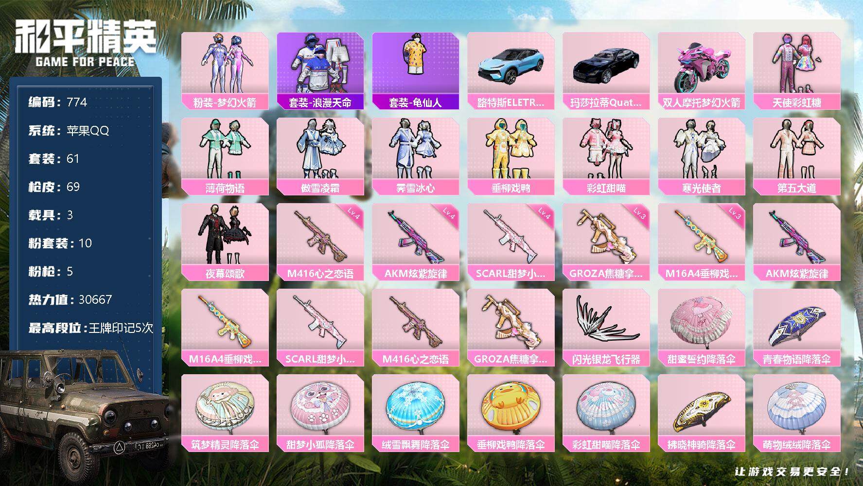 [12352228]【商品标题】:苹果 手Q-10粉装-5特效枪-3载具-1粉色飞行器-30667热力值-5王牌印记-61套装-69枪皮