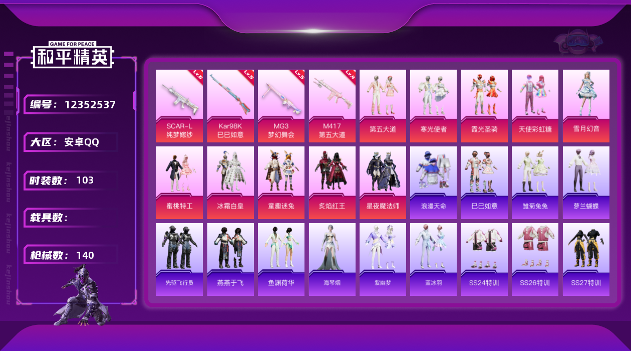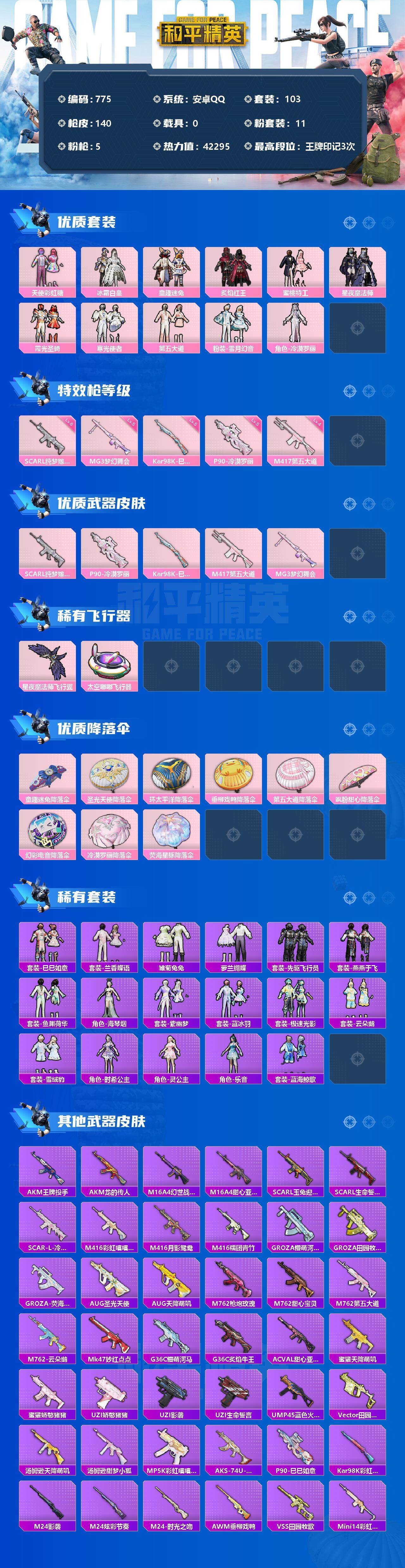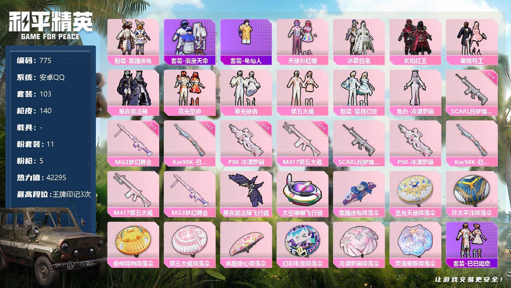 [12352537]【商品标题】:安卓 手Q-11粉装-5特效枪-0载具-2粉色飞行器-42295热力值-3王牌印记-103套装-140枪皮
