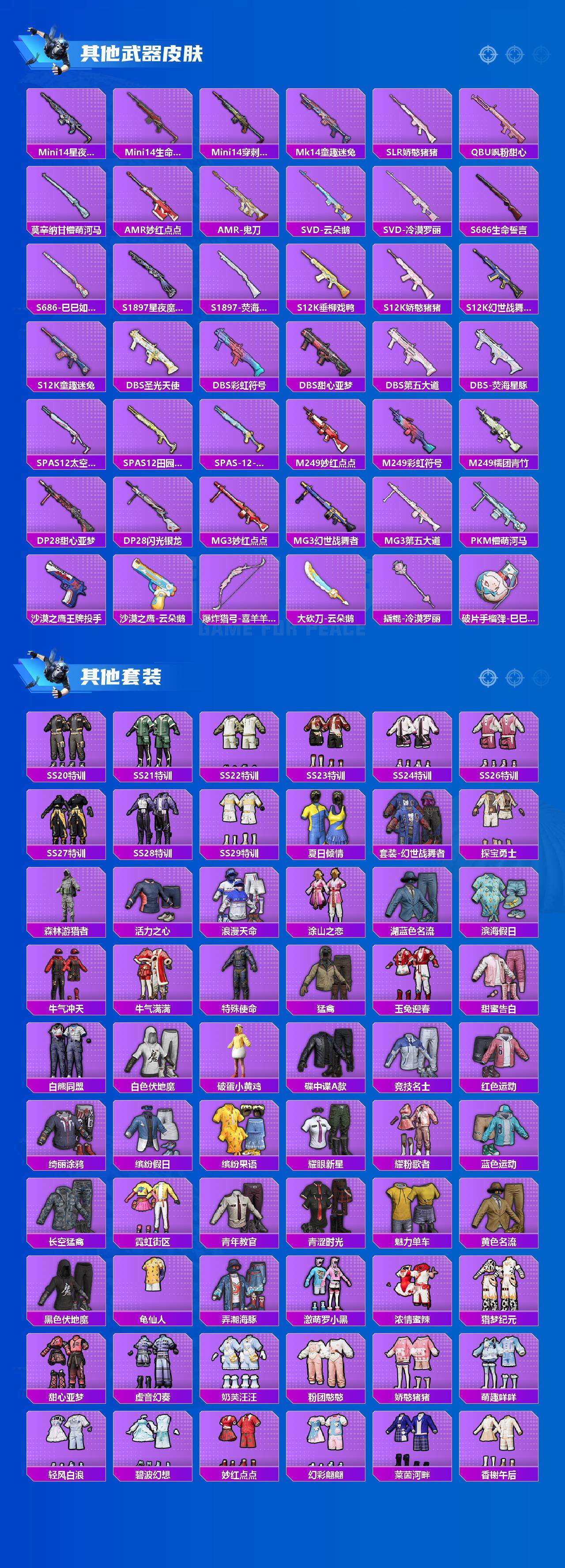 【稀有枪皮】:AKM-王牌投手,AKM-龙的传人,M16A4-幻世战舞者,M16A4-甜心亚梦,SCAR-L-玉兔迎春,SCAR-L-生命誓言,SCAR-L-冷漠罗丽,M416-彩虹嘻嘻猴,M416-月影鸳鸯,M416-糯团青竹,GROZA-懵萌河马,GROZA-田园牧歌,GROZA-荧海星豚,AUG-圣光天使,AUG-天降萌叽,M762-枪炮玫瑰,M762-甜心宝贝,M762-第五大道,M762-云朵鹅,Mk47-妙红点点,G36C-懵萌河马,G36C-炙焰牛王,AC-VAL-甜心亚梦,蜜獾-天降萌叽,蜜獾-娇憨猪猪,UZI-娇憨猪猪,UZI-影袭,UZI-生命誓言,UMP45-蓝色火焰,Vector-田园牧歌,汤姆逊-天降萌叽,汤姆逊-甜梦小狐,MP5K-彩虹嘻嘻猴,AKS-74U-鬼刀,P90-巳巳如意,Kar98K-彩虹符号,M24-影袭,M24-炫彩节奏,M24-时光之吻,AWM-垂柳戏鸭,VSS-田园牧歌,Mini14-彩