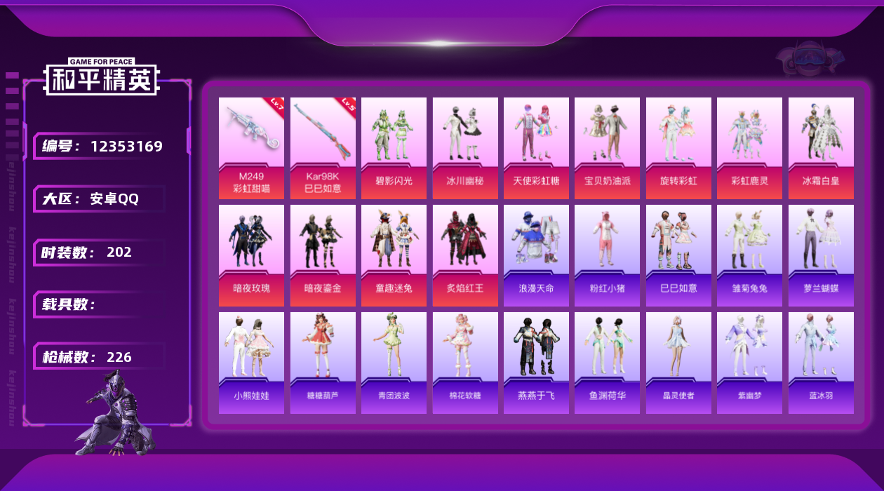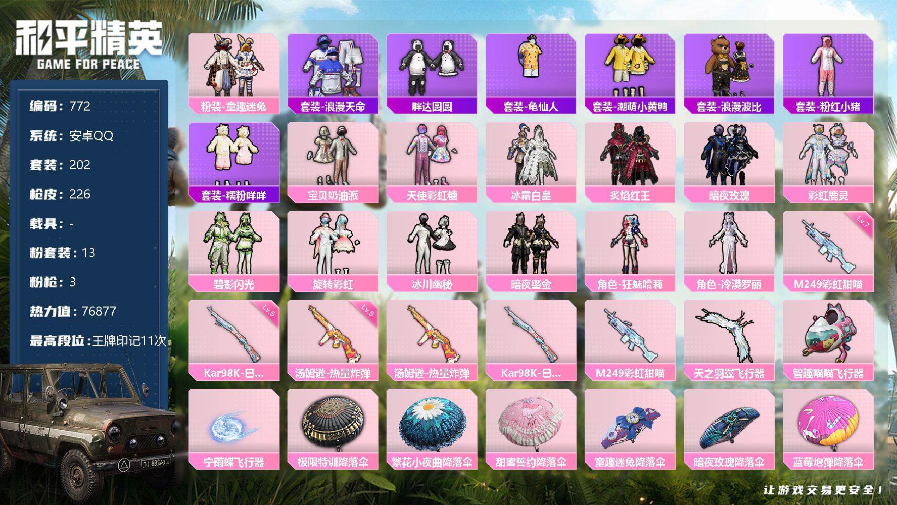 [12353169]【商品标题】:安卓 手Q-13粉装-3特效枪-0载具-3粉色飞行器-76877热力值-11王牌印记-202套装-226枪皮