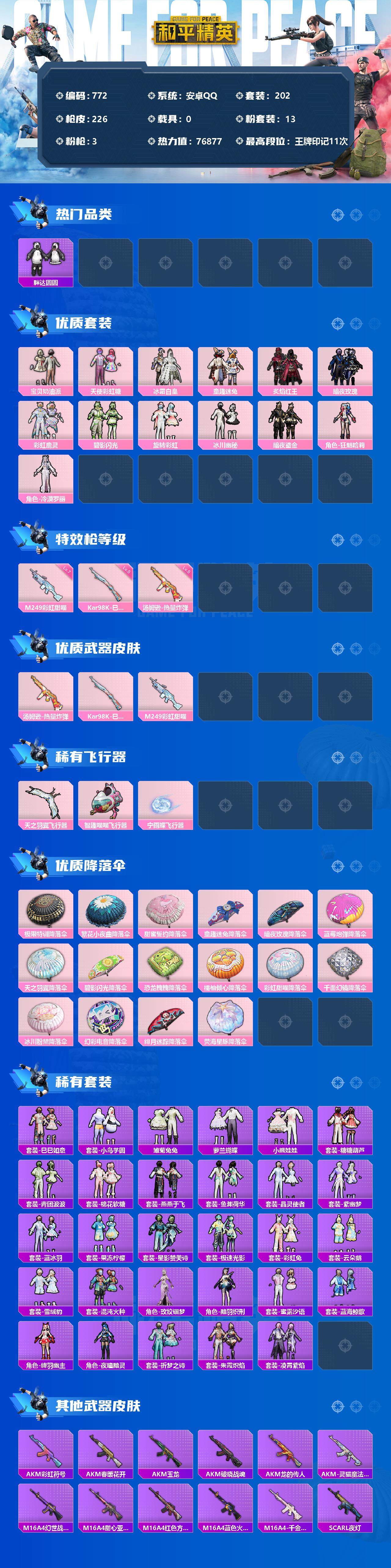 [12353169]【商品标题】:安卓 手Q-13粉装-3特效枪-0载具-3粉色飞行器-76877热力值-11王牌印记-202套装-226枪皮 【热门品类】:粉装-童趣迷兔,套装-浪漫天命,套装-胖达圆圆,套装-龟仙人,套装-潮萌小黄鸭,套装-浪漫波比,套装-粉红小猪,套装-糯粉咩咩 【粉色套装】:粉装-宝贝奶油派,粉装-天使彩虹糖,粉装-冰霜白皇,粉装-童趣迷兔,粉装-炙焰红王,粉装-暗夜玫瑰,粉装-彩虹鹿灵,粉装-碧影闪光,粉装-旋转彩虹,粉装-冰川幽秘,粉装-暗夜鎏金,角色-狂魅哈莉,角色-冷漠罗丽 【粉色枪皮等级】:汤姆逊-热量炸弹(五级),Kar98K-巳巳如意(五级),M249-彩虹甜喵(七级) 【粉色枪皮】:汤姆逊-热量炸弹,Kar98K-巳巳如意,M249-彩虹甜喵 【粉色飞行器】:天之羽翼飞行器,智趣喵喵飞行器,宁雨蝶飞行器 【粉色降落伞】:极限特训降落伞,繁花小夜曲降落伞,甜蜜誓约降落伞,童趣迷兔降落伞,暗夜玫瑰降落伞,蓝莓炮弹降落伞,天之羽翼降落伞,碧影闪光降落伞,恐龙拽拽降落伞,橘柚倾心降落伞,彩虹甜喵降落伞,千面幻镜降落伞,冰川粉黛降落伞,幻彩电音降落伞,绯月迷踪降落伞,荧海星豚降落伞 【稀有套装】:套装-龟仙人,套装-巳巳如意,套装-小鸟芋圆,套装-雏菊兔兔,套装-萝兰蝴蝶,套装-小熊娃娃,套装-糖糖葫芦,套装-青团波波,套装-棉花软糖,套装-燕燕于飞,套装-鱼渊荷华,套装-晶灵使者,套装-紫幽梦,套装-蓝冰羽,套装-果冻柠檬,套装-星影赞美诗,套装-极速光影,套装-彩虹兔,套装-云朵鹅,套装-雪绒豹,套装-混沌火种,角色-玫纹锢梦,角色-黯羽织刑,套装-蜜露汐语,套装-蓝海鲸歌,角色-绛羽幽主,角色-夜瞳黯灵,套装-折梦之诗,套装-朱霞炽焰,套装-凌霄紫焰 【稀有枪皮】:AKM-彩虹符号,AKM-春暖花开,AKM-玉龙,AKM-破晓战魂,AKM-龙的传人,AKM-灵猫魔法师,M16A4-幻世战舞者,M16A4-甜心亚梦,M16A4-红色方程式,M16A4-蓝色火焰,M16A4-千金淑猫,SCAR-L-夜灯,SCAR-L-暗夜玫瑰,SCAR-L-炫彩节奏,SCAR-L-玉兔迎春,SCAR-L-红色方程式,SCAR-L-龙宫之主,M416-糯团青竹,M416-红色方程式,M416-蓝色火焰,GROZA-异彩先驱,GROZA-春暖花开,GROZA-蓝莓炮弹,G