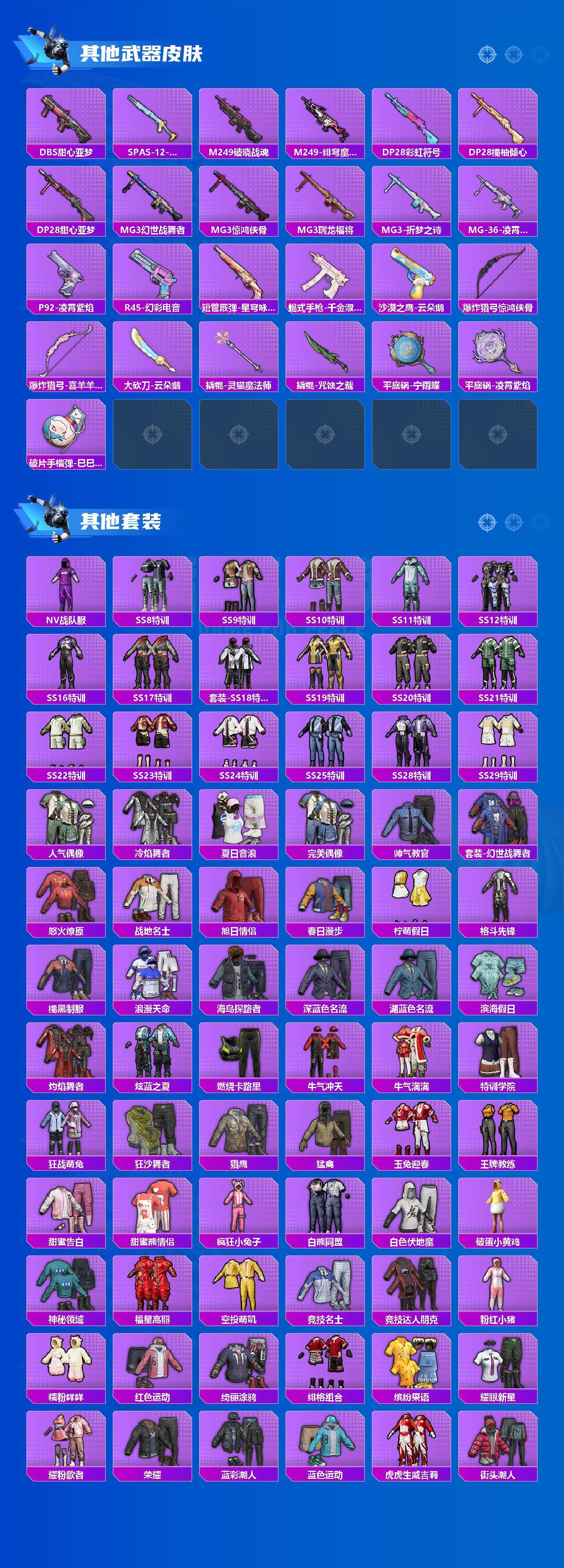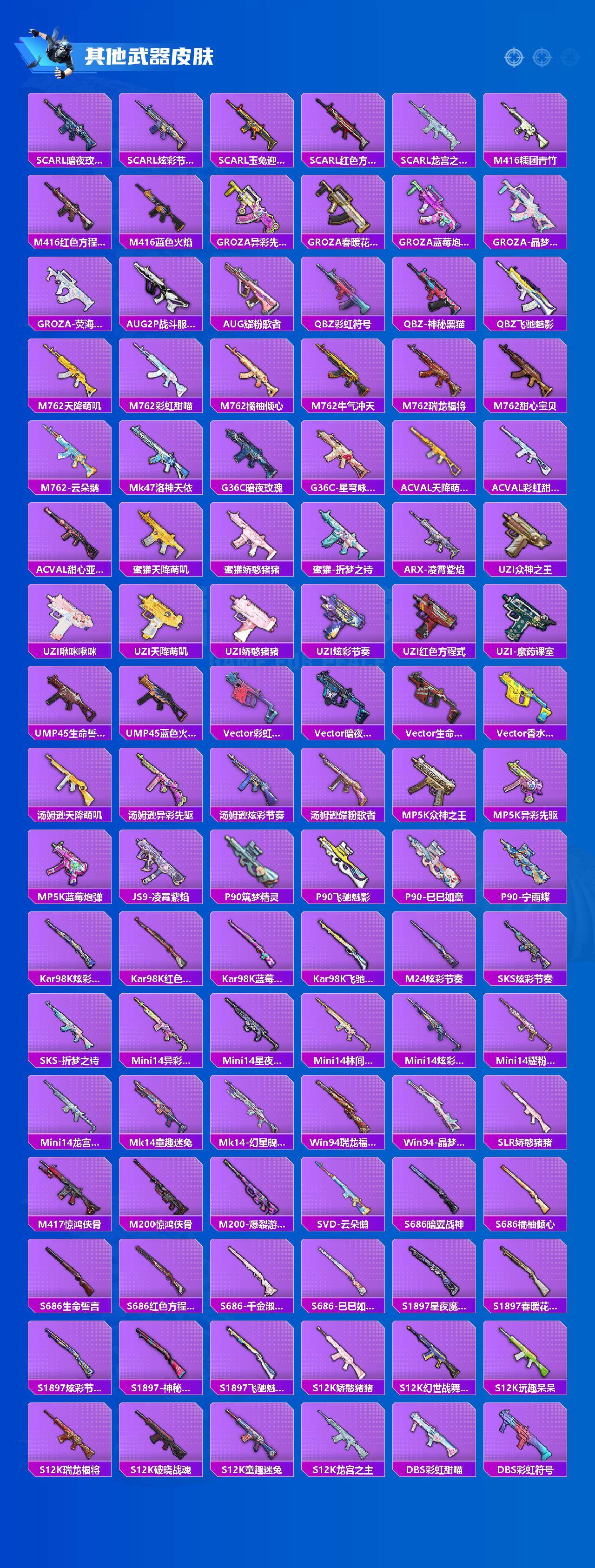 【稀有枪皮】:AKM-彩虹符号,AKM-春暖花开,AKM-玉龙,AKM-破晓战魂,AKM-龙的传人,AKM-灵猫魔法师,M16A4-幻世战舞者,M16A4-甜心亚梦,M16A4-红色方程式,M16A4-蓝色火焰,M16A4-千金淑猫,SCAR-L-夜灯,SCAR-L-暗夜玫瑰,SCAR-L-炫彩节奏,SCAR-L-玉兔迎春,SCAR-L-红色方程式,SCAR-L-龙宫之主,M416-糯团青竹,M416-红色方程式,M416-蓝色火焰,GROZA-异彩先驱,GROZA-春暖花开,GROZA-蓝莓炮弹,G