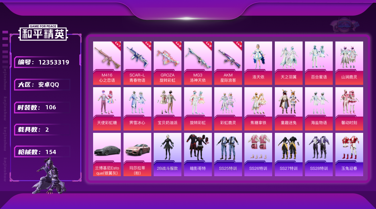 [12353319]【商品标题】:安卓 手Q-14粉装-5特效枪-2载具-2粉色飞行器-54008热力值-4王牌印记-106套装-154枪皮