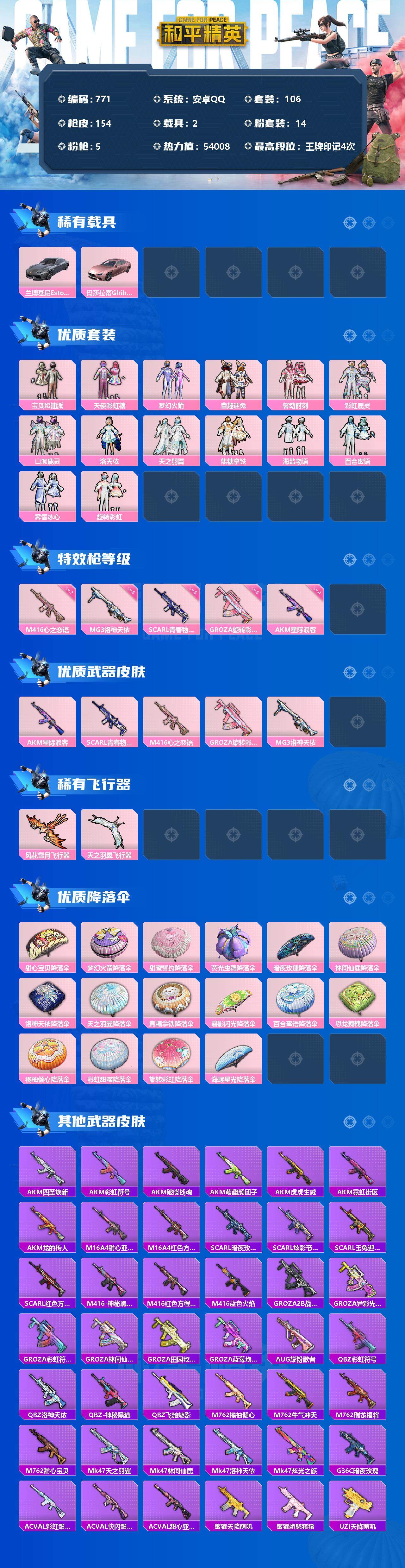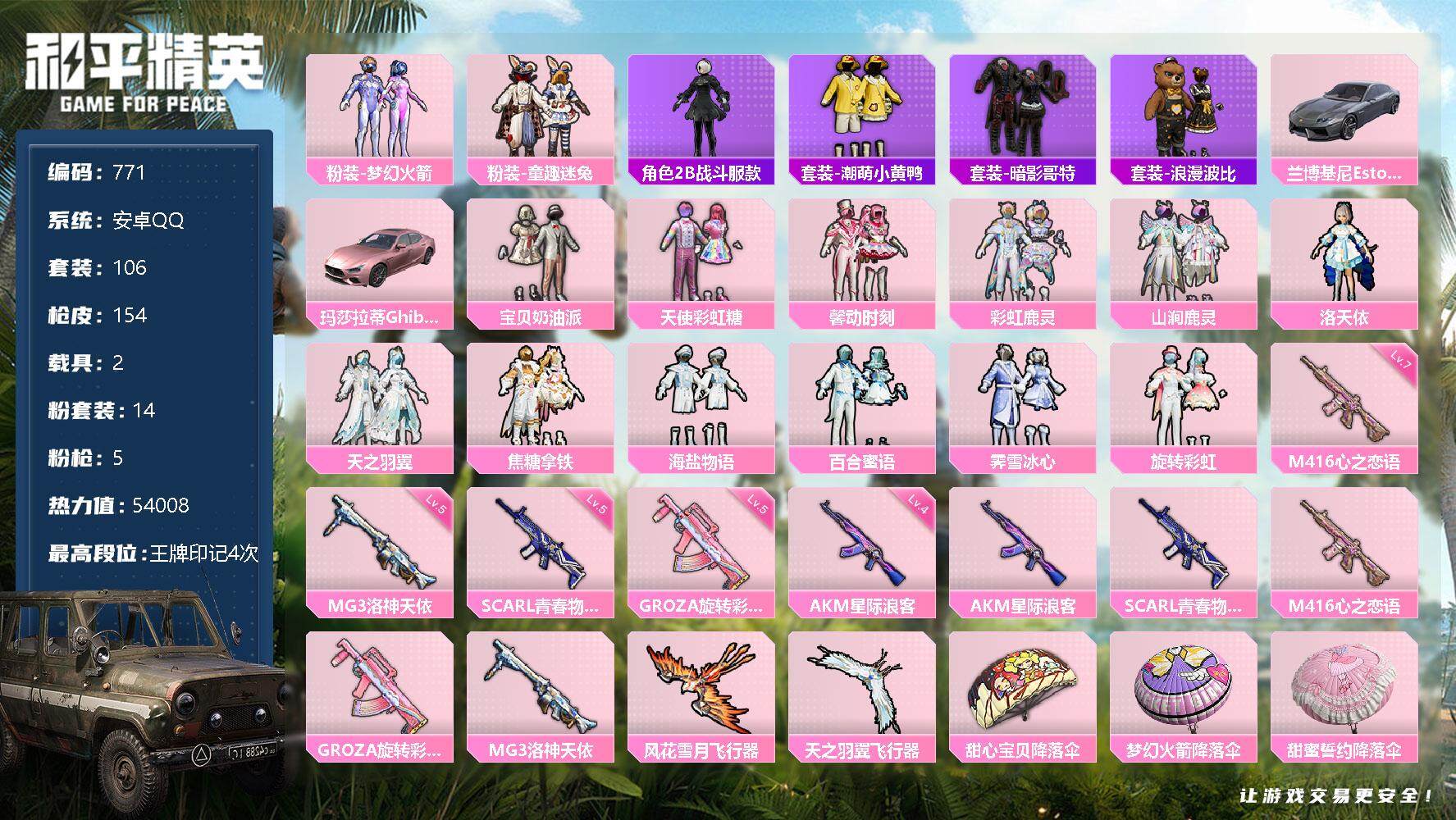 [12353319]【商品标题】:安卓 手Q-14粉装-5特效枪-2载具-2粉色飞行器-54008热力值-4王牌印记-106套装-154枪皮 【热门品类】:粉装-梦幻火箭,粉装-童趣迷兔,角色-2B战斗服款,套装-潮萌小黄鸭,套装-暗影哥特,套装-浪漫波比 【粉色载具】:兰博基尼Estoque(银翼灰),玛莎拉蒂Ghibli(粉) 【粉色套装】:粉装-宝贝奶油派,粉装-天使彩虹糖,粉装-梦幻火箭,粉装-童趣迷兔,粉装-馨动时刻,粉装-彩虹鹿灵,粉装-山涧鹿灵,角色-洛天依,粉装-天之羽翼,粉装-焦糖拿铁,粉装-海盐物语,粉装-百合蜜语,粉装-霁雪冰心,粉装-旋转彩虹 【粉色枪皮等级】:AKM-星际浪客(四级),SCAR-L-青春物语(五级),M416-心之恋语(七级),GROZA-旋转彩虹(五级),MG3-洛神天依(五级) 【粉色枪皮】:AKM-星际浪客,SCAR-L-青春物语,M416-心之恋语,GROZA-旋转彩虹,MG3-洛神天依 【粉色飞行器】:风花雪月飞行器,天之羽翼飞行器 【粉色降落伞】:甜心宝贝降落伞,梦幻火箭降落伞,甜蜜誓约降落伞,荧光虫舞降落伞,暗夜玫瑰降落伞,林间仙鹿降落伞,洛神天依降落伞,天之羽翼降落伞,焦糖拿铁降落伞,碧影闪光降落伞,百合蜜语降落伞,恐龙拽拽降落伞,橘柚倾心降落伞,彩虹甜喵降落伞,旋转彩虹降落伞,海螺星光降落伞 【稀有枪皮】:AKM-四圣焕新,AKM-彩虹符号,AKM-破晓战魂,AKM-萌趣颜团子,AKM-虎虎生威,AKM-霓虹街区,AKM-龙的传人,M16A4-甜心亚梦,M16A4-红色方程式,SCAR-L-暗夜玫瑰,SCAR-L-炫彩节奏,SCAR-L-玉兔迎春,SCAR-L-红色方程式,M416-神秘黑猫,M416-红色方程式,M416-蓝色火焰,GROZA-2B战斗服款,GROZA-异彩先驱,GROZA-彩虹符号,GROZA-林间仙鹿,GROZA-田园牧歌,GROZA-蓝莓炮弹,AUG-耀粉歌者,QBZ-彩虹符号,QBZ-洛神天依,QBZ-神秘黑猫,QBZ-飞驰魅影,M762-橘柚倾心,M762-牛气冲天,M762-瑞龙福将,M762-甜心宝贝,Mk47-天之羽翼,Mk47-林间仙鹿,Mk47-洛神天依,Mk47-炫光之旅,G36C-暗夜玫瑰,AC-VAL-彩虹甜喵,AC-VAL-快闪甜心,AC-VAL-甜心亚梦,蜜獾-天降萌叽,蜜獾-