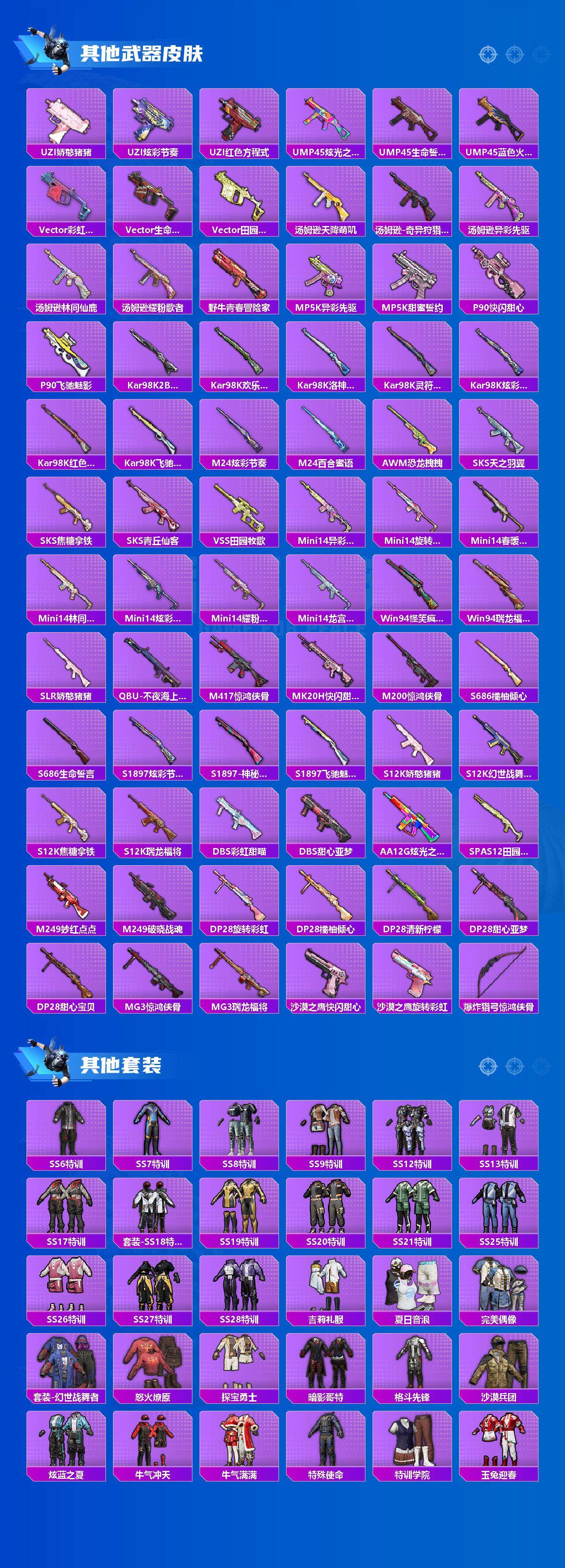 【稀有枪皮】:AKM-四圣焕新,AKM-彩虹符号,AKM-破晓战魂,AKM-萌趣颜团子,AKM-虎虎生威,AKM-霓虹街区,AKM-龙的传人,M16A4-甜心亚梦,M16A4-红色方程式,SCAR-L-暗夜玫瑰,SCAR-L-炫彩节奏,SCAR-L-玉兔迎春,SCAR-L-红色方程式,M416-神秘黑猫,M416-红色方程式,M416-蓝色火焰,GROZA-2B战斗服款,GROZA-异彩先驱,GROZA-彩虹符号,GROZA-林间仙鹿,GROZA-田园牧歌,GROZA-蓝莓炮弹,AUG-耀粉歌者,QBZ-彩虹符号,QBZ-洛神天依,QBZ-神秘黑猫,QBZ-飞驰魅影,M762-橘柚倾心,M762-牛气冲天,M762-瑞龙福将,M762-甜心宝贝,Mk47-天之羽翼,Mk47-林间仙鹿,Mk47-洛神天依,Mk47-炫光之旅,G36C-暗夜玫瑰,AC-VAL-彩虹甜喵,AC-VAL-快闪甜心,AC-VAL-甜心亚梦,蜜獾-天降萌叽,蜜獾-