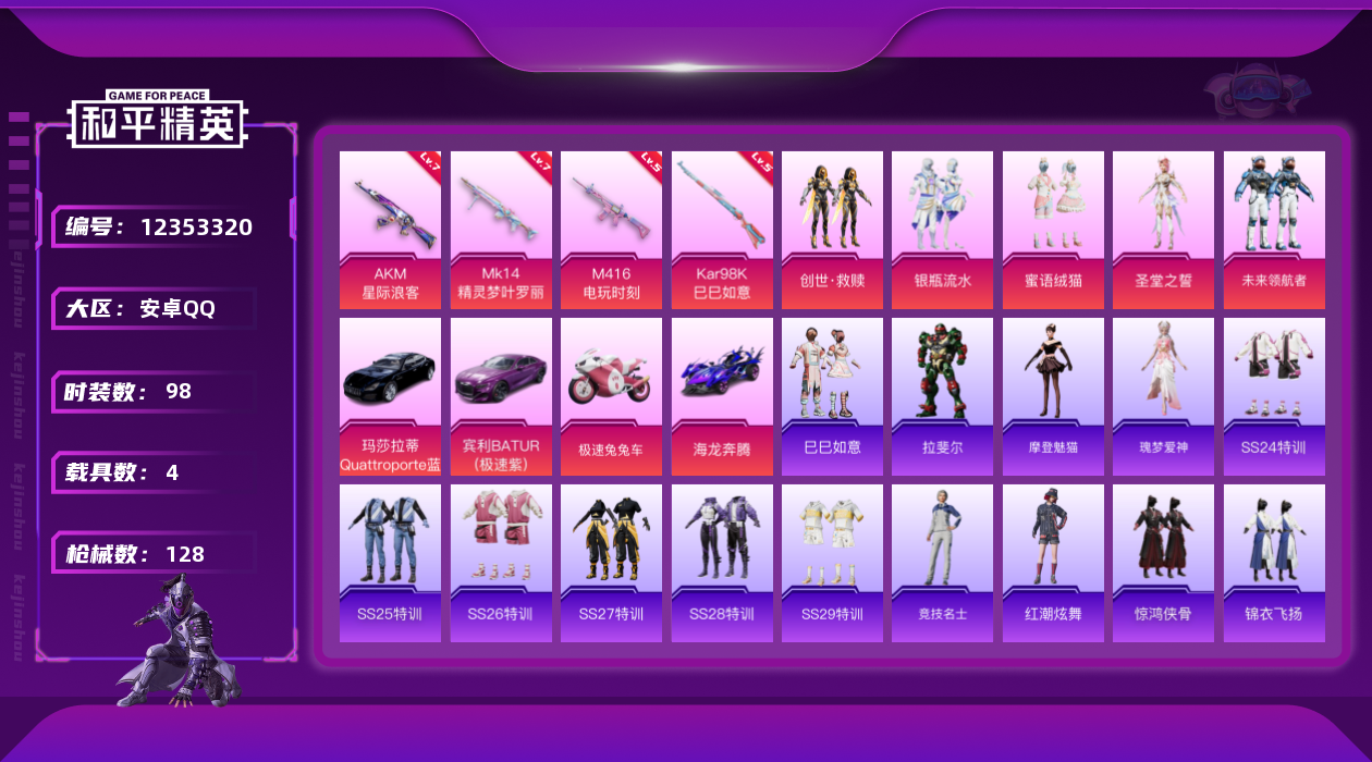 [12353320]【商品标题】:安卓 手Q-5粉装-5特效枪-4载具-2粉色飞行器-45774热力值-7王牌印记-98套装-128枪皮