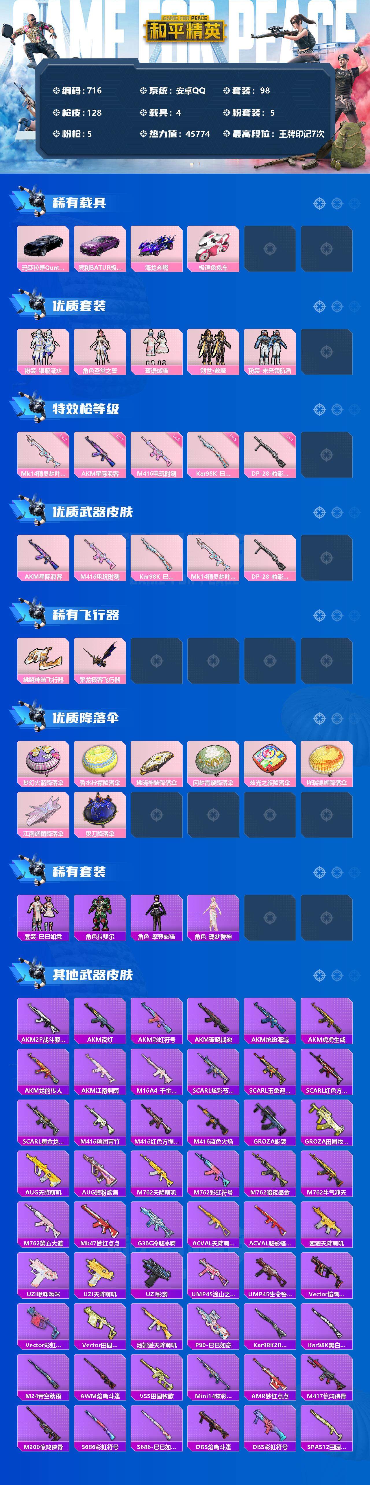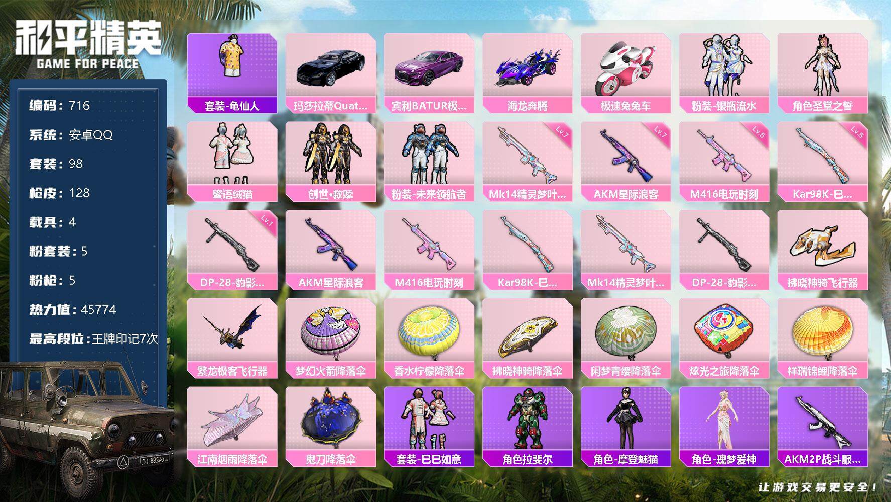 [12353320]【商品标题】:安卓 手Q-5粉装-5特效枪-4载具-2粉色飞行器-45774热力值-7王牌印记-98套装-128枪皮 【热门品类】:套装-龟仙人 【粉色载具】:玛莎拉蒂Quattroporte(夜幕蓝),宾利BATUR(极速紫),海龙奔腾,极速兔兔车 【粉色套装】:粉装-银瓶流水,角色-圣堂之誓,粉装-蜜语绒猫,套装-创世·救赎,粉装-未来领航者 【粉色枪皮等级】:AKM-星际浪客(七级),M416-电玩时刻(五级),Kar98K-巳巳如意(五级),Mk14-精灵梦叶罗丽(七级),DP-28-豹影疾电(一级) 【粉色枪皮】:AKM-星际浪客,M416-电玩时刻,Kar98K-巳巳如意,Mk14-精灵梦叶罗丽,DP-28-豹影疾电 【粉色飞行器】:拂晓神骑飞行器,繁龙极客飞行器 【粉色降落伞】:梦幻火箭降落伞,香水柠檬降落伞,拂晓神骑降落伞,闲梦青缨降落伞,炫光之旅降落伞,祥瑞锦鲤降落伞,江南烟雨降落伞,鬼刀降落伞 【稀有套装】:套装-龟仙人,套装-巳巳如意,角色-拉斐尔,角色-摩登魅猫,角色-瑰梦爱神 【稀有枪皮】:AKM-2P战斗服款,AKM-夜灯,AKM-彩虹符号,AKM-江南烟雨,AKM-破晓战魂,AKM-缤纷海域,AKM-虎虎生威,AKM-龙的传人,M16A4-千金淑猫,SCAR-L-炫彩节奏,SCAR-L-玉兔迎春,SCAR-L-红色方程式,SCAR-L-黄金龙骨,M416-糯团青竹,M416-红色方程式,M416-蓝色火焰,GROZA-影袭,GROZA-田园牧歌,AUG-天降萌叽,AUG-耀粉歌者,M762-天降萌叽,M762-彩虹符号,M762-暗夜鎏金,M762-牛气冲天,M762-第五大道,Mk47-妙红点点,G36C-冷魅冰骑,AC-VAL-天降萌叽,AC-VAL-魅影蝠王,蜜獾-天降萌叽,UZI-啾咪啾咪,UZI-天降萌叽,UZI-影袭,UMP45-涂山之恋,UMP45-生命誓言,Vector-焰鹰斗篷,Vector-彩虹符号,Vector-田园牧歌,汤姆逊-天降萌叽,P90-巳巳如意,Kar98K-2B战斗服款,Kar98K-黑白懵懵牛,M24-青空秋雨,AWM-焰鹰斗篷,VSS-田园牧歌,Mini14-炫彩节奏,AMR-妙红点点,M417-惊鸿侠骨,M200-惊鸿侠骨,S686-彩虹符号,S686-巳巳如意,DBS-焰鹰斗篷,DBS-彩虹