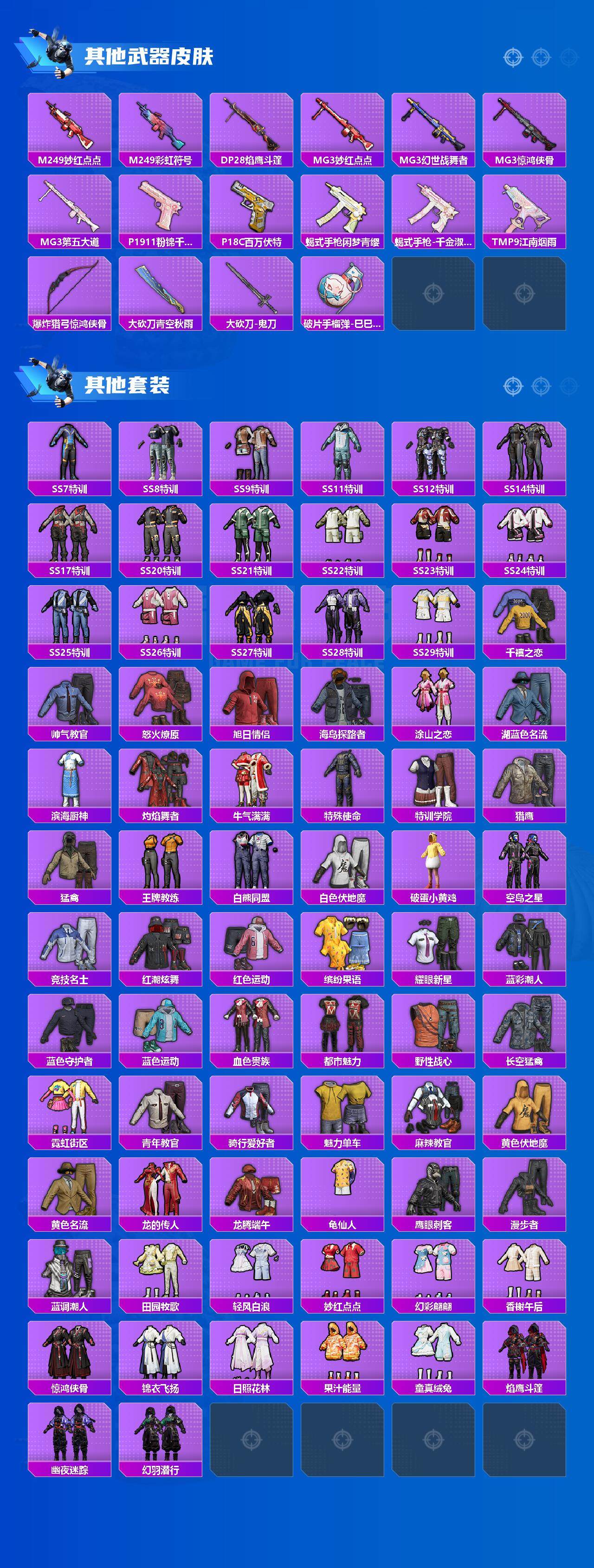 - PX_1981316- 苹果手Q-18王牌印记-10粉装-5特效枪-3载具-100993热力值-224套装-287枪皮-5卓越印记-1传奇印记 【10粉装】,梦幻火箭,宝贝奶油派,缤纷油彩,蝶舞迷情,木曜青龙,古堡领主,炫光之旅,金属狂野,智能音符,数码大师 【5特效枪】AKM-炫紫旋律-5级 SCAR-L-机甲封神-6级 M416-五爪金龙-2级 M416-心之恋语-7级 Kar98K-巳巳如意