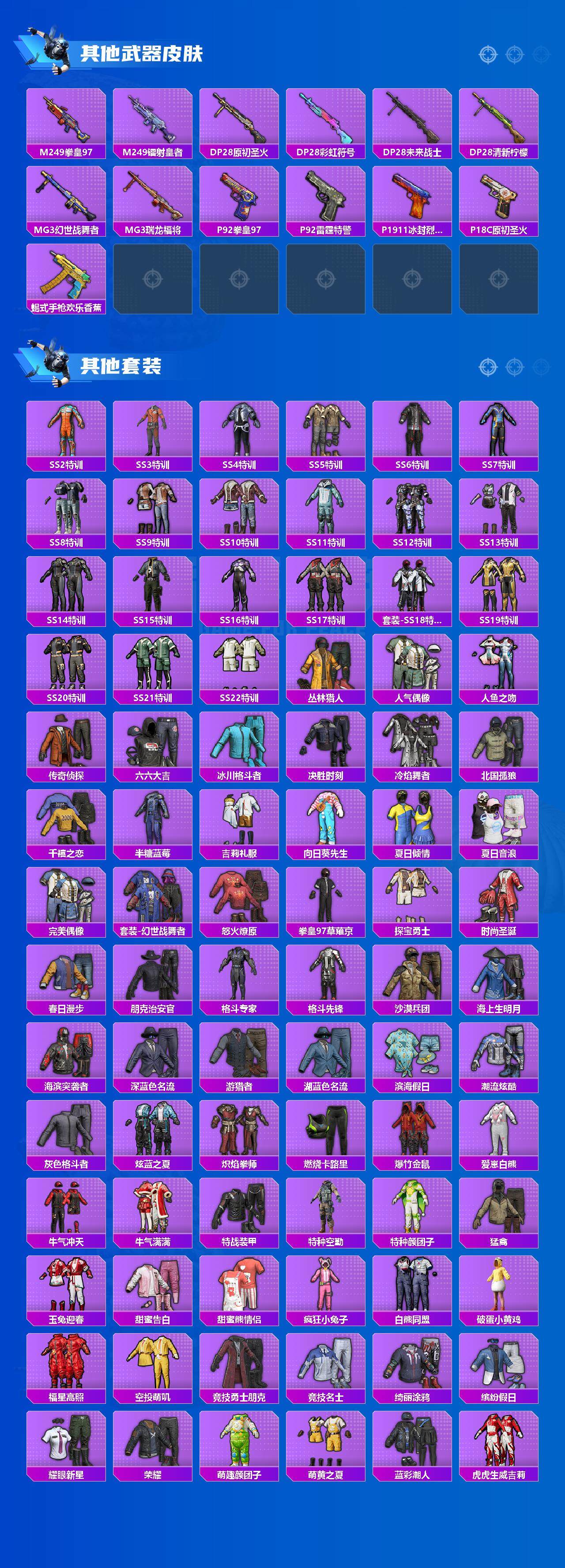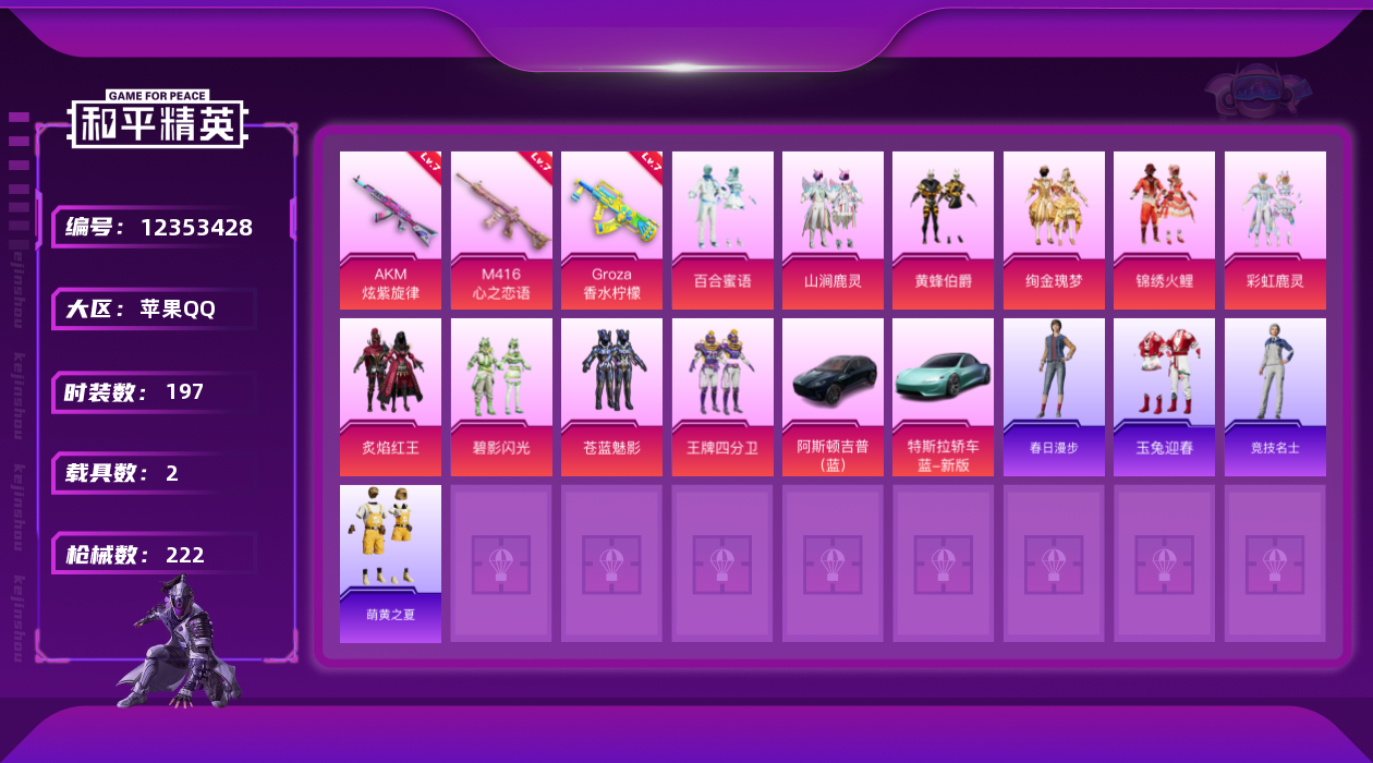 - [11353791]11粉装 10特效枪 10印记 可二次 可修改实名 身法装备:暗影哥特(红眼罩),初号机 觉醒Ver.(新紫螳螂),8号机(新粉螳螂),Mark.06(新蓝螳螂) 优质装备:SCAR-L梦幻火箭,梦幻火箭(新101)(新火箭少女101粉色套装),七级SCAR-L-梦幻火箭,M416电玩时刻,UMP45量子极限,M762-青锋波束,千金淑猫,GROZA-镜光银凌,AUG-许七安,七级AUG-许七安,MK14-甜梦熊击,幻彩电音,MG-36-幻彩电音,Kar98K-巳巳如意 热门装扮:蜜桃特工,歌者泠鸢,严莉莉,美雪,美琪,小蓝,超弦星,初号机 觉醒Ver.(新紫螳螂),迅捷狂鲨,呆萌铁蟹 稀有枪皮:DP-28-豹影疾电 五级特效枪:五级M762-青锋波束,五级UMP45-量子极限,五级GROZA-镜光银凌,五级Kar98K-巳巳如意,五级DP-28-豹影疾电,五级MK14-甜梦熊击,五级M416-电玩时刻 四级特效枪:四级MG-36-幻彩电音 紫色装扮:SS21特训,SS31特训套装,冷焰舞者,极速光影,SS30特训套装,云朵鹅,彩虹兔,雪绒豹,SS33特训套装,顶瓜瓜,时希公主,SS15特训,暗夜傀儡,SS16特训,SS19特训,天籁歌者,瑞龙福将,团圆交子,SS17特训,SS18特训,长空猛禽,雪鹰学院,缤纷果语,虎虎生威吉莉,魅力单车,龙的传人,龟仙人,冰河战士,龙魂突击队,蝶变,香桃花海,黯羽织刑,荒原牛仔,极地朋克,格斗先锋,海岛探路者,滨海假日,滨海厨神,绮丽涂鸦,破蛋小黄鸡,甜蜜告白,福星高照,牛气冲天,灰色格斗者,猛禽,特殊使命,特训学院,小熊娃娃,雏菊兔兔,萝兰蝴蝶,SS29特训,湖畔霞光,星途旅人,纯真浪花,热情海星,曼妙人鱼,SS28特训,粉雾星云,甜酷狙击,8号机(新粉螳螂),Mark.06(新蓝螳螂),光矢逐梦,异域银装,鱼渊荷华,玉兔迎春,燕燕于飞,巳巳如意,青团波波,糖糖葫芦,棉花软糖,竞技名士,绒宝小鹅,暗影哥特(红眼罩),街头风暴,SS25特训,湖雨初晴,焰鹰斗篷,幻羽潜行,SS27特训,智谋强哥,大橘大利,小鸟芋圆,粉恋花,蓝冰羽,紫幽梦,SS32特训服(SS32特训套装),纯白跃动,恋语绒绒,双彩圣灵,冰冻风暴,幸运萌趣趣,光之冒险,海上生明月 优质战备:星途旅人降落伞,金丰海韵降落伞,巴啦啦小魔仙降落伞,江南烟雨降落伞,千金淑