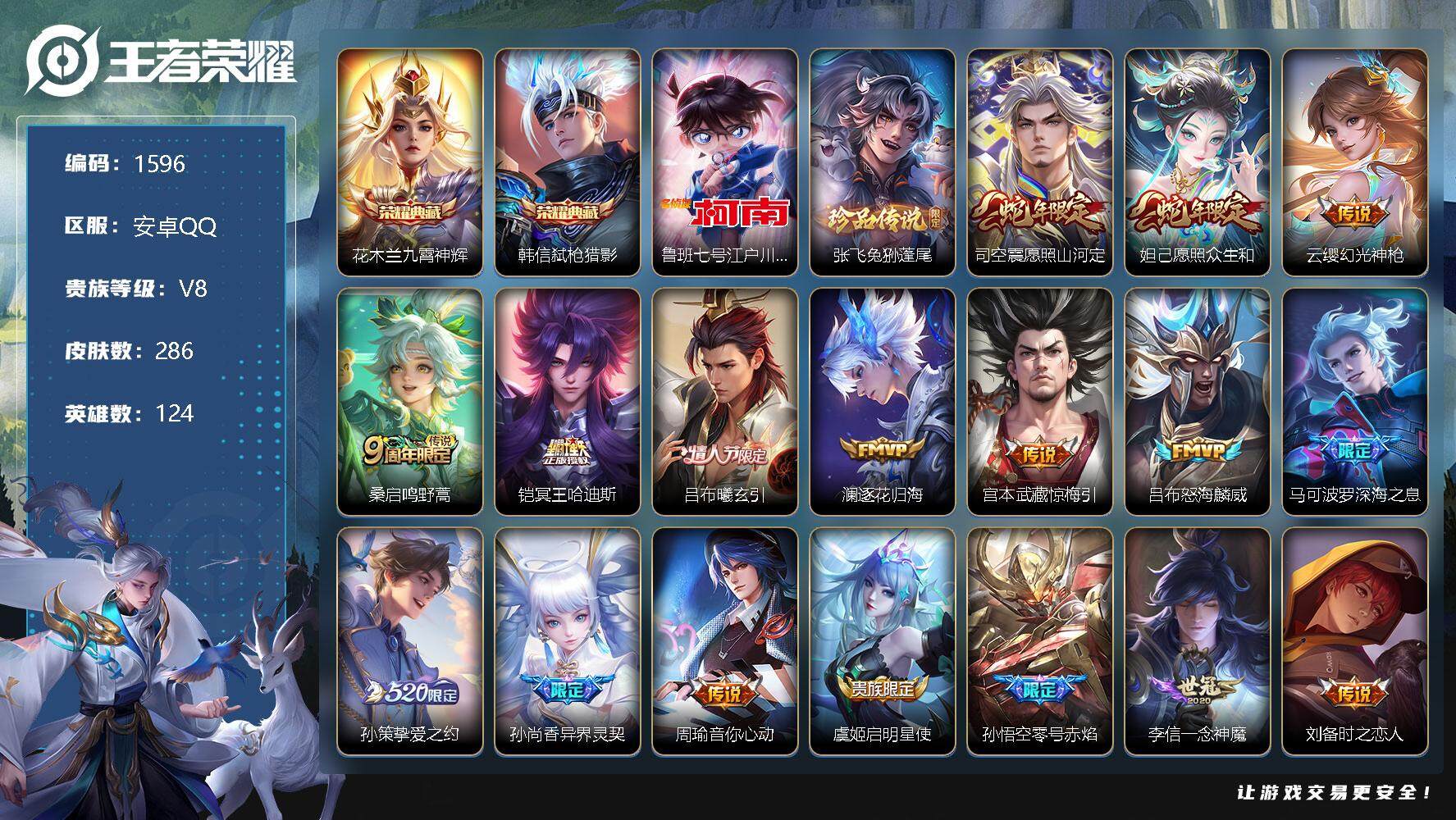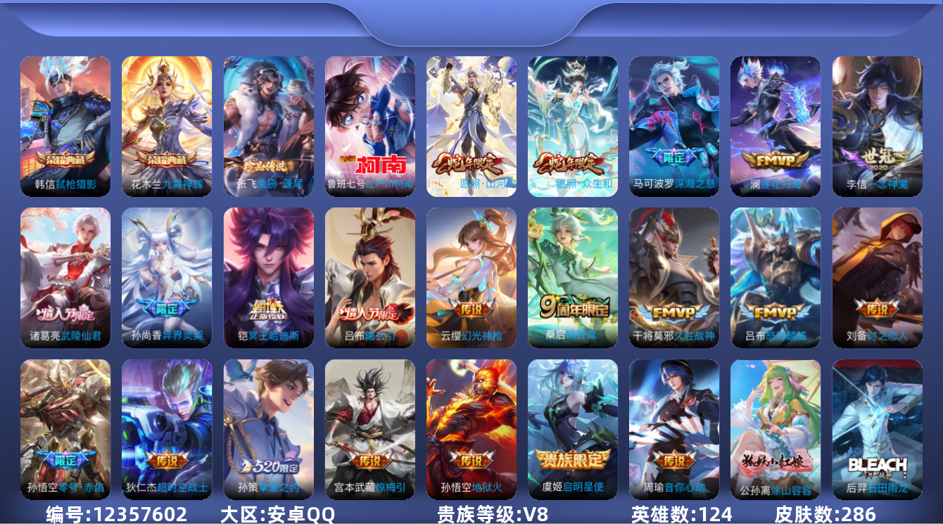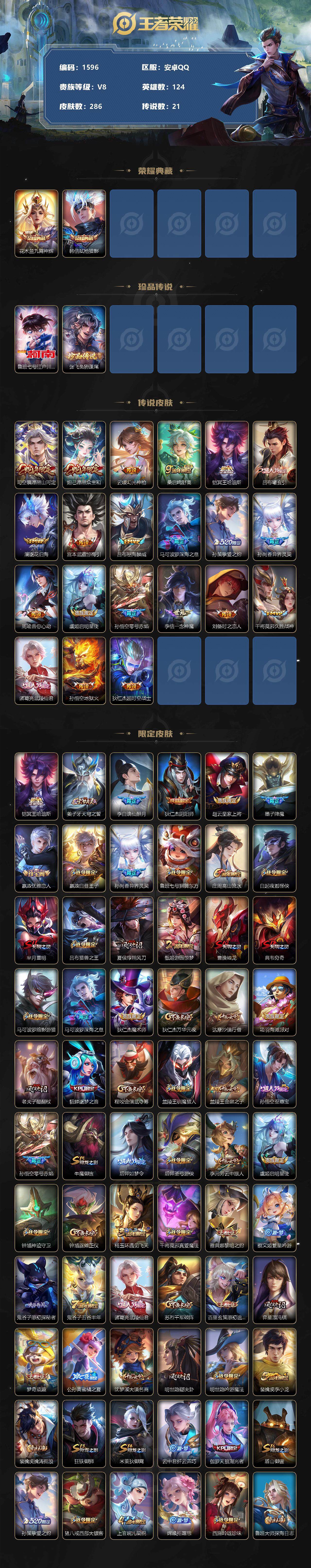 [12357602]【商品标题】:安卓Q-V8-最强王者段位-124英雄-286皮肤-2典藏-0珍品无双-0无双-2珍品传说-21传说-86史诗