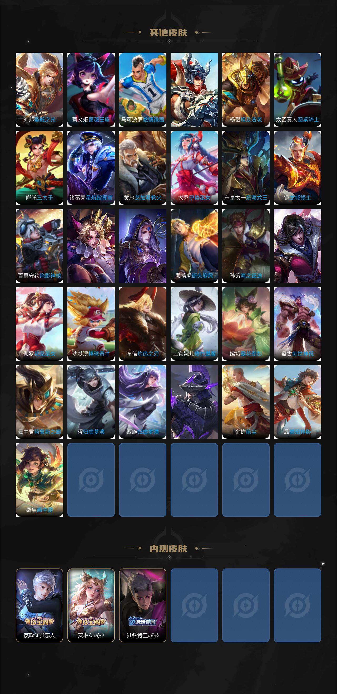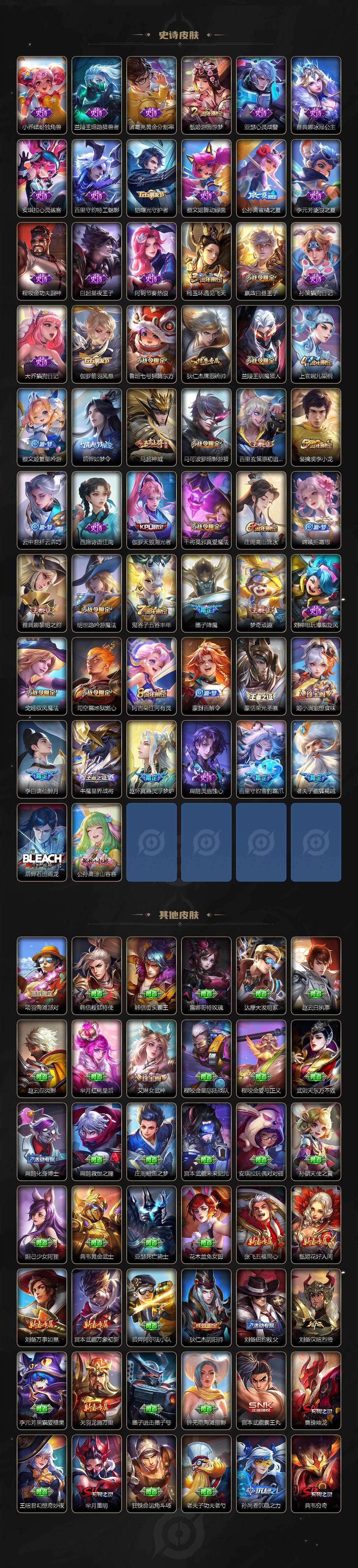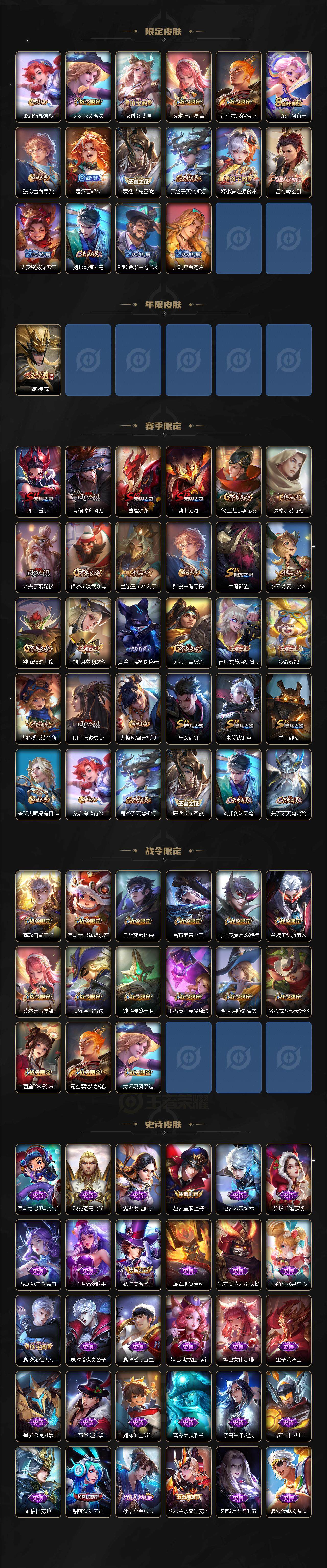 【限定皮肤】:铠冥王哈迪斯,姜子牙天穹之誓,李白谪仙醉月,狄仁杰阴阳师,赵云皇家上将,墨子降魔,嬴政优雅恋人,嬴政白昼王子,孙尚香异界灵契,鲁班七号狮舞东方,庄周高山流水,白起夜都怪侠,芈月重明,吕布猎兽之王,夏侯惇朔风刀,甄姬游园惊梦,曹操烛龙,典韦穷奇,马可波罗暗影游猎,马可波罗深海之息,狄仁杰魔术师,狄仁杰万华元夜,达摩沙漠行僧,项羽海滩派对,老夫子醍醐杖,貂蝉逐梦之音,程咬金演武夺筹,兰陵王驯魔猎人,兰陵王金庭之子,孙悟空至尊宝,孙悟空零号赤焰,牛魔御旌,后羿如梦令,后羿圣弓游侠,李元芳云中旅人,虞姬启明星使,钟馗神迹守卫,钟馗驱傩正仪,杨玉环遇见飞天,干将莫邪真爱魔法,雅典娜黎明之约,蔡文姬繁星吟游,鬼谷子原初探秘者,鬼谷子五谷丰年,诸葛亮武陵仙君,苏烈千军破阵,百里玄策原初追逐者,弈星混沌棋,梦奇顽趣,公孙离蜜橘之夏,沈梦溪大漠名商,明世隐疑决卦,明世隐吟游魔法,裴擒虎李小龙,裴擒虎擒涛扼浪,狂铁御狮,米莱狄御霄,云中君纤云弄巧,伽罗天狼溯光者,盾山御銮,孙策挚爱之约,猪八戒西部大镖客,上官婉儿梁祝,嫦娥拒霜思,西施玲珑珍味,鲁班大师探海日志,桑启海盐诗旅,戈娅驭风魔法,艾琳女武神,艾琳流音漫舞,司空震地狱燃心,阿古朵江河有灵,张良古海寻踪,蒙犽百解令,蒙恬荣光圣徽,鬼谷子天穹祈灯,姬小满妄想食味,吕布曦玄引,沈梦溪龙舞盛年,刘邦剑破天穹,程咬金群星魔术团,周瑜熔金海岸