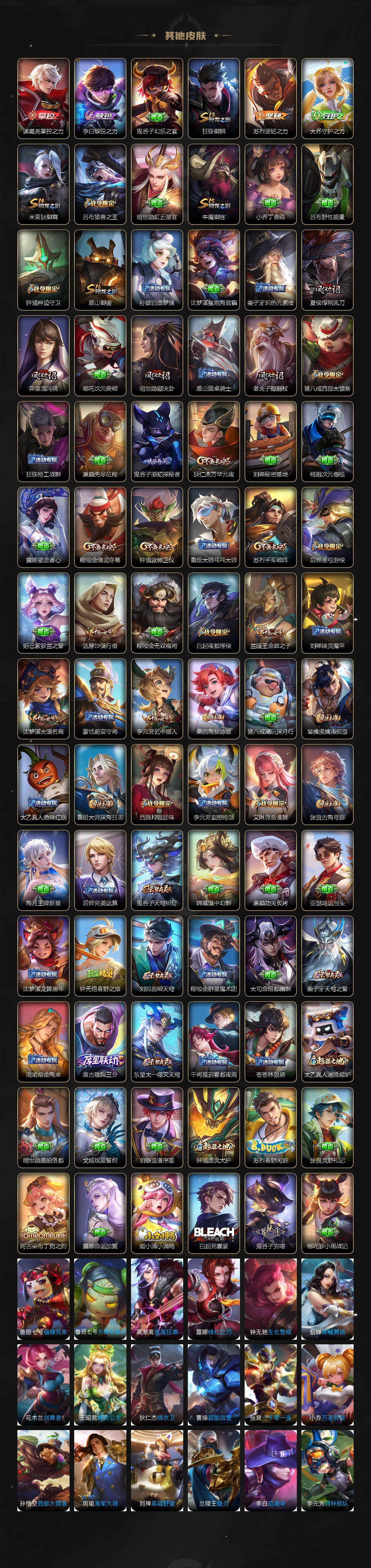 伽罗箭羽风息,李元芳逐浪之夏,大乔猫狗日记,孙策猫狗日记,阿轲节奏热浪,露娜紫霞仙子,诸葛亮黄金分割率,王昭君偶像歌手,韩信白龙吟,项羽苍穹之光,雅典娜冰冠公主,吕布末日机甲,鲁班七号电玩小子,墨子龙骑士,嬴政摇滚巨星,刘禅绅士熊喵,白起星夜王子,安琪拉心灵骇客,程咬金功夫厨神,刘邦德古拉伯爵,兰陵王暗隐猎兽者,曹操幽灵船长,宫本武藏鬼剑武藏,亚瑟心灵战警,蔡文姬舞动绿茵,廉颇地狱岩魂,西施诗语江南,小乔缤纷独角兽,夏侯惇乘风破浪,花木兰水晶猎龙者,铠曙光守护者,墨子金属风暴,百里玄策原初追逐者,吕布圣诞狂欢,貂蝉圣诞恋歌,百里守约特工魅影,嬴政暗夜贵公子,嫦娥拒霜思,雅典娜黎明之约,李白千年之狐,刘禅电玩·爆裂旋风,蒙犽百解令,李白谪仙醉月,赵怀真器灵·浮梦炉