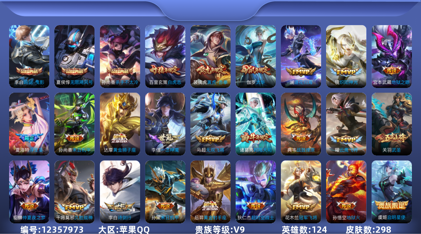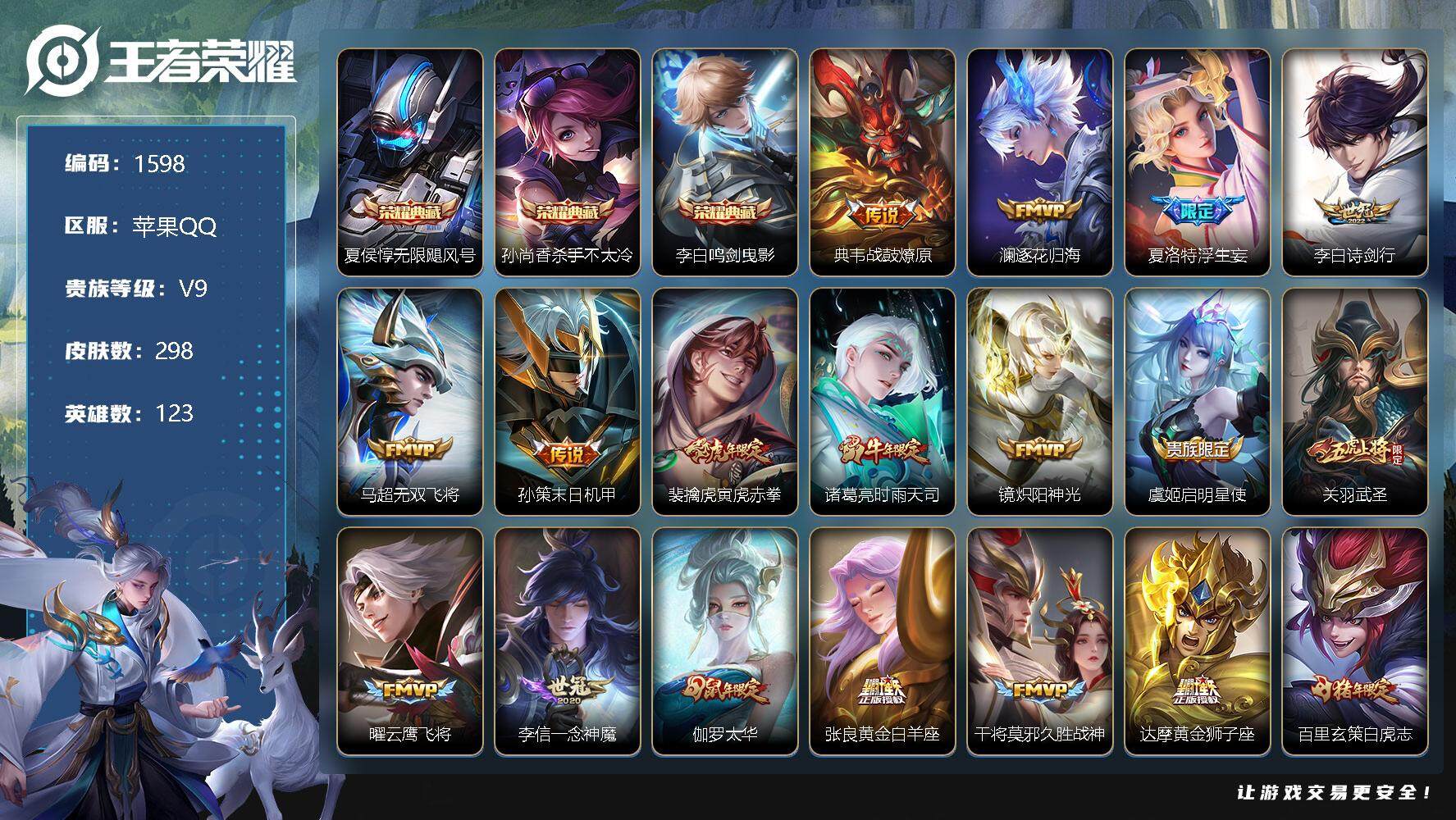 [12357973]【商品标题】:苹果Q-V2-秩序白银II段位-123英雄-298皮肤-3典藏-0珍品无双-0无双-0珍品传说-25传说-94史诗