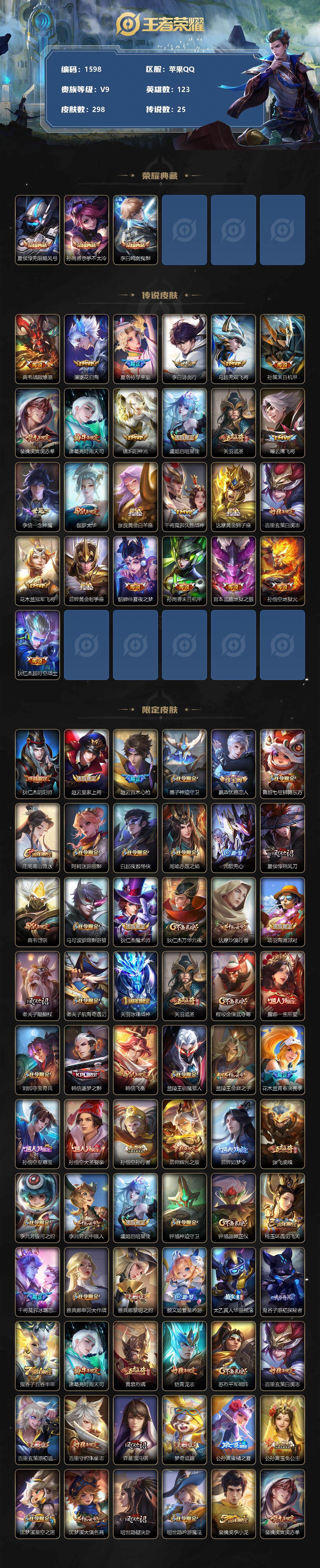 - [11817962]V7 10传说 125英雄 232皮肤 可修改实名 优质装备:云鹰飞将(小将军),末日机甲-孙尚香(绿蚂蚱),地狱火,地狱之眼,无双飞将 传说皮:幻光神枪 珍宝阁皮:优雅恋人,女武神 限定皮:愿照·九州拓(澜年限),逐霄战戟,鸣野蒿,至尊宝,白虎志(电光耗子),凤求凰(白切鸡),冰锋战神,梁祝,逐梦之翼,逐梦之星,李小龙,引擎之心,蜜橘之夏,热情桑巴,山海·玄木吟(马可年限) 史诗皮:器灵·浮梦炉,糖绘人间,化蝶舞,龙之律动,蒙犽顽岩魄,百相守梦-百里守约,百相守梦-黄忠,紫霞仙子,苍穹之光,白龙吟,特工魅影,千年之狐,冰冠公主,偶像歌手,末日机甲-吕布,猫狗日记-孙策,乱世虎臣,节奏热浪,修罗,女仆咖啡,水果甜心,星夜王子,心灵骇客,德古拉伯爵,暗隐猎兽者,鬼剑武藏,心灵战警,舞动绿茵,纤云弄巧,缤纷独角兽,逐浪之夏,水晶猎龙者,金属风暴,圣诞狂欢,圣诞恋歌,鹰眼统帅,暗夜贵公子,滕王阁序