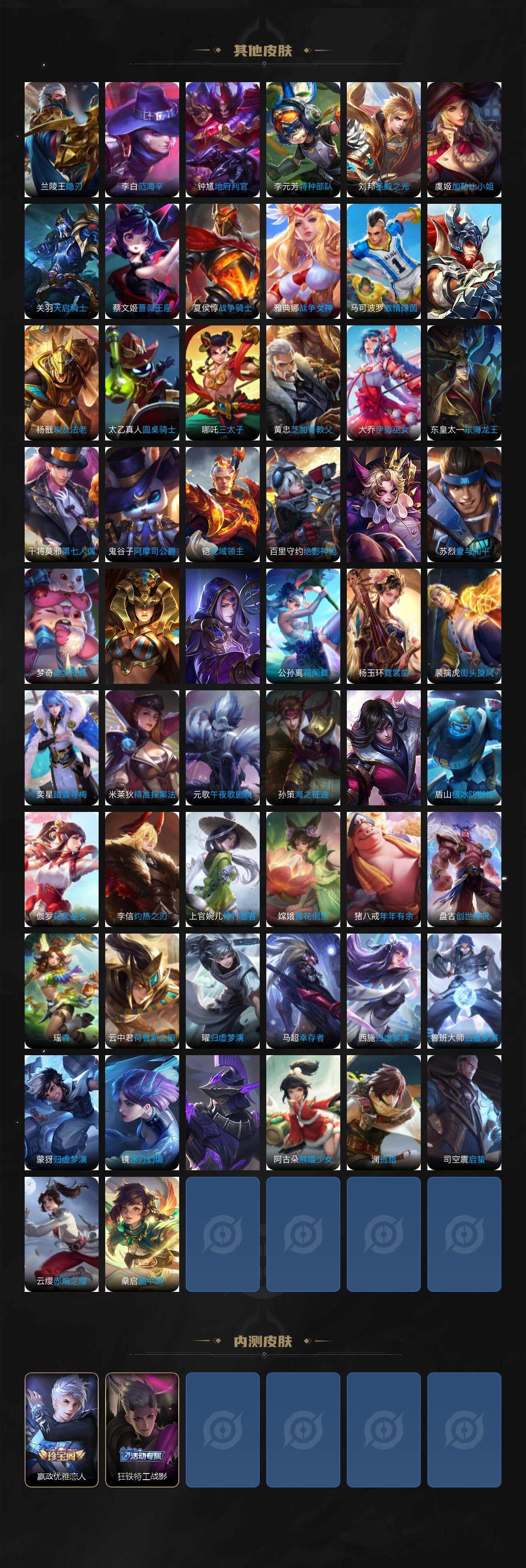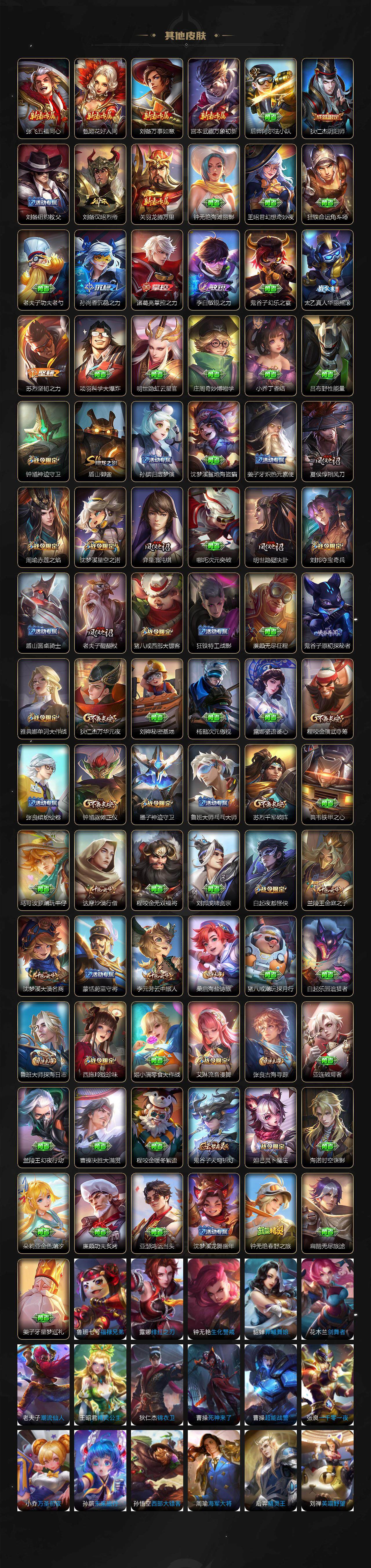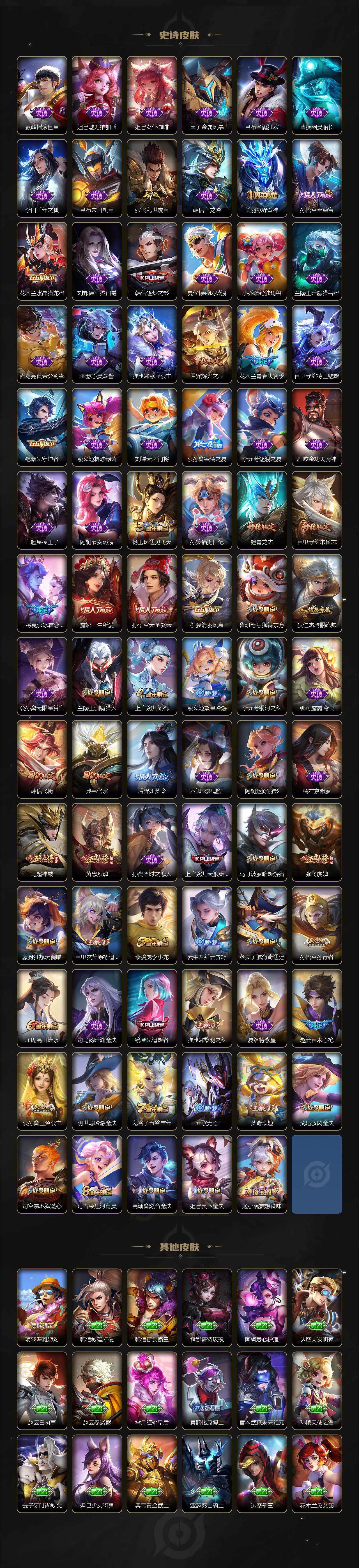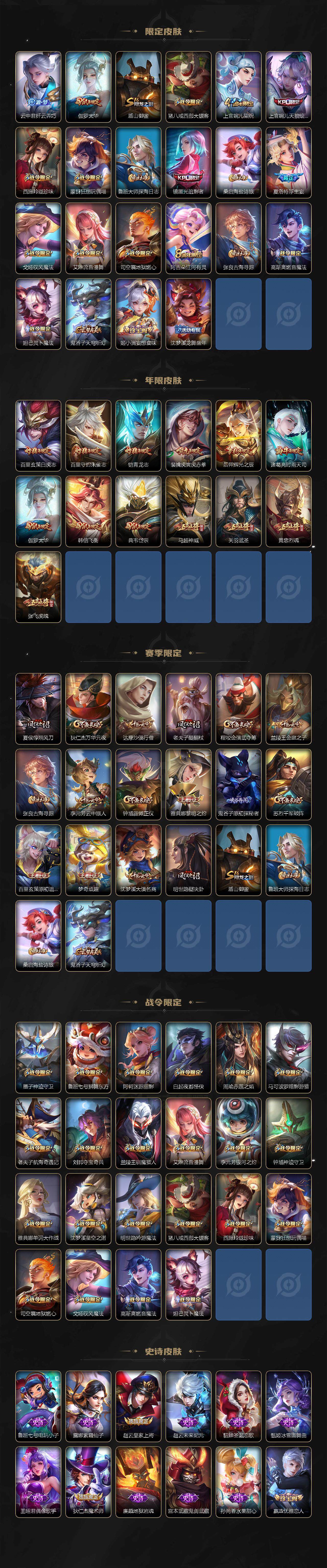 【限定皮肤】:狄仁杰阴阳师,赵云皇家上将,赵云百木心枪,墨子神迹守卫,嬴政优雅恋人,鲁班七号狮舞东方,庄周高山流水,阿轲迷踪丽影,白起夜都怪侠,周瑜赤莲之焰,元歌无心,夏侯惇朔风刀,典韦岱宗,马可波罗暗影游猎,狄仁杰魔术师,狄仁杰万华元夜,达摩沙漠行僧,项羽海滩派对,老夫子醍醐杖,老夫子航海奇遇记,关羽冰锋战神,关羽武圣,程咬金演武夺筹,露娜一生所爱,刘邦夺宝奇兵,韩信逐梦之影,韩信飞衡,兰陵王驯魔猎人,兰陵王金庭之子,花木兰青春决赛季,孙悟空至尊宝,孙悟空大圣娶亲,孙悟空孙行者,后羿辉光之辰,后羿如梦令,张飞虎魄,李元芳银河之约,李元芳云中旅人,虞姬启明星使,钟馗神迹守卫,钟馗驱傩正仪,杨玉环遇见飞天,干将莫邪冰霜恋舞曲,雅典娜单词大作战,雅典娜黎明之约,蔡文姬繁星吟游,太乙真人华丽摇滚,鬼谷子原初探秘者,鬼谷子五谷丰年,诸葛亮时雨天司,黄忠烈魂,铠青龙志,苏烈千军破阵,百里玄策白虎志,百里玄策原初追逐者,百里守约朱雀志,弈星混沌棋,梦奇顽趣,公孙离蜜橘之夏,公孙离玉兔公主,沈梦溪星空之诺,沈梦溪大漠名商,明世隐疑决卦,明世隐吟游魔法,裴擒虎李小龙,裴擒虎寅虎赤拳,云中君纤云弄巧,伽罗太华,盾山御銮,猪八戒西部大镖客,上官婉儿梁祝,上官婉儿天狼绘梦者,西施玲珑珍味,蒙犽狂想玩偶喵,鲁班大师探海日志,镜匿光追影者,桑启海盐诗旅,夏洛特浮生妄,戈娅驭风魔法,艾琳流音漫舞,司空震地狱燃心,阿古朵江河有灵,张良古海寻踪,高渐离燃音魔法,妲己灵卜魔法,鬼谷子天穹祈灯,姬小满妄想食味,沈梦溪龙舞盛年