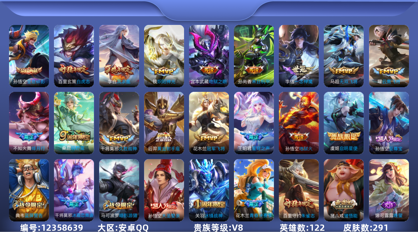 [12358639]【商品标题】:安卓Q-V1-永恒钻石III段位-122英雄-291皮肤-1典藏-0珍品无双-0无双-0珍品传说-16传说-83史诗