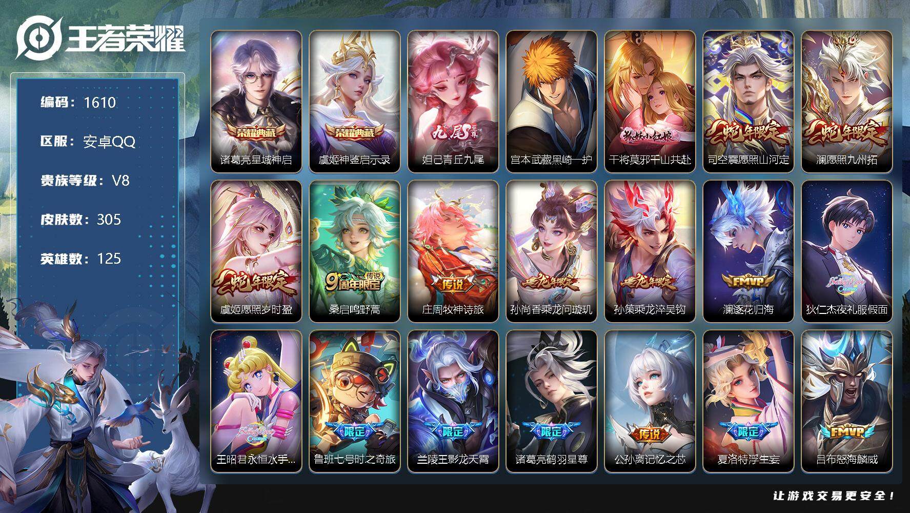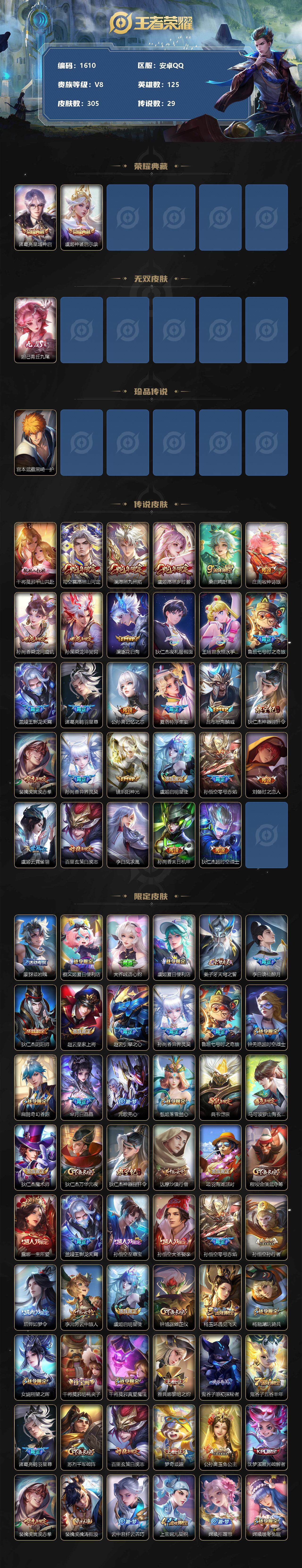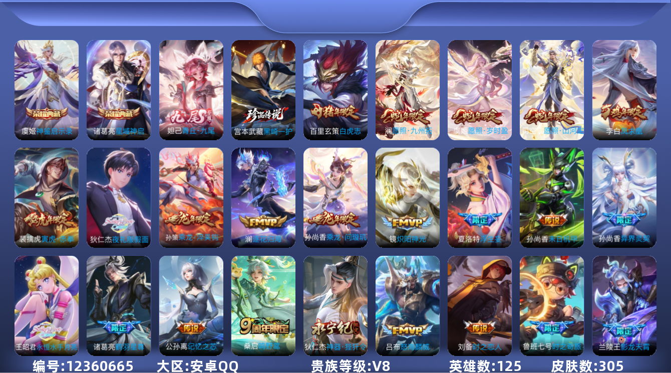 [12360665]【商品标题】:安卓Q-V8-最强王者段位-125英雄-305皮肤-2典藏-0珍品无双-1无双-1珍品传说-29传说-97史诗