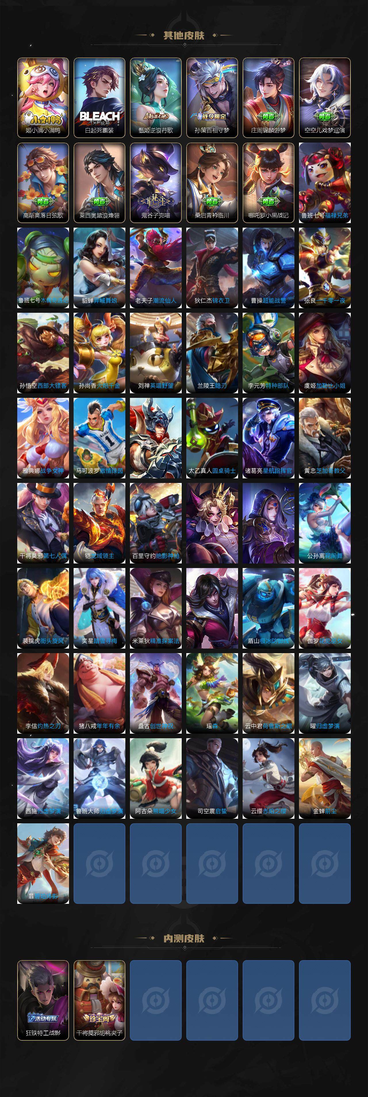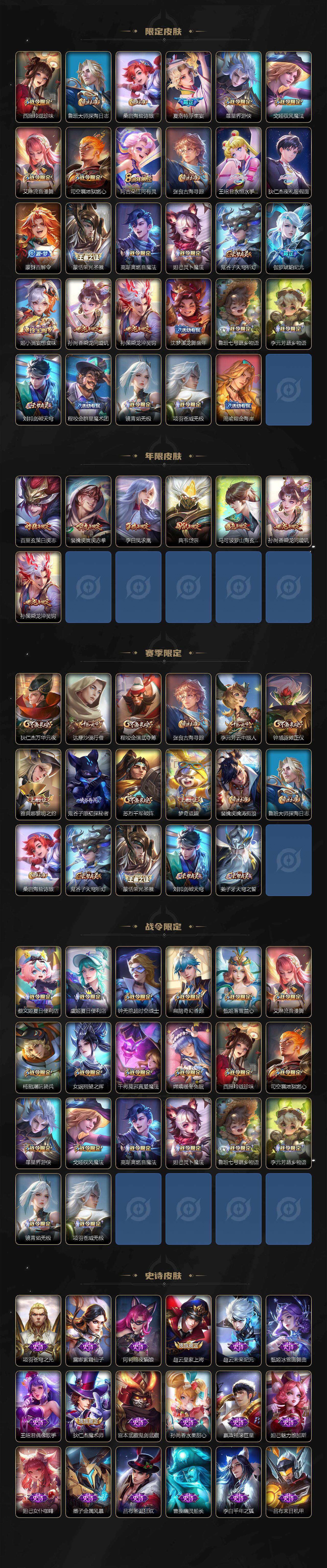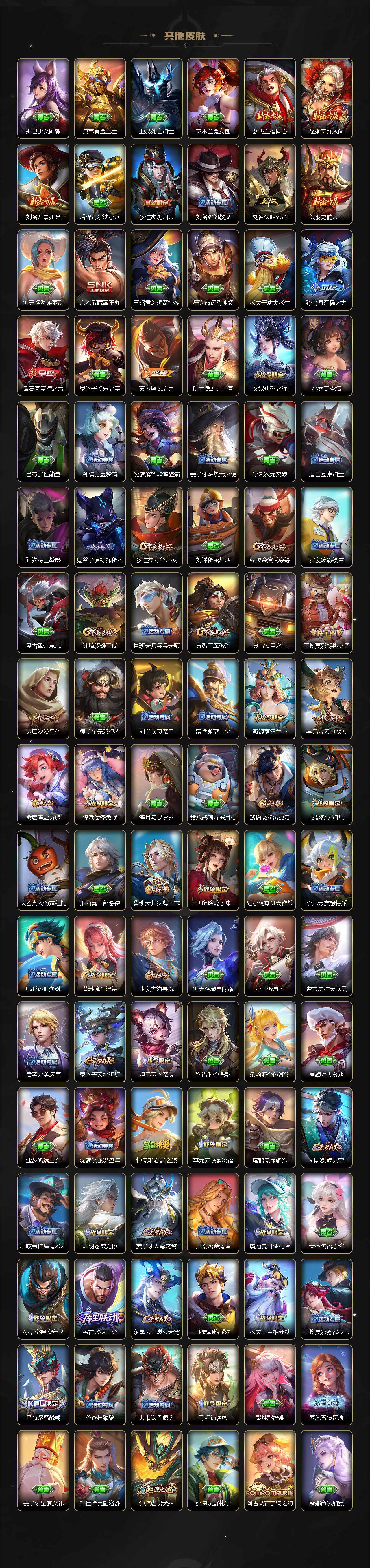 【限定皮肤】:蒙犽顽岩魄,蔡文姬夏日便利店,大乔绒语心约,虞姬夏日便利店,姜子牙天穹之誓,李白谪仙醉月,狄仁杰阴阳师,赵云皇家上将,赵云引擎之心,孙尚香异界灵契,鲁班七号时之奇旅,钟无艳超时空战士,扁鹊奇幻香踪,芈月白晶晶,元歌无心,甄姬落雪兰心,典韦岱宗,马可波罗山海玄木吟,狄仁杰魔术师,狄仁杰万华元夜,狄仁杰神器狴犴令,达摩沙漠行僧,项羽海滩派对,程咬金演武夺筹,露娜一生所爱,兰陵王影龙天霄,孙悟空至尊宝,孙悟空大圣娶亲,孙悟空零号赤焰,孙悟空孙行者,后羿如梦令,李元芳云中旅人,虞姬启明星使,钟馗驱傩正仪,杨玉环遇见飞天,杨戬潮玩骑兵,女娲朔望之晖,干将莫邪胡桃夹子,干将莫邪真爱魔法,雅典娜黎明之约,鬼谷子原初探秘者,鬼谷子五谷丰年,诸葛亮鹤羽星尊,苏烈千军破阵,百里玄策白虎志,梦奇顽趣,公孙离玉兔公主,沈梦溪匿光破解者,裴擒虎寅虎赤拳,裴擒虎擒涛扼浪,云中君纤云弄巧,上官婉儿梁祝,嫦娥拒霜思,嫦娥暖冬兔眠,西施玲珑珍味,鲁班大师探海日志,桑启海盐诗旅,夏洛特浮生妄,暃星界游侠,戈娅驭风魔法,艾琳流音漫舞,司空震地狱燃心,阿古朵江河有灵,张良古海寻踪,王昭君永恒水手月亮,狄仁杰夜礼服假面,蒙犽百解令,蒙恬荣光圣徽,高渐离燃音魔法,妲己灵卜魔法,鬼谷子天穹祈灯,伽罗琥珀纪元,姬小满妄想食味,孙尚香乘龙问璇玑,孙策乘龙淬吴钩,沈梦溪龙舞盛年,鲁班七号蔬乡物语,李元芳蔬乡物语,刘邦剑破天穹,程咬金群星魔术团,镜青焰无极,项羽苍威无极,周瑜熔金海岸