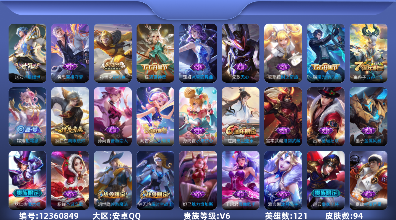 - [10959049]【商品标题】:安卓Q-V1-永恒钻石V段位-125英雄-341皮肤-5典藏-0珍品无双-1无双-0珍品传说-32传说-101史诗 【荣耀典藏】:武则天英雄,夏侯惇无限飓风号,李白鸣剑曳影,花木兰九霄神辉,关羽赤影疾锋,貂蝉幻阙歌 【无双皮肤】:武则天神器明辉仪 【内测皮肤】:嬴政优雅恋人,艾琳女武神,狂铁特工战影 【传说皮肤】:狄仁杰超时空战士,宫本武藏地狱之眼,孙尚香末日机甲,李白凤求凰,貂蝉仲夏夜之梦,后羿黄金射手座,梦奇胖达荣荣,花木兰冠军飞将,貂蝉猫影幻舞,刘备时之恋人,李信一念神魔,曜云鹰飞将,孙悟空零号赤焰,虞姬启明星使,镜炽阳神光,铠绛天战甲,诸葛亮时雨天司,公孙离祈雪灵祝,兰陵王默契交锋,周瑜音你心动,曜李逍遥 ,王昭君乞巧织情,赵云淬星耀世,孙策挚爱之约,李白诗剑行,吕布怒海麟威,曜山海苍雷引,夏洛特浮生妄,公孙离记忆之芯,张飞百相守梦,澜电玩雷克斯,赵云乘龙铭钟鼎 【限定皮肤】:白起狰,狄仁杰阴阳师,虞姬凯尔特女王,赵云皇家上将,墨子神迹守卫,嬴政优雅恋人,嬴政白昼王子,鲁班七号狮舞东方,庄周云端筑梦师,庄周高山流水,扁鹊奇幻香踪,芈月重明,芈月白晶晶,吕布猎兽之王,周瑜真爱至上,元歌云间偶戏,元歌无心,夏侯惇朔风刀,甄姬游园惊梦,曹操烛龙,典韦穷奇,马可波罗逐梦之星,马可波罗暗影游猎,马可波罗山海玄木吟,狄仁杰魔术师,狄仁杰万华元夜,达摩沙漠行僧,项羽海滩派对,项羽霸王别姬,老夫子醍醐杖,老夫子航海奇遇记,关羽冰锋战神,关羽百相守梦,貂蝉逐梦之音,程咬金演武夺筹,露娜一生所爱,韩信逐梦之影,韩信傲雪梅枪,兰陵王默契交锋,兰陵王金庭之子,花木兰青春决赛季,花木兰瑞麟志,花木兰默契交锋,亚瑟潮玩骑士王,孙悟空至尊宝,孙悟空零号赤焰,牛魔御旌,刘备百相守梦,张飞百相守梦,李元芳云中旅人,虞姬霸王别姬,虞姬启明星使,钟馗神迹守卫,钟馗驱傩正仪,杨戬潮玩骑兵,雅典娜单词大作战,蔡文姬繁星吟游,太乙真人饕餮,鬼谷子原初探秘者,诸葛亮时雨天司,大乔白鹤梁神女,苏烈玄武志,苏烈千军破阵,百里守约朱雀志,弈星混沌棋,公孙离祈雪灵祝,沈梦溪大漠名商,沈梦溪匿光破解者,明世隐疑决卦,裴擒虎天狼狩猎者,裴擒虎李小龙,裴擒虎擒涛扼浪,狂铁御狮,米莱狄御霄,云中君纤云弄巧,云中君时之祈愿,盾山御銮,孙策挚爱之约,猪八戒西部大镖客,上官婉儿梁祝,嫦娥拒霜思,嫦娥暖冬兔眠,