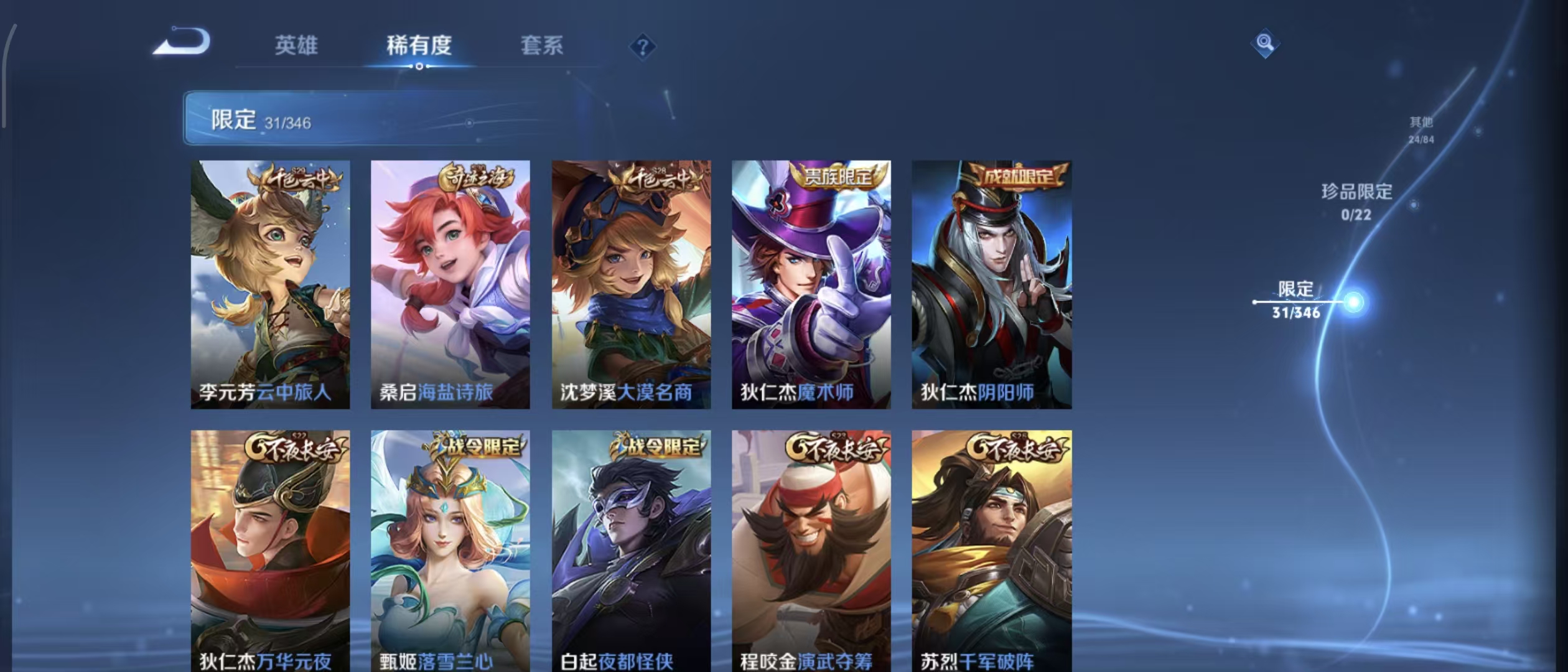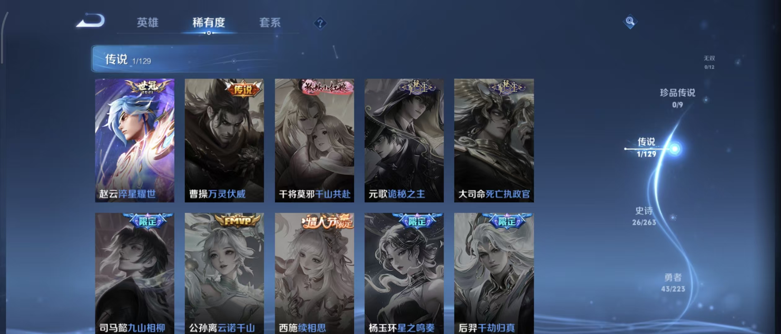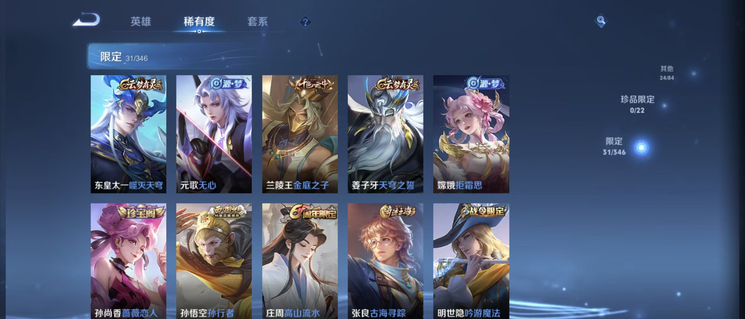 - PX_2104967-Q/尊贵铂金/255皮肤/124英雄/2典藏/0珍品无双/0无双/0珍品传说/17传说/78史诗/8稀有英雄 【2 典藏皮肤】银白咏叹调 铠,无限飓风号 夏侯惇, 【17 传说皮肤】武圣 关羽,启明星使 虞姬,李逍遥 曜,零号·赤焰 孙悟空,永曜之星 杨戬,诗剑行 李白,鹤羽星尊 诸葛亮,炽阳神光 镜,时之恋人 刘备,黄金狮子座 达摩,久胜战神 干将莫邪,末日机甲 孙策,山