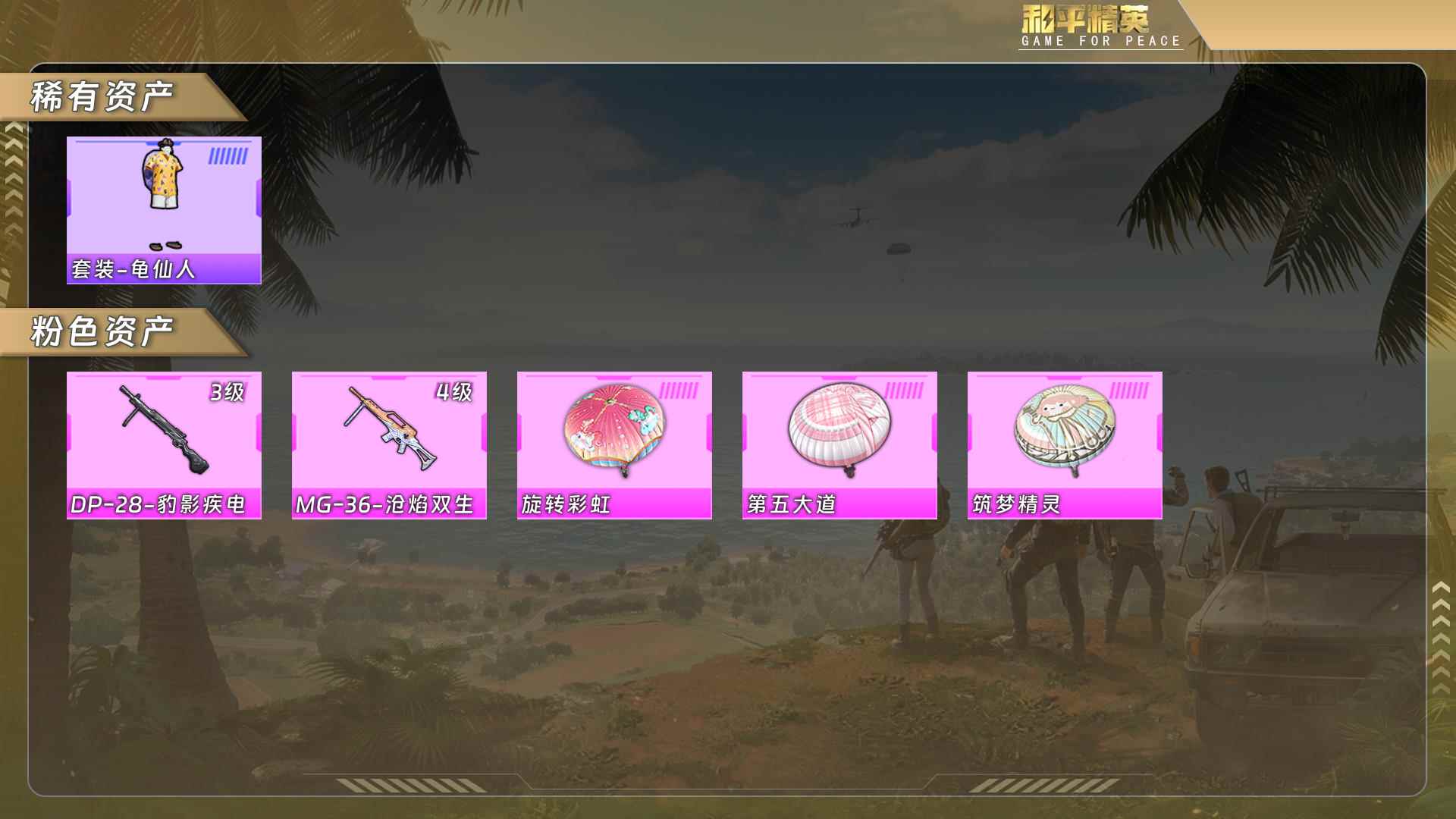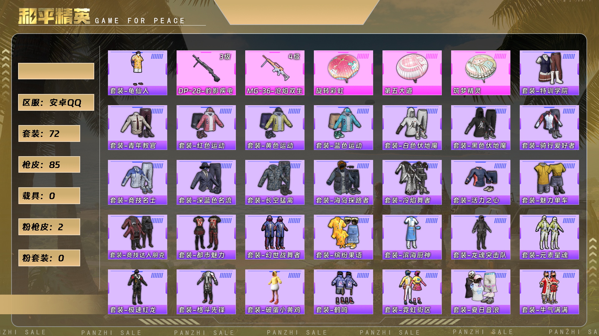- [12043734]【特价急出/详情看图】:安卓 手Q-3粉装-1特效枪-1.5w热力值-4王牌印记-41套装-48枪皮【热门品类】:套装-龟仙人【粉色套装】:粉装-天使彩虹糖,粉装-飒粉甜心,角色-天穹【粉色枪皮等级】:DP-28-豹影疾电(五级)