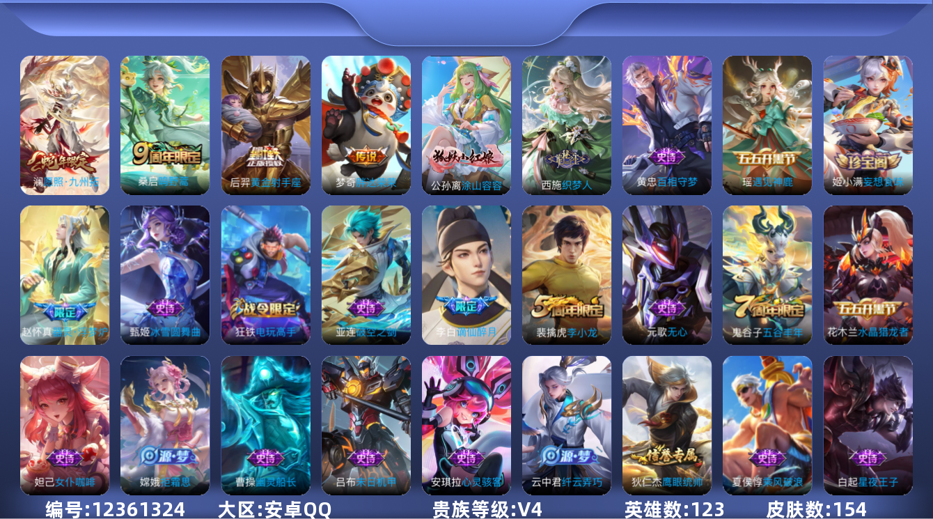 [12361324]【商品标题】:安卓Q-V4-最强王者段位-123英雄-154皮肤-0典藏-0珍品无双-0无双-0珍品传说-4传说-38史诗