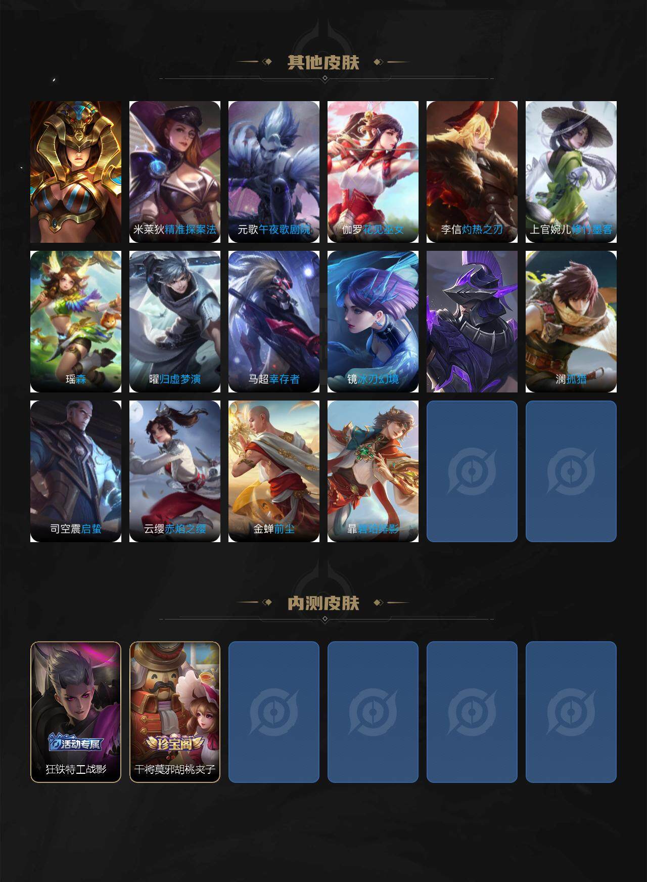【其他皮肤】:项羽海滩派对,韩信教廷特使,韩信街头霸王,阿轲爱心护理,赵云白执事,赵云忍炎影,白起白色死神,牛魔西部大镖客,扁鹊化身博士,宫本武藏未来纪元,孙膑天使之翼,妲己少女阿狸,典韦黄金武士,亚瑟死亡骑士,达摩拳王,花木兰兔女郎,宫本武藏万象初新,后羿阿尔法小队,狄仁杰阴阳师,刘备纽约教父,刘备汉昭烈帝,关羽龙腾万里,钟无艳海滩丽影,老夫子功夫老勺,苏烈坚韧