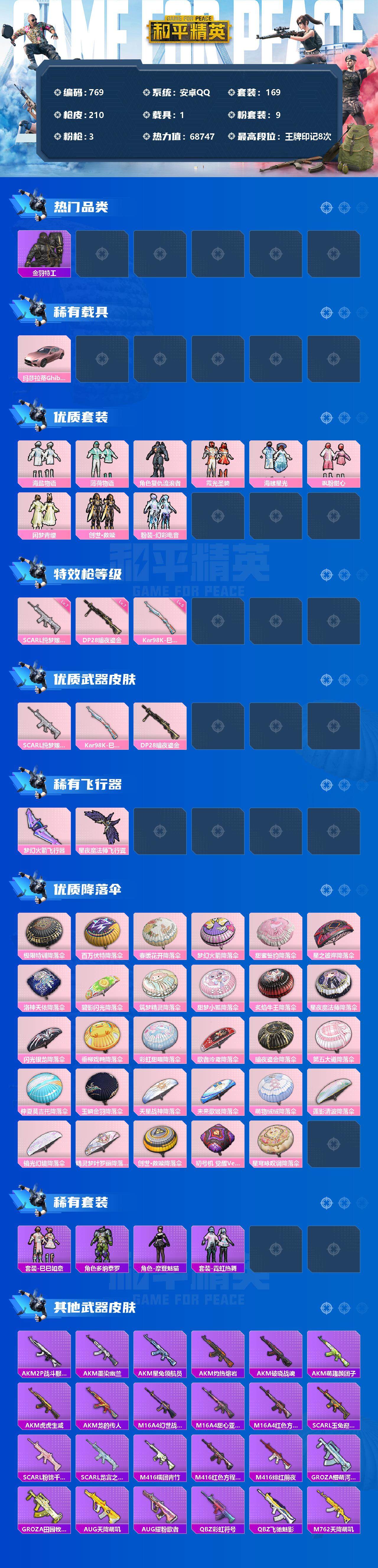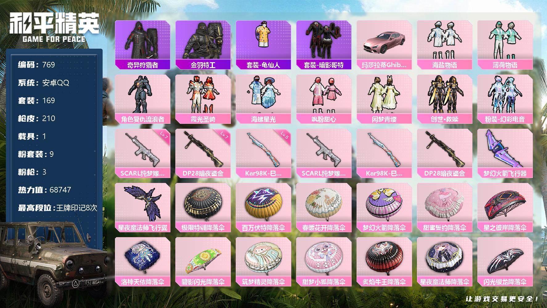 [12361984]【商品标题】:安卓 手Q-9粉装-3特效枪-1载具-2粉色飞行器-68747热力值-8王牌印记-169套装-210枪皮 【热门品类】:套装-奇异狩猎者,套装-金羽特工,套装-龟仙人,套装-暗影哥特 【粉色载具】:玛莎拉蒂Ghibli(粉) 【粉色套装】:粉装-海盐物语,粉装-薄荷物语,角色-复仇流浪者,粉装-霞光圣骑,粉装-海螺星光,粉装-飒粉甜心,粉装-闲梦青缨,套装-创世·救赎,粉装-幻彩电音 【粉色枪皮等级】:SCAR-L-纯梦嫁纱(七级),Kar98K-巳巳如意(五级),DP-28-暗夜鎏金(七级) 【粉色枪皮】:SCAR-L-纯梦嫁纱,Kar98K-巳巳如意,DP-28-暗夜鎏金 【粉色飞行器】:梦幻火箭飞行器,星夜魔法师飞行翼 【粉色降落伞】:极限特训降落伞,百万伏特降落伞,春暖花开降落伞,梦幻火箭降落伞,甜蜜誓约降落伞,星之彼岸降落伞,洛神天依降落伞,碧影闪光降落伞,筑梦精灵降落伞,甜梦小狐降落伞,炙焰牛王降落伞,星夜魔法师降落伞,闪光银龙降落伞,垂柳戏鸭降落伞,彩虹甜喵降落伞,歌者泠鸢降落伞,暗夜鎏金降落伞,第五大道降落伞,仲夏莫吉托降落伞,玉鳞金羽降落伞,天星战神降落伞,未来歌姬降落伞,萌物绒绒降落伞,莲影清波降落伞,镜光幻境降落伞,精灵梦叶罗丽降落伞,创世·救赎降落伞,初号机 觉醒Ver.降落伞,星穹咏叹调降落伞 【稀有套装】:套装-龟仙人,套装-巳巳如意,角色-多纳泰罗,角色-摩登魅猫,套装-霓虹热舞 【稀有枪皮】:AKM-2P战斗服款,AKM-墨染幽兰,AKM-星兔领航员,AKM-灼热熔岩,AKM-破晓战魂,AKM-萌趣颜团子,AKM-虎虎生威,AKM-龙的传人,M16A4-幻世战舞者,M16A4-甜心亚梦,M16A4-红色方程式,SCAR-L-玉兔迎春,SCAR-L-粉锦千层,SCAR-L-龙宫之主,M416-糯团青竹,M416-红色方程式,M416-绯红前夜,GROZA-懵萌河马,GROZA-田园牧歌,AUG-天降萌叽,AUG-耀粉歌者,QBZ-彩虹符号,QBZ-飞驰魅影,M762-天降萌叽,M762-彩虹甜喵,M762-瑞龙福将,Mk47-妙红点点,G36C-懵萌河马,G36C-炙焰牛王,AC-VAL-天降萌叽,AC-VAL-彩虹甜喵,AC-VAL-快闪甜心,AC-VAL-甜心亚梦,蜜獾-垂柳戏鸭,蜜獾-天降萌叽,蜜獾-娇憨猪猪,UZ