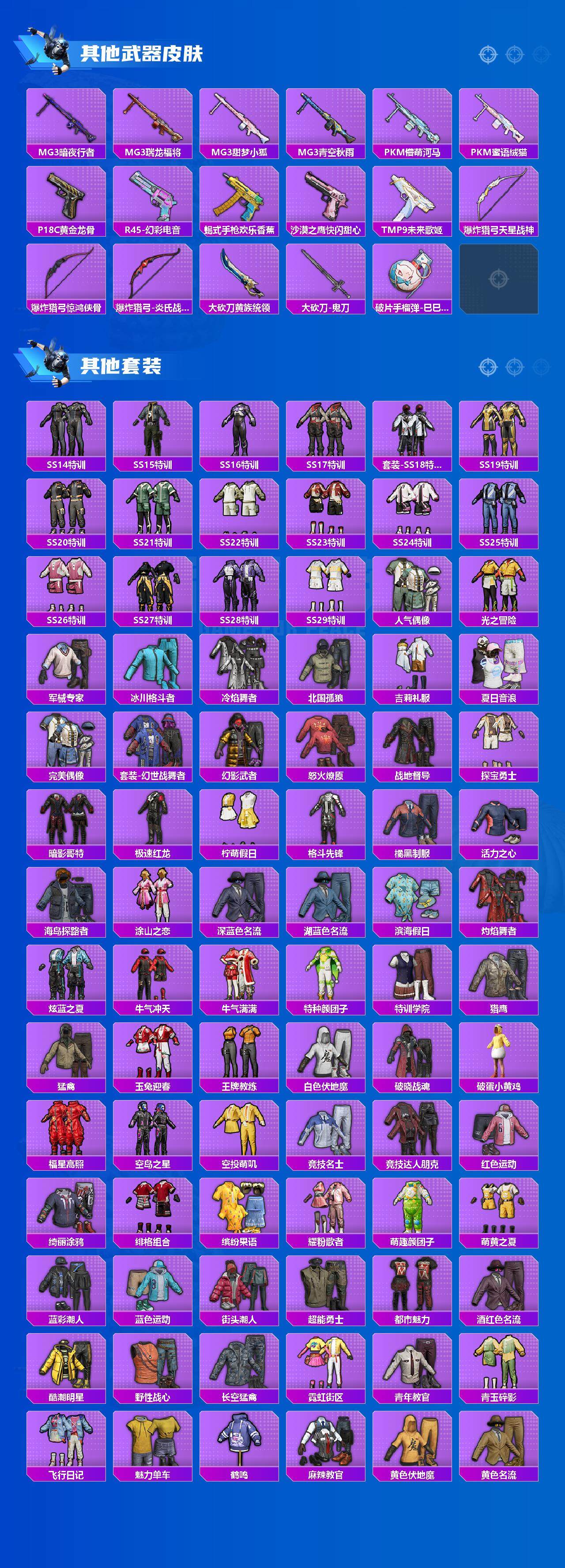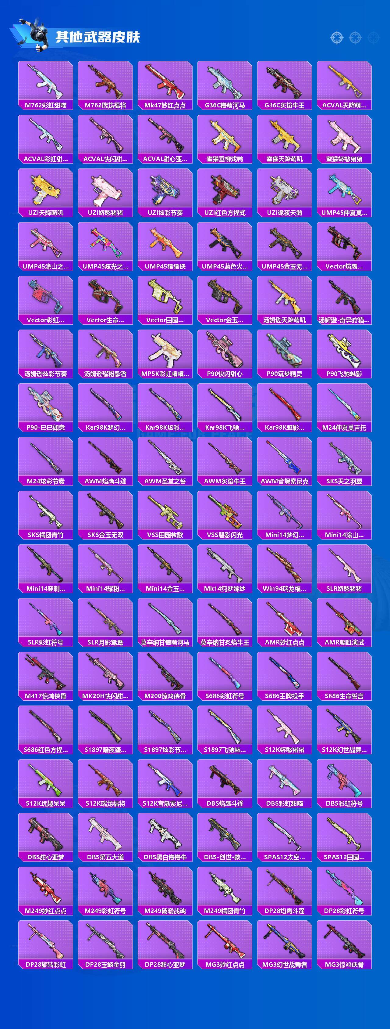 【稀有枪皮】:AKM-2P战斗服款,AKM-墨染幽兰,AKM-星兔领航员,AKM-灼热熔岩,AKM-破晓战魂,AKM-萌趣颜团子,AKM-虎虎生威,AKM-龙的传人,M16A4-幻世战舞者,M16A4-甜心亚梦,M16A4-红色方程式,SCAR-L-玉兔迎春,SCAR-L-粉锦千层,SCAR-L-龙宫之主,M416-糯团青竹,M416-红色方程式,M416-绯红前夜,GROZA-懵萌河马,GROZA-田园牧歌,AUG-天降萌叽,AUG-耀粉歌者,QBZ-彩虹符号,QBZ-飞驰魅影,M762-天降萌叽,M762-彩虹甜喵,M762-瑞龙福将,Mk47-妙红点点,G36C-懵萌河马,G36C-炙焰牛王,AC-VAL-天降萌叽,AC-VAL-彩虹甜喵,AC-VAL-快闪甜心,AC-VAL-甜心亚梦,蜜獾-垂柳戏鸭,蜜獾-天降萌叽,蜜獾-娇憨猪猪,UZ
