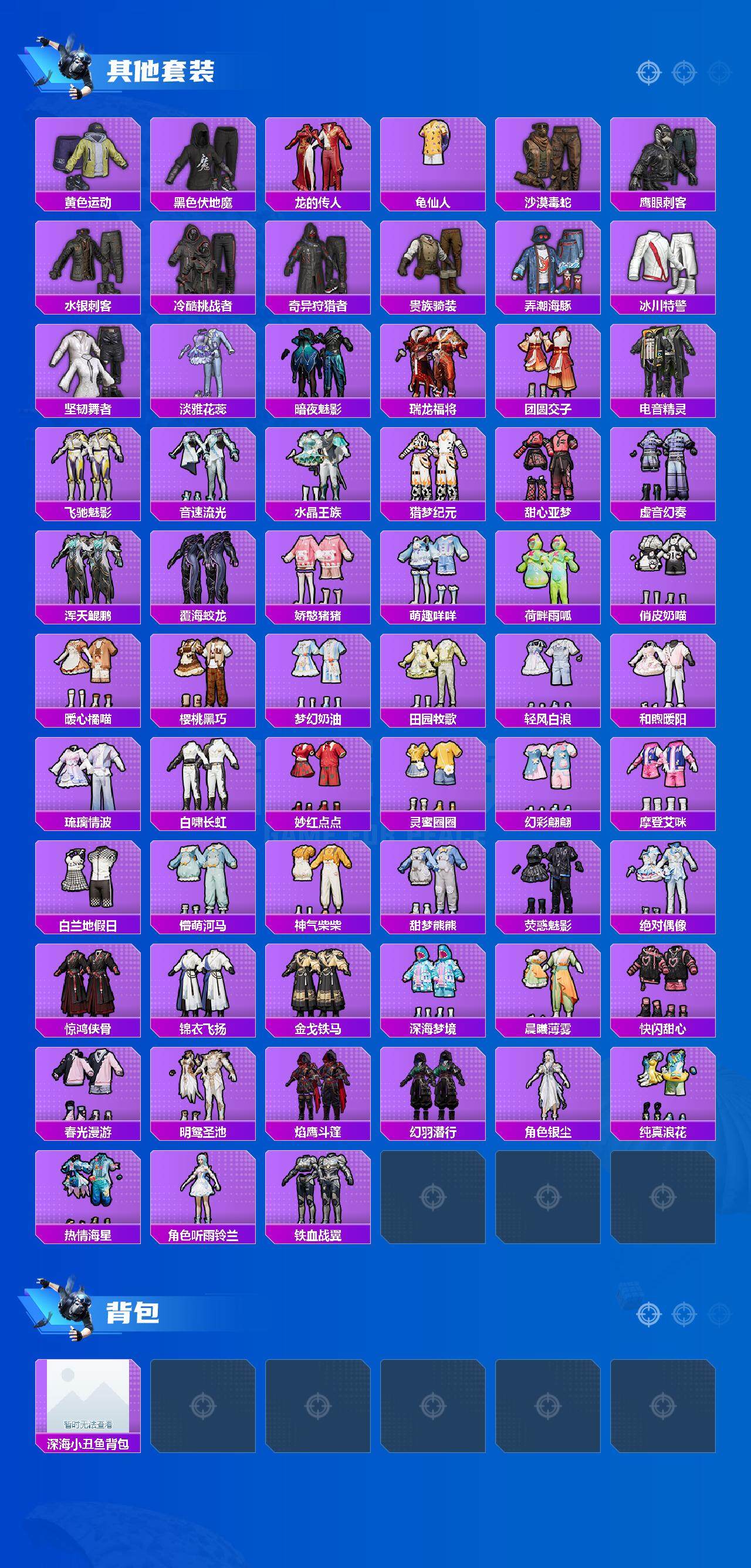 【粉色套装】:粉装-海盐物语,粉装-薄荷物语,角色-复仇流浪者,粉装-霞光圣骑,粉装-海螺星光,粉装-飒粉甜心,粉装-闲梦青缨,套装-创世·救赎,粉装-幻彩电音