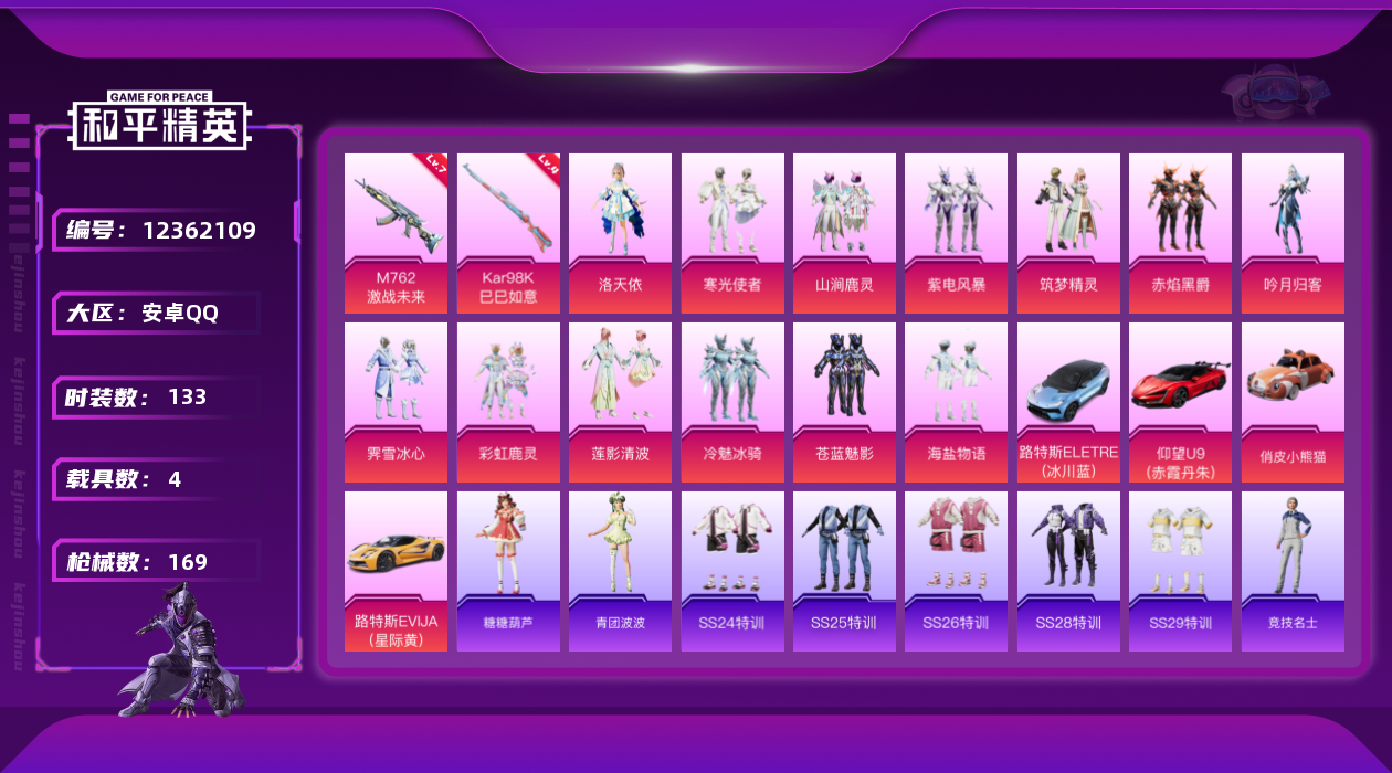 [12362109]【商品标题】:安卓 手Q-14粉装-3特效枪-4载具-3粉色飞行器-62459热力值-5王牌印记-133套装-169枪皮