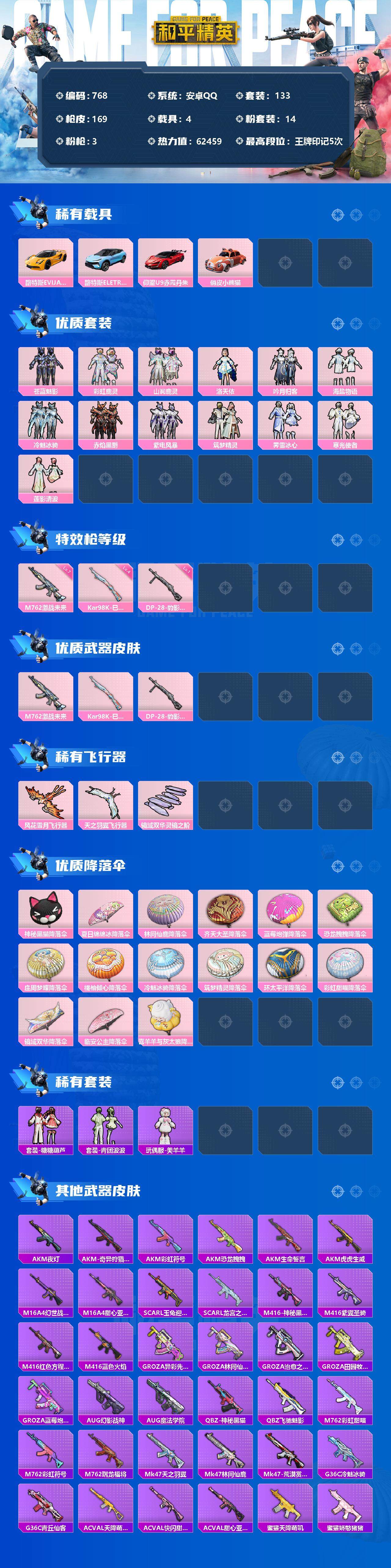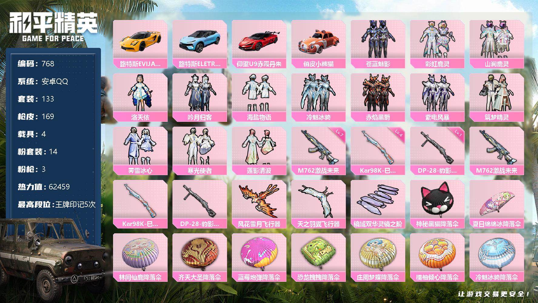 [12362109]【商品标题】:安卓 手Q-14粉装-3特效枪-4载具-3粉色飞行器-62459热力值-5王牌印记-133套装-169枪皮 【粉色载具】:路特斯EVIJA(星际黄),路特斯ELETRE(冰川蓝),仰望U9(赤霞丹朱),俏皮小熊猫 【粉色套装】:粉装-苍蓝魅影,粉装-彩虹鹿灵,粉装-山涧鹿灵,角色-洛天依,粉装-吟月归客,粉装-海盐物语,粉装-冷魅冰骑,粉装-赤焰黑爵,粉装-紫电风暴,粉装-筑梦精灵,粉装-霁雪冰心,粉装-寒光使者,粉装-莲影清波 【粉色枪皮等级】:M762-激战未来(七级),Kar98K-巳巳如意(四级),DP-28-豹影疾电(一级) 【粉色枪皮】:M762-激战未来,Kar98K-巳巳如意,DP-28-豹影疾电 【粉色飞行器】:风花雪月飞行器,天之羽翼飞行器,镜域双华-灵镜之阶 【粉色降落伞】:神秘黑猫降落伞,夏日绵绵冰降落伞,林间仙鹿降落伞,齐天大圣降落伞,蓝莓炮弹降落伞,恐龙拽拽降落伞,庄周梦蝶降落伞,橘柚倾心降落伞,冷魅冰骑降落伞,筑梦精灵降落伞,环太平洋降落伞,彩虹甜喵降落伞,镜域双华降落伞,临安公主降落伞,喜羊羊与灰太狼降落伞 【稀有套装】:套装-糖糖葫芦,套装-青团波波,玩偶服-美羊羊 【稀有枪皮】:AKM-夜灯,AKM-奇异狩猎者,AKM-彩虹符号,AKM-恐龙拽拽,AKM-生命誓言,AKM-虎虎生威,M16A4-幻世战舞者,M16A4-甜心亚梦,SCAR-L-玉兔迎春,SCAR-L-龙宫之主,M416-神秘黑猫,M416-紫翼圣骑,M416-红色方程式,M416-蓝色火焰,GROZA-异彩先驱,GROZA-林间仙鹿,GROZA-治愈之星,GROZA-田园牧歌,GROZA-蓝莓炮弹,AUG-幻影战神,AUG-魔法学院,QBZ-神秘黑猫,QBZ-飞驰魅影,M762-彩虹甜喵,M762-彩虹符号,M762-瑞龙福将,Mk47-天之羽翼,Mk47-林间仙鹿,Mk47-荒漠赏金,G36C-冷魅冰骑,G36C-青丘仙客,AC-VAL-天降萌叽,AC-VAL-快闪甜心,AC-VAL-甜心亚梦,蜜獾-天降萌叽,蜜獾-娇憨猪猪,Famas-镜域双华,UZI-娇憨猪猪,UZI-炫彩节奏,UZI-生命誓言,UMP45-夜灯,UMP45-生命誓言,Vector-焰鹰斗篷,Vector-彩虹符号,Vector-治愈之星,Vector-田园牧歌,汤姆逊-天降萌