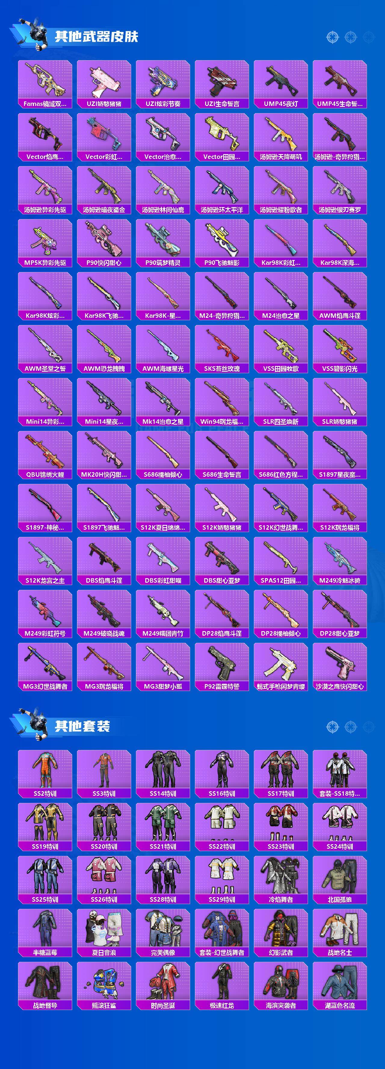 【稀有枪皮】:AKM-夜灯,AKM-奇异狩猎者,AKM-彩虹符号,AKM-恐龙拽拽,AKM-生命誓言,AKM-虎虎生威,M16A4-幻世战舞者,M16A4-甜心亚梦,SCAR-L-玉兔迎春,SCAR-L-龙宫之主,M416-神秘黑猫,M416-紫翼圣骑,M416-红色方程式,M416-蓝色火焰,GROZA-异彩先驱,GROZA-林间仙鹿,GROZA-治愈之星,GROZA-田园牧歌,GROZA-蓝莓炮弹,AUG-幻影战神,AUG-魔法学院,QBZ-神秘黑猫,QBZ-飞驰魅影,M762-彩虹甜喵,M762-彩虹符号,M762-瑞龙福将,Mk47-天之羽翼,Mk47-林间仙鹿,Mk47-荒漠赏金,G36C-冷魅冰骑,G36C-青丘仙客,AC-VAL-天降萌叽,AC-VAL-快闪甜心,AC-VAL-甜心亚梦,蜜獾-天降萌叽,蜜獾-娇憨猪猪,Famas-镜域双华,UZI-娇憨猪猪,UZI-炫彩节奏,UZI-生命誓言,UMP45-夜灯,UMP45-生命誓言,Vector-焰鹰斗篷,Vector-彩虹符号,Vector-治愈之星,Vector-田园牧歌,汤姆逊-天降萌