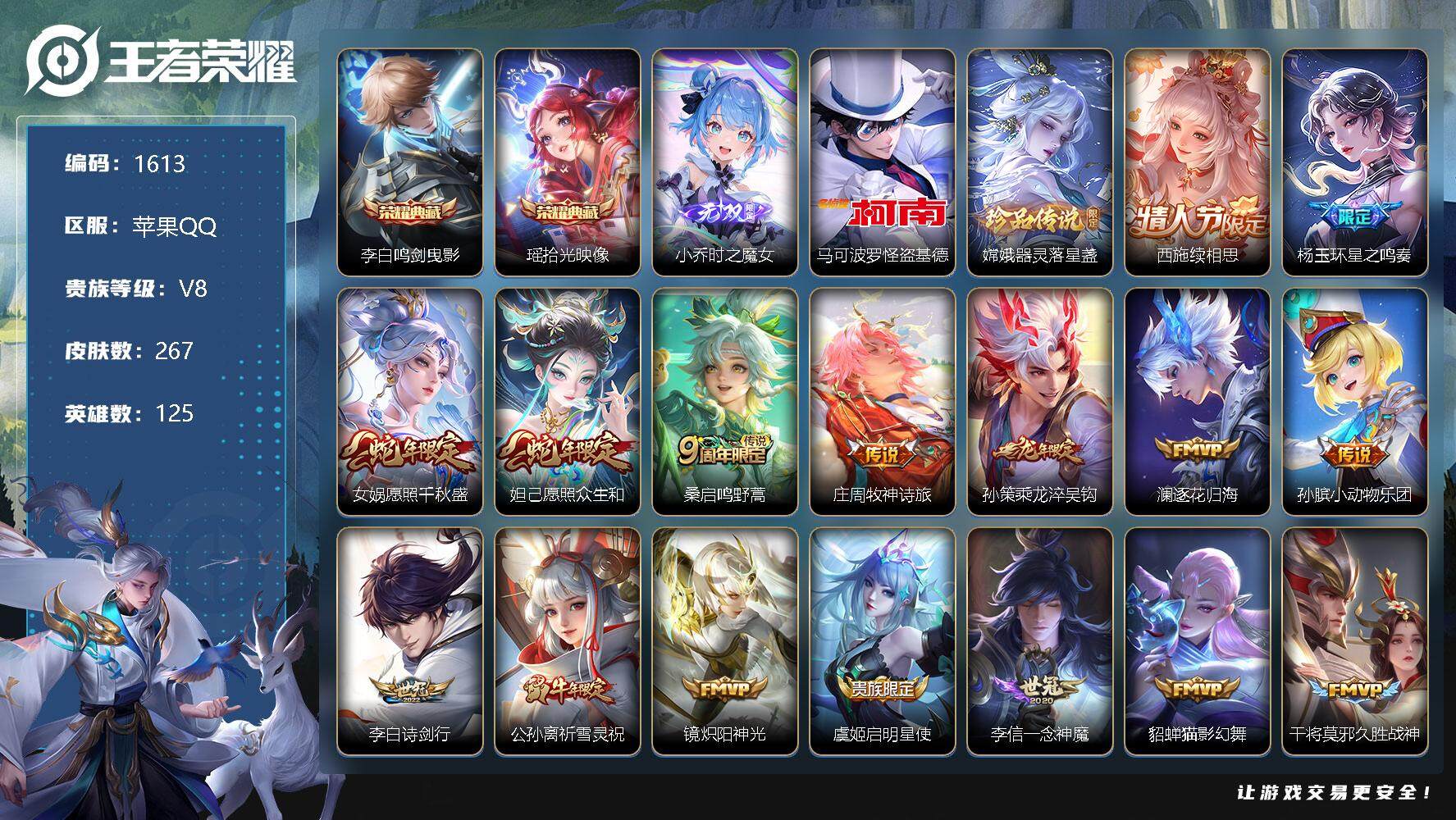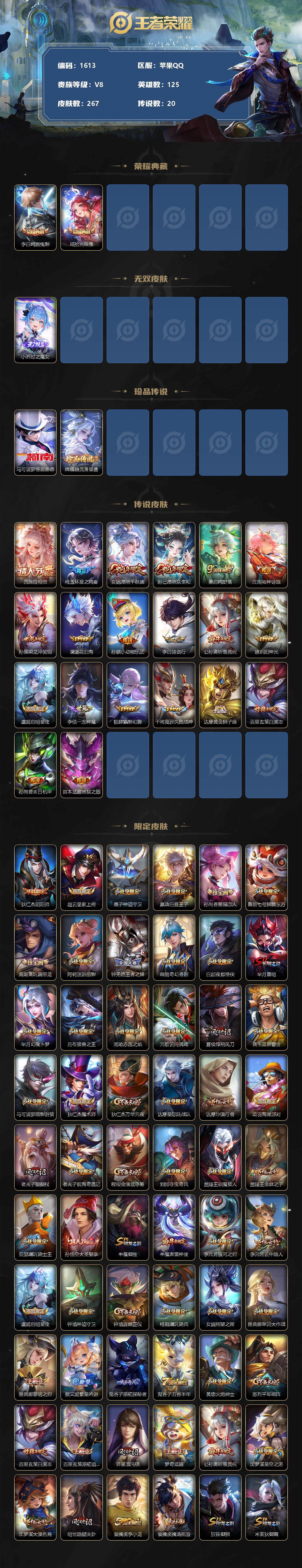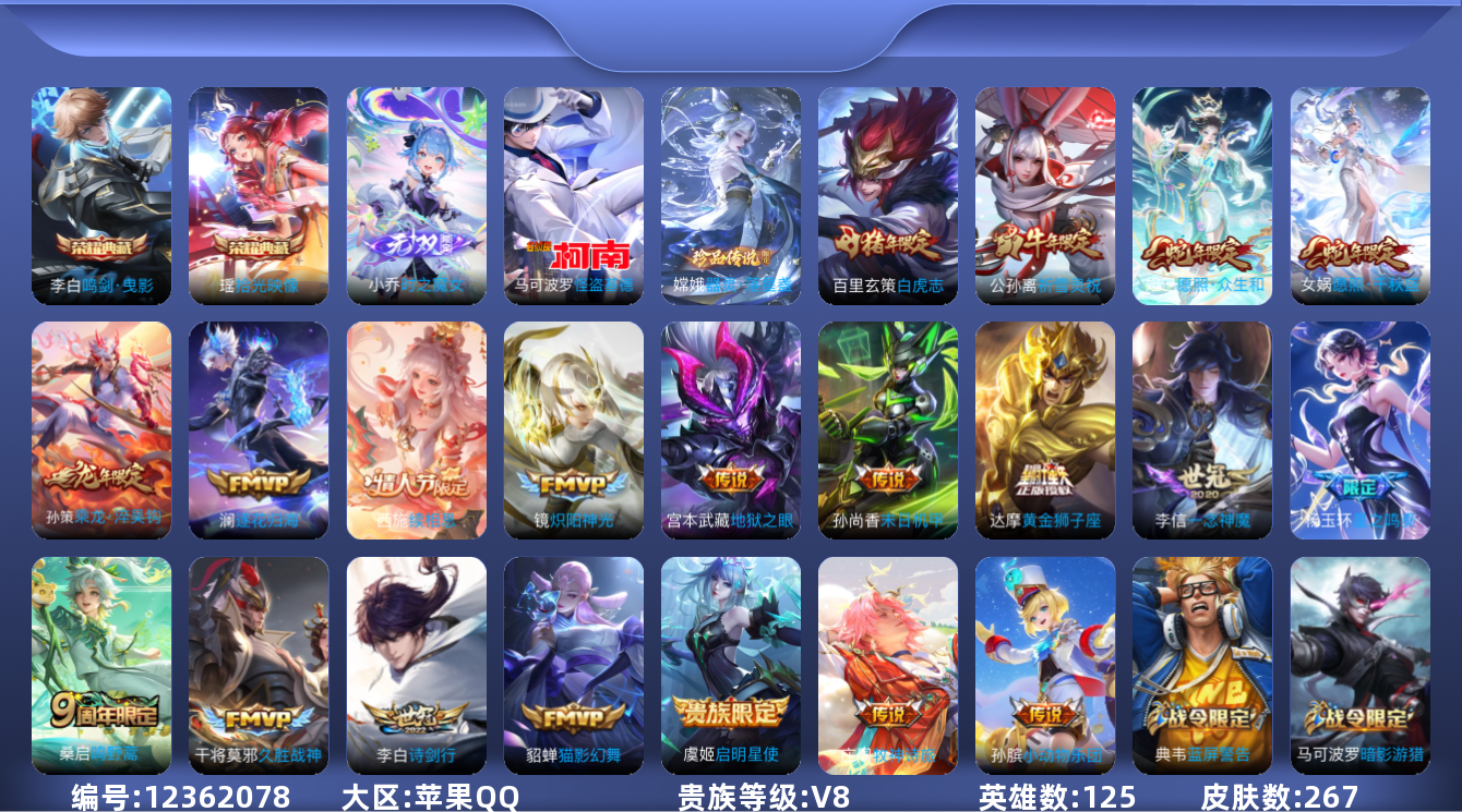[12362078]【商品标题】:苹果Q-V8-永恒钻石I段位-125英雄-267皮肤-2典藏-0珍品无双-1无双-2珍品传说-20传说-76史诗