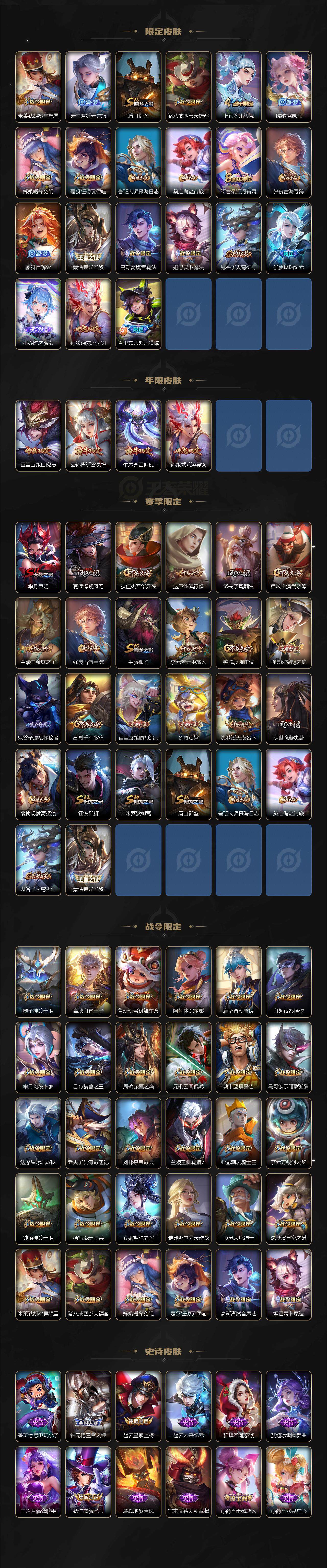 【限定皮肤】:狄仁杰阴阳师,赵云皇家上将,墨子神迹守卫,嬴政白昼王子,孙尚香蔷薇恋人,鲁班七号狮舞东方,高渐离玩趣恶龙,阿轲迷踪丽影,钟无艳王者之锤,扁鹊奇幻香踪,白起夜都怪侠,芈月重明,芈月幻夜卜梦,吕布猎兽之王,周瑜赤莲之焰,元歌云间偶戏,夏侯惇朔风刀,典韦蓝屏警告,马可波罗暗影游猎,狄仁杰魔术师,狄仁杰万华元夜,达摩星际陆战队,达摩沙漠行僧,项羽海滩派对,老夫子醍醐杖,老夫子航海奇遇记,程咬金演武夺筹,刘邦夺宝奇兵,兰陵王驯魔猎人,兰陵王金庭之子,亚瑟潮玩骑士王,孙悟空大圣娶亲,牛魔御旌,牛魔奔雷神使,李元芳银河之约,李元芳云中旅人,虞姬启明星使,钟馗神迹守卫,钟馗驱傩正仪,杨戬潮玩骑兵,女娲朔望之晖,雅典娜单词大作战,雅典娜黎明之约,蔡文姬繁星吟游,鬼谷子原初探秘者,鬼谷子五谷丰年,黄忠火炮绅士,苏烈千军破阵,百里玄策白虎志,百里玄策原初追逐者,弈星混沌棋,梦奇顽趣,公孙离祈雪灵祝,沈梦溪星空之诺,沈梦溪大漠名商,明世隐疑决卦,裴擒虎李小龙,裴擒虎擒涛扼浪,狂铁御狮,米莱狄御霄,米莱狄胡桃异想国,云中君纤云弄巧,盾山御銮,猪八戒西部大镖客,上官婉儿梁祝,嫦娥拒霜思,嫦娥暖冬兔眠,蒙犽狂想玩偶喵,鲁班大师探海日志,桑启海盐诗旅,阿古朵江河有灵,张良古海寻踪,蒙犽百解令,蒙恬荣光圣徽,高渐离燃音魔法,妲己灵卜魔法,鬼谷子天穹祈灯,伽罗琥珀纪元,小乔时之魔女,孙策乘龙淬吴钩,百里玄策超元猎域