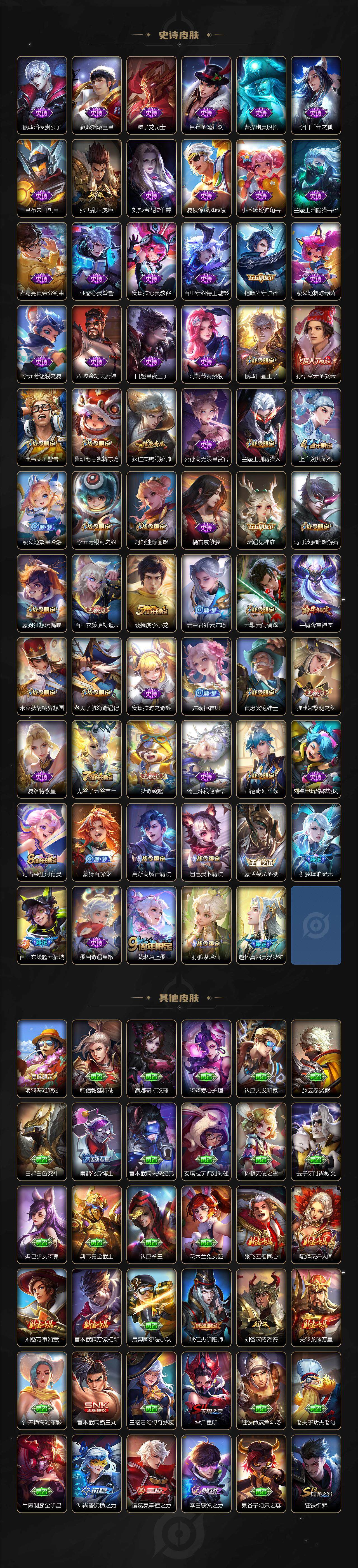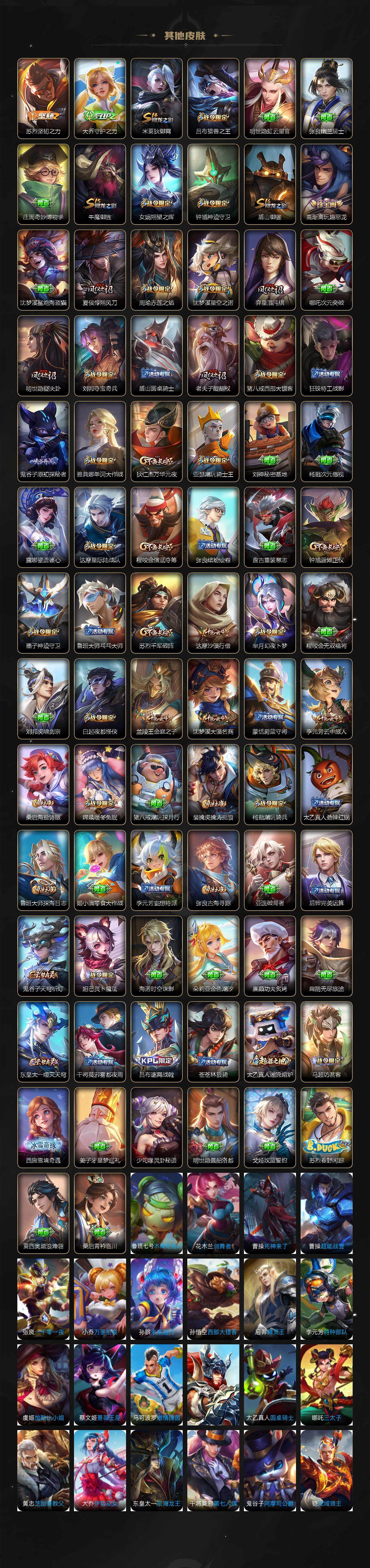 瑶遇见神鹿,李元芳逐浪之夏,公孙离无限星赏官,阿轲节奏热浪,诸葛亮黄金分割率,王昭君偶像歌手,吕布末日机甲,鲁班七号电玩小子,橘右京修罗,墨子龙骑士,嬴政摇滚巨星,白起星夜王子,安琪拉心灵骇客,安琪拉时之奇旅,程咬金功夫厨神,刘邦德古拉伯爵,兰陵王暗隐猎兽者,曹操幽灵船长,宫本武藏鬼剑武藏,亚瑟心灵战警,蔡文姬舞动绿茵,廉颇地狱岩魂,小乔缤纷独角兽,夏侯惇乘风破浪,铠曙光守护者,百里玄策原初追逐者,吕布圣诞狂欢,貂蝉圣诞恋歌,百里守约特工魅影,嬴政暗夜贵公子,嫦娥拒霜思,雅典娜黎明之约,李白千年之狐,夏洛特永昼,杨玉环银翎春语,刘禅电玩·爆裂旋风,蒙犽百解令,高渐离燃音魔法,伽罗琥珀纪元,桑启奇遇星旅,赵怀真器灵·浮梦炉