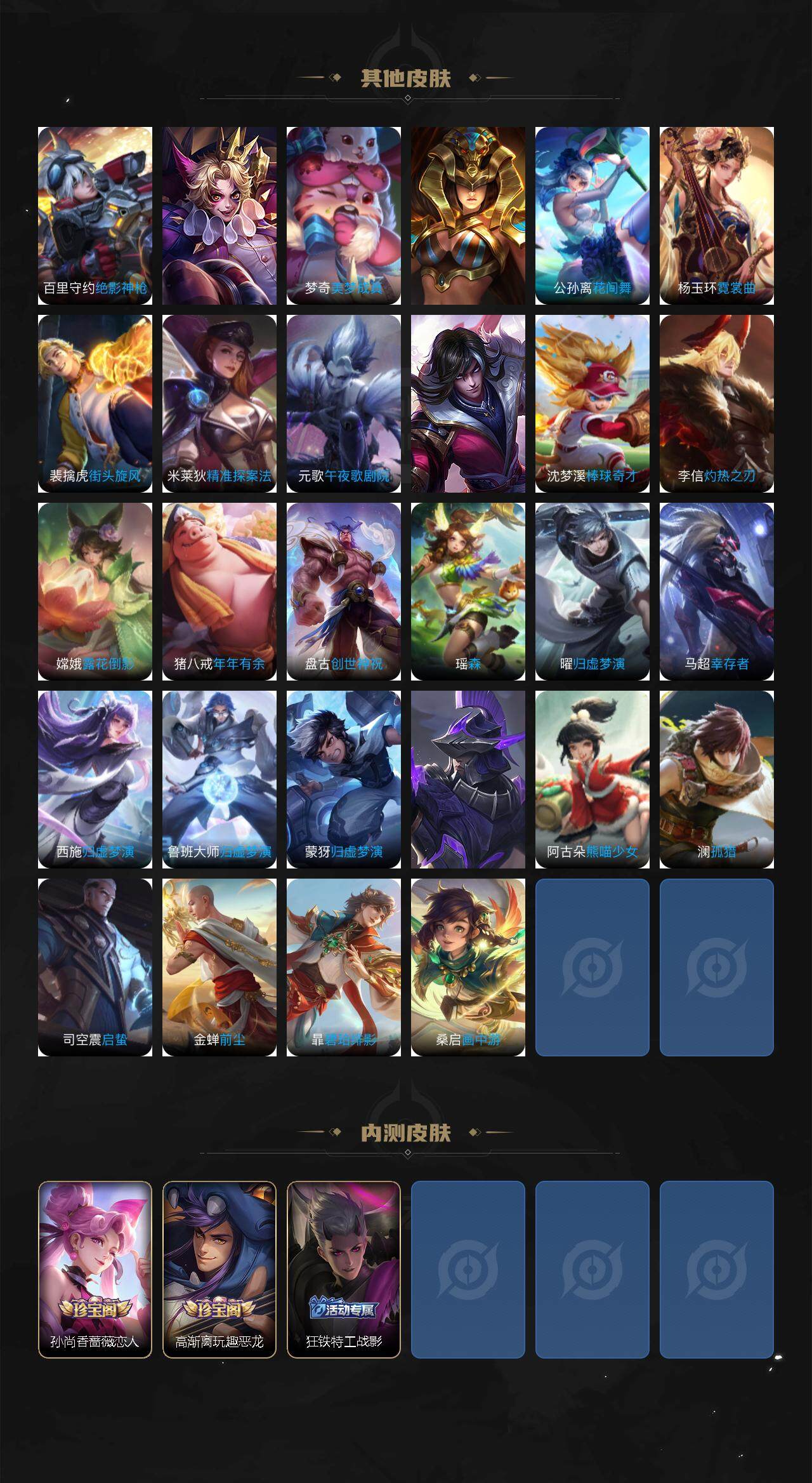 芈月重明,狂铁御狮,米莱狄御霄,牛魔御旌,盾山御銮,夏侯惇朔风刀,明世隐疑决卦,老夫子醍醐杖,鬼谷子原初探秘者,狄仁杰万华元夜,程咬金演武夺筹,钟馗驱傩正仪,苏烈千军破阵,吕布猎兽之王,嬴政白昼王子,女娲朔望之晖,典韦蓝屏警告,钟馗神迹守卫,鲁班七号狮舞东方,沈梦溪星空之诺,李元芳银河之约,刘邦夺宝奇兵,马可波罗暗影游猎,蒙犽狂想玩偶喵,元歌云间偶戏,弈星混沌棋,达摩沙漠行僧,兰陵王金庭之子,沈梦溪大漠名商,李元芳云中旅人,桑启海盐诗旅,裴擒虎擒涛扼浪,鲁班大师探海日志,张良古海寻踪
