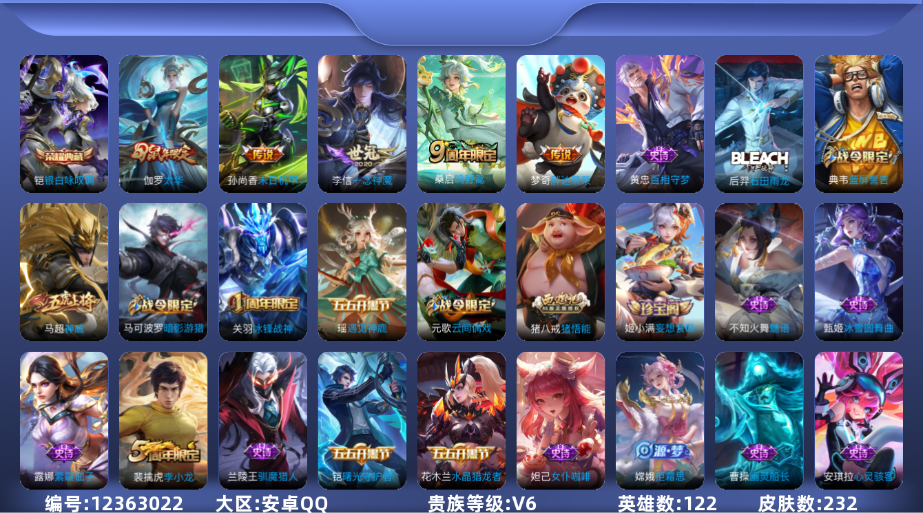 [12363022]【商品标题】:安卓Q-V6-最强王者段位-122英雄-232皮肤-1典藏-0珍品无双-0无双-0珍品传说-5传说-58史诗