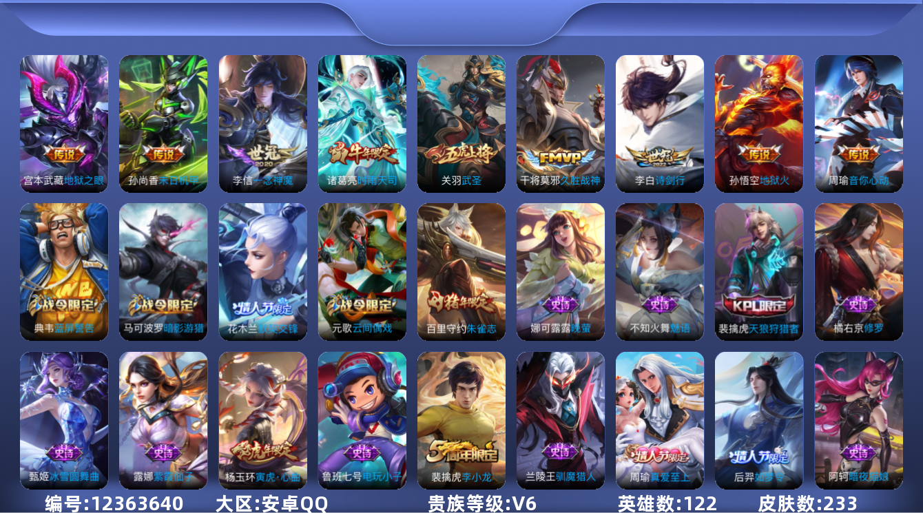 [12363640]【商品标题】:安卓Q-V6-荣耀黄金II段位-122英雄-233皮肤-0典藏-0珍品无双-0无双-0珍品传说-9传说-70史诗